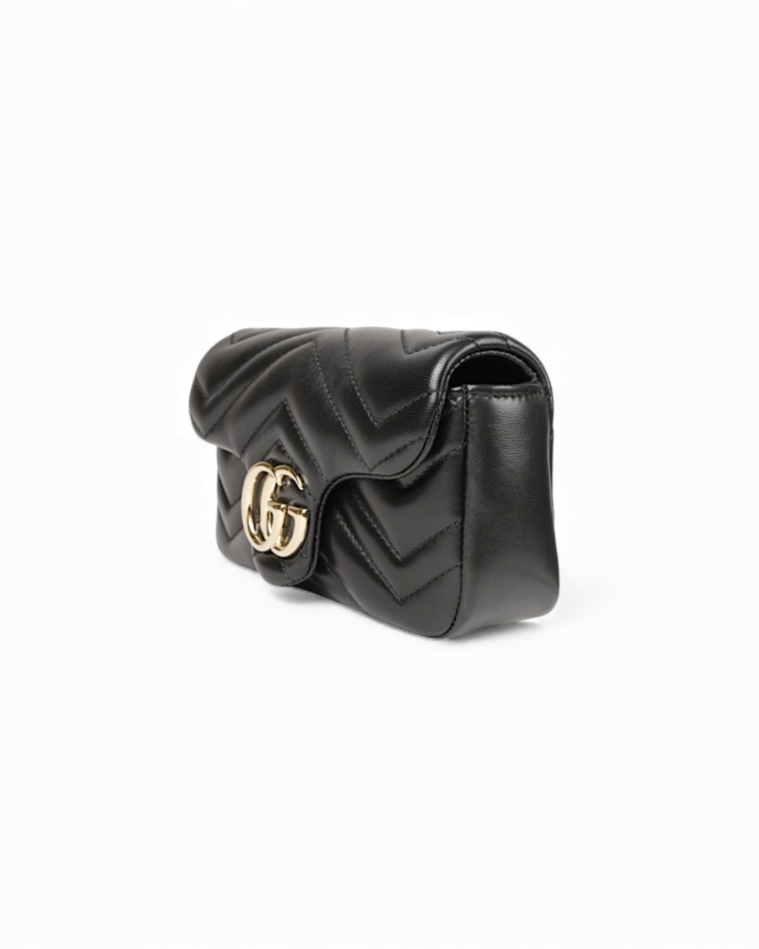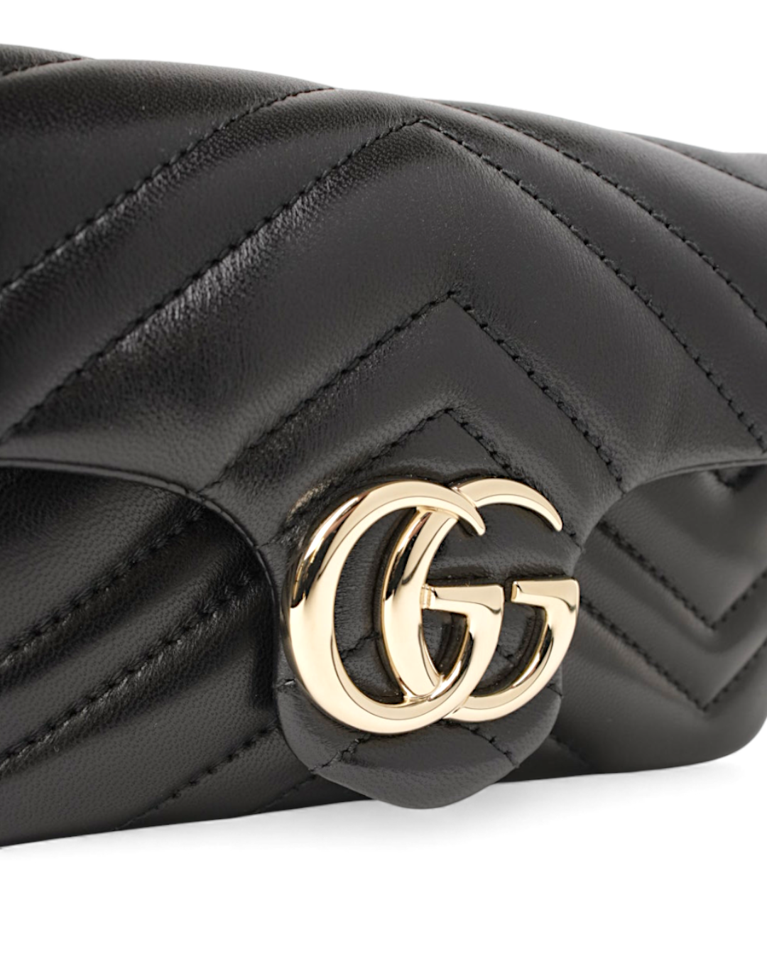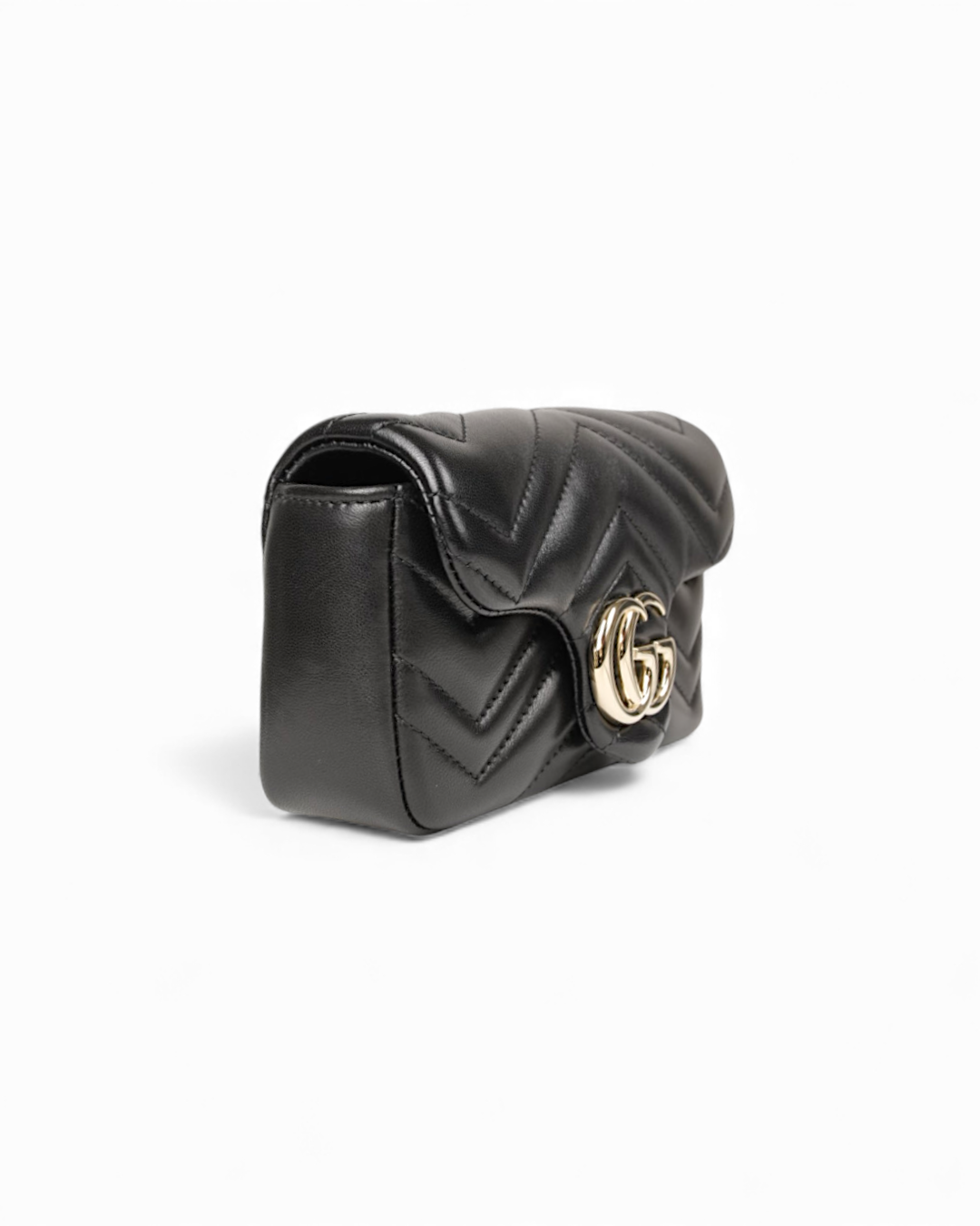 Borsa firmata Gucci, linea Marmont, misura 16, realizzata in pelle puff nera con cuciture Matelassè e hardware palladio. Dotata di una patta con classico logo del brand “GG” in metallo e chiusura calamitata, internamente rivestita tessuto bordeaux, la borsa è capiente per l’essenziale. Munita di una tracolla rimovibile in catena, per una comoda portata a spalla o a mano come pochette. L’articolo si presenta in condizioni pari al nuovo.
