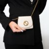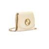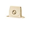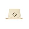 Borsa firmata Gucci, modello Blondie nella misura mini, realizzata in pelle liscia bianca con hardware dorati. Dotata di una patta frontale con classico logo “GG” in metallo oro e di una chiusura a clip, internamente rivestito in pelle e nylon e molteplici tasche con e senza zip per documenti e banconote, capiente per l’essenziale. Munita di una tracolla rimovibile in catena dorata, per una portata a spalla. L’articolo si presenta in condizioni pari al nuovo.