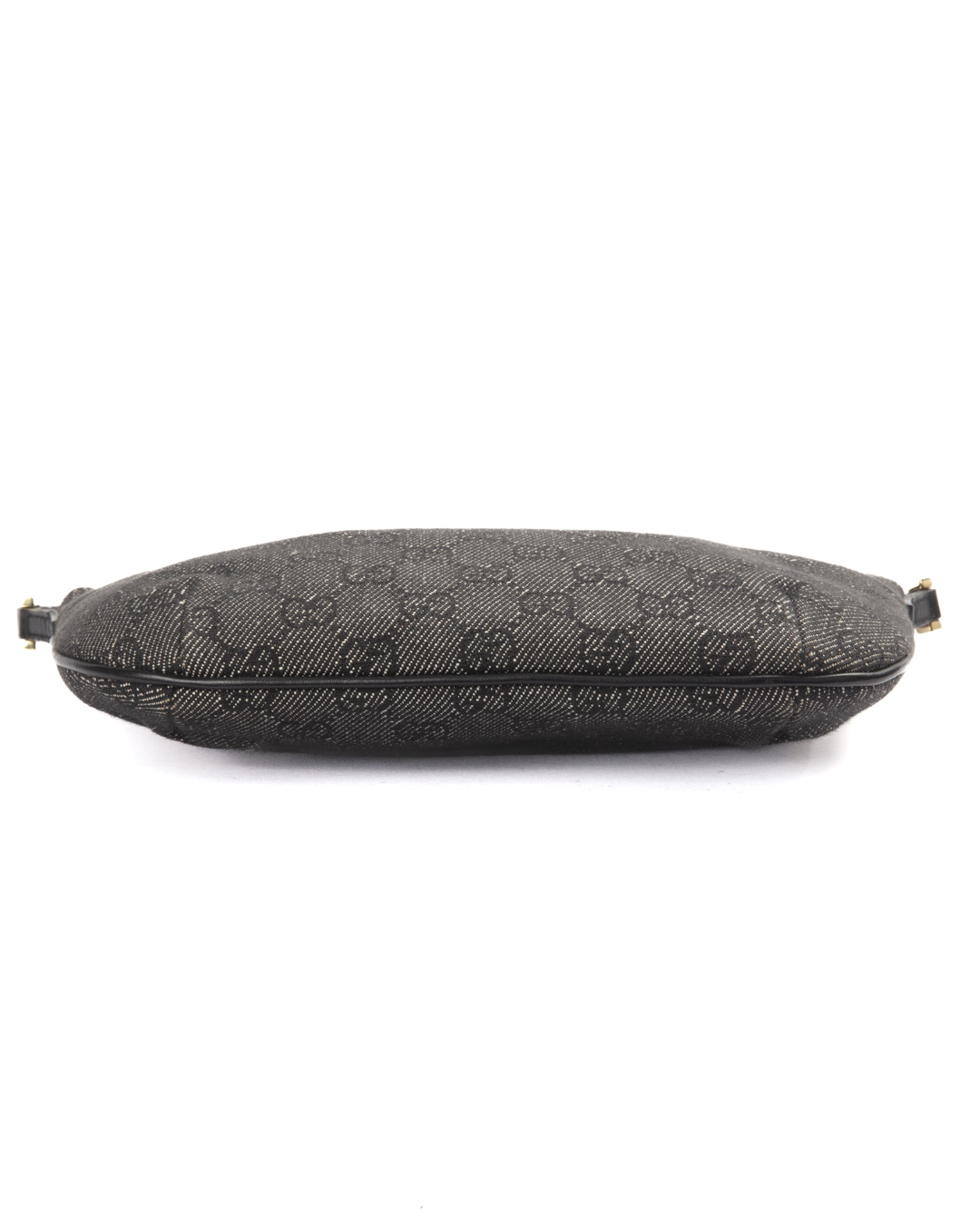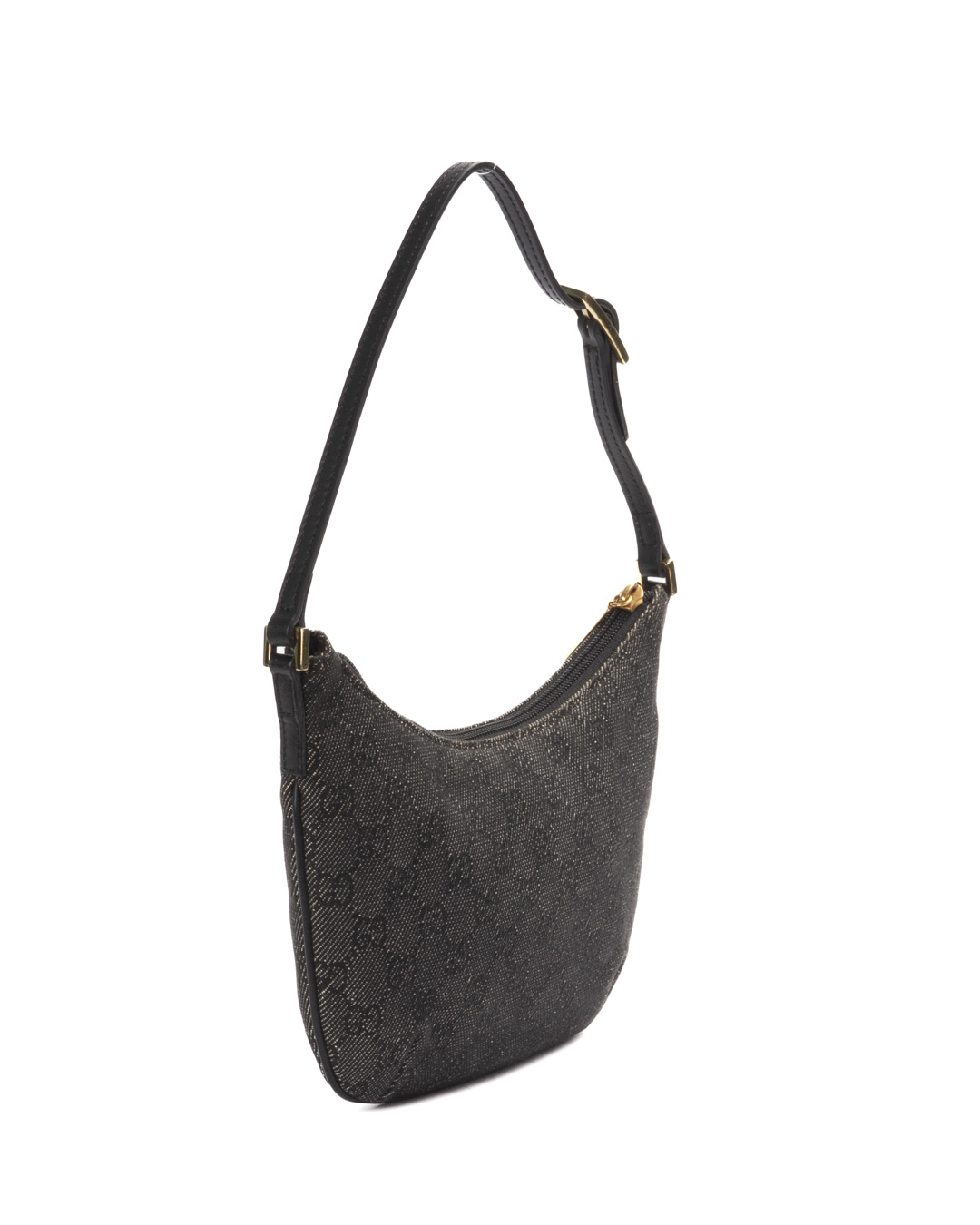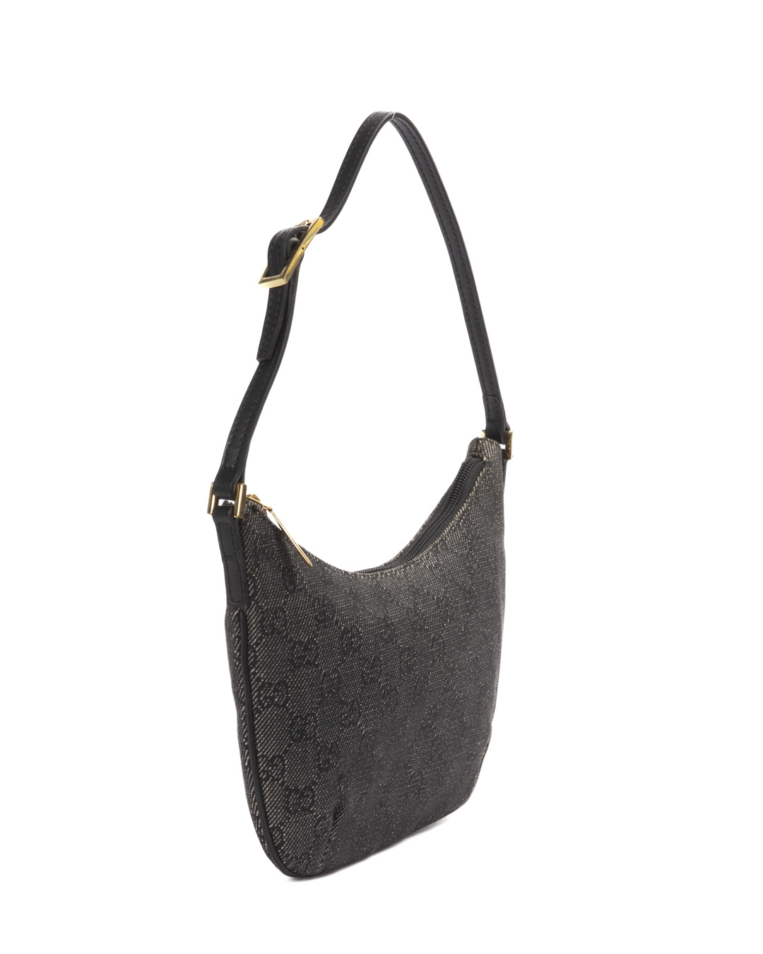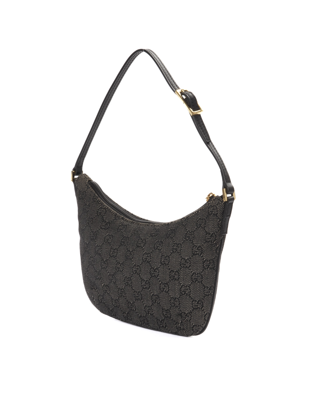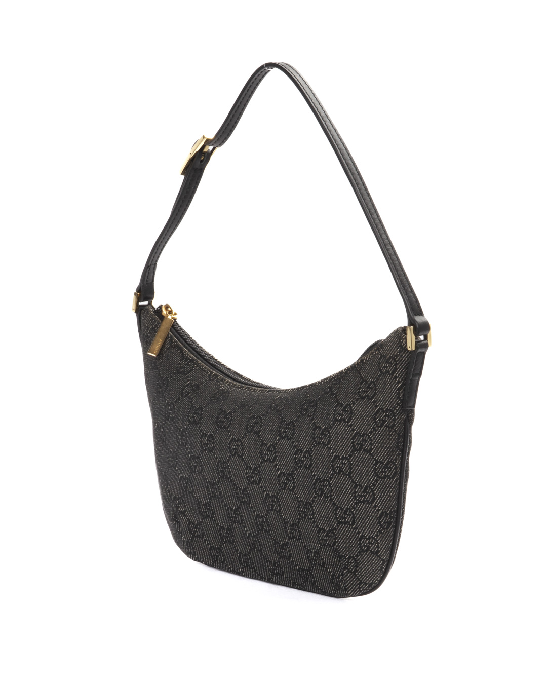 Borsa firmata Gucci, modello hobo, realizzata in denim nera nella classica fantasia GG Supreme con inserti in pelle e hardware dorato. Dotato di una chiusura superiore a zip, internamente rivestito in tela tono su tono, la borsa è capiente per l’essenziale. Munito di un manico in pelle, per una comoda portata a spalla o a mano. L’articolo si presenta in ottime condizioni.