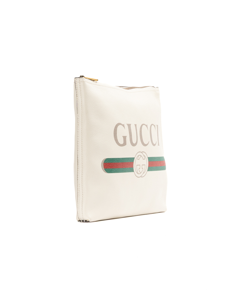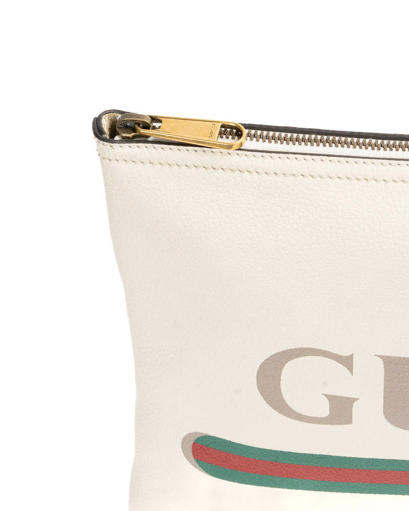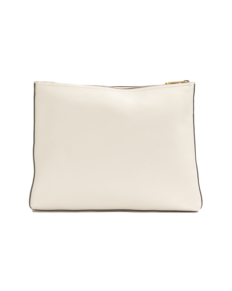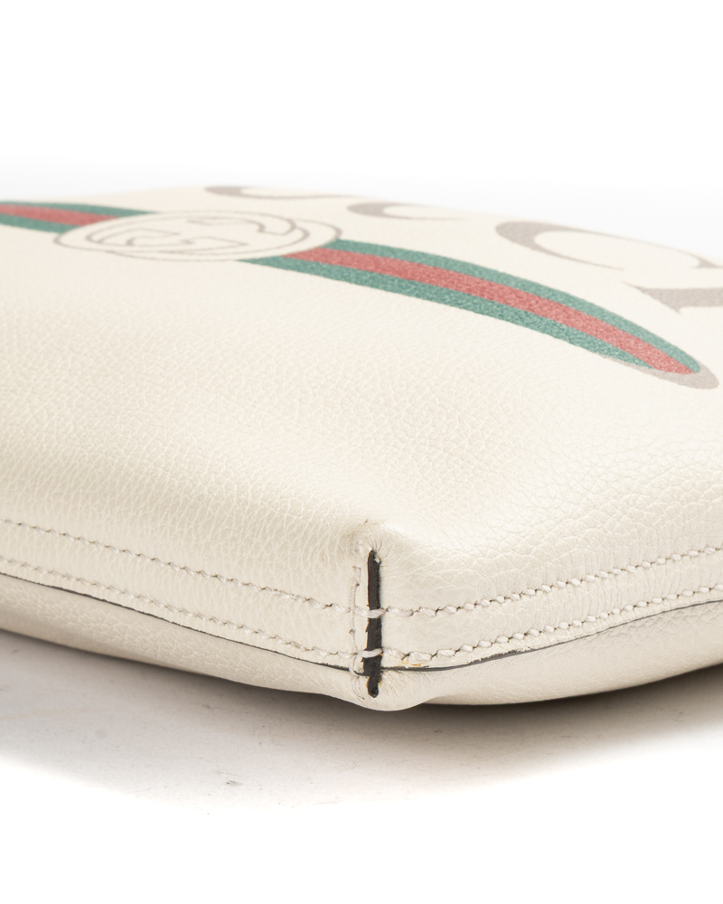 Pochette firmata Gucci, misura medium, realizzata in pelle bianca arricchita dal classico logo del brand sulla parte frontale. Dotata di una chiusura superiore a zip, internamente rivestita in tessuto scamosciato beige, la pochette è abbastanza capiente. L’articolo si presenta in ottime condizioni.