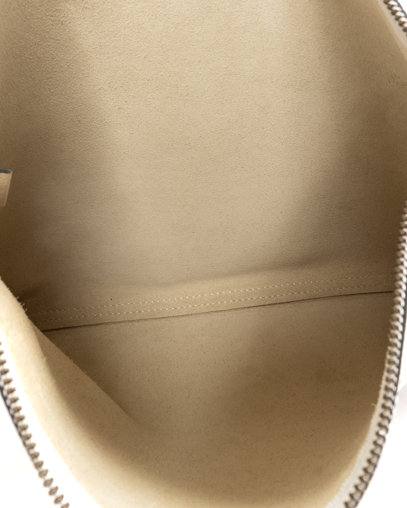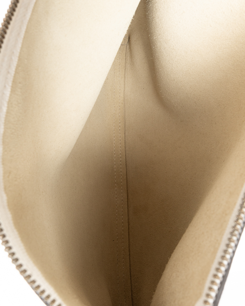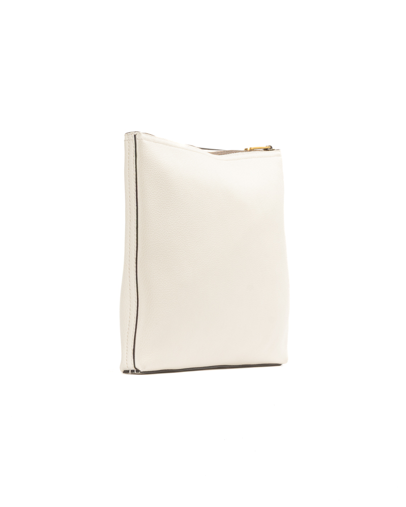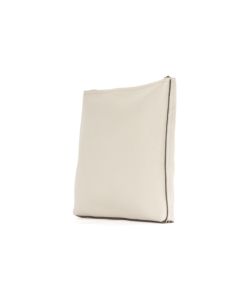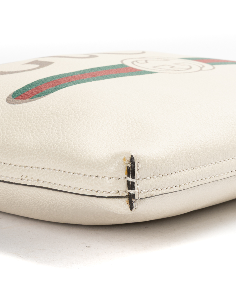 Pochette firmata Gucci, misura medium, realizzata in pelle bianca arricchita dal classico logo del brand sulla parte frontale. Dotata di una chiusura superiore a zip, internamente rivestita in tessuto scamosciato beige, la pochette è abbastanza capiente. L’articolo si presenta in ottime condizioni.