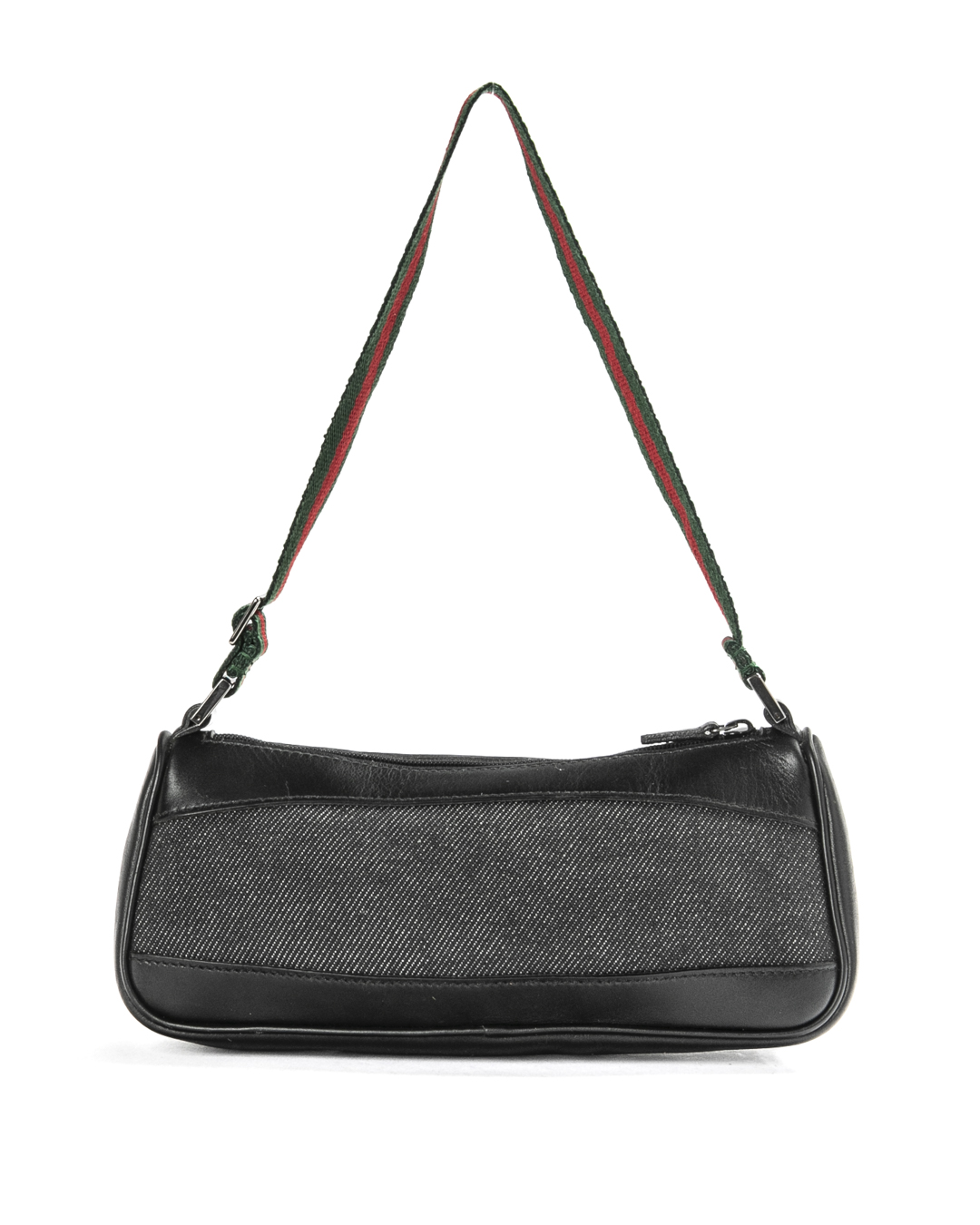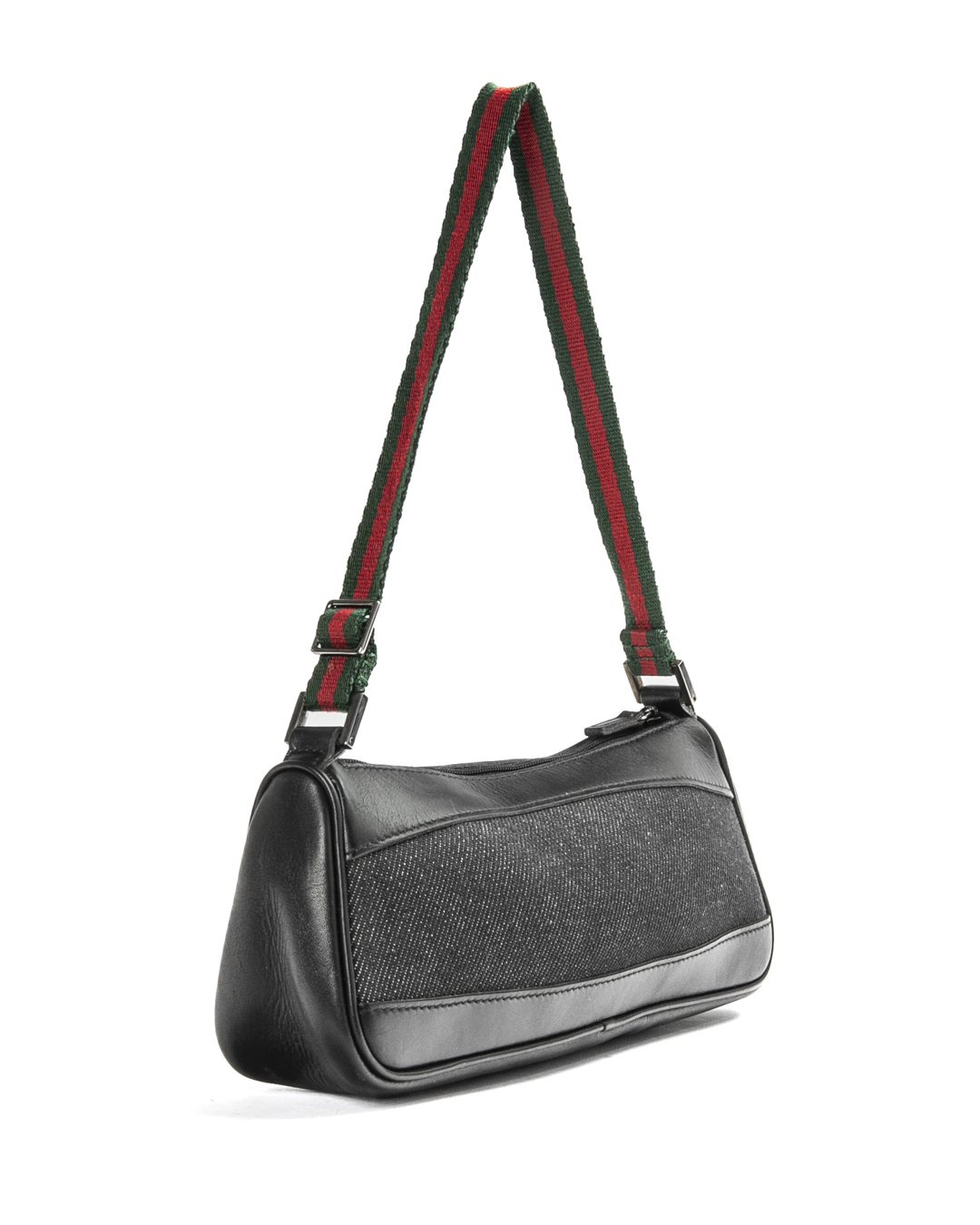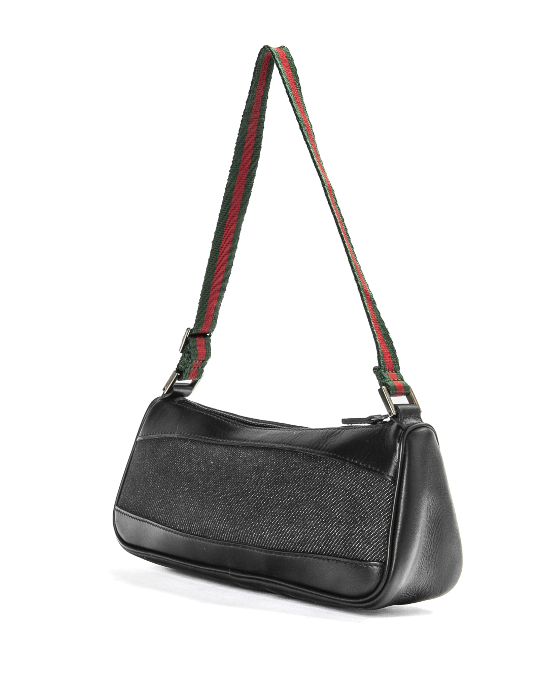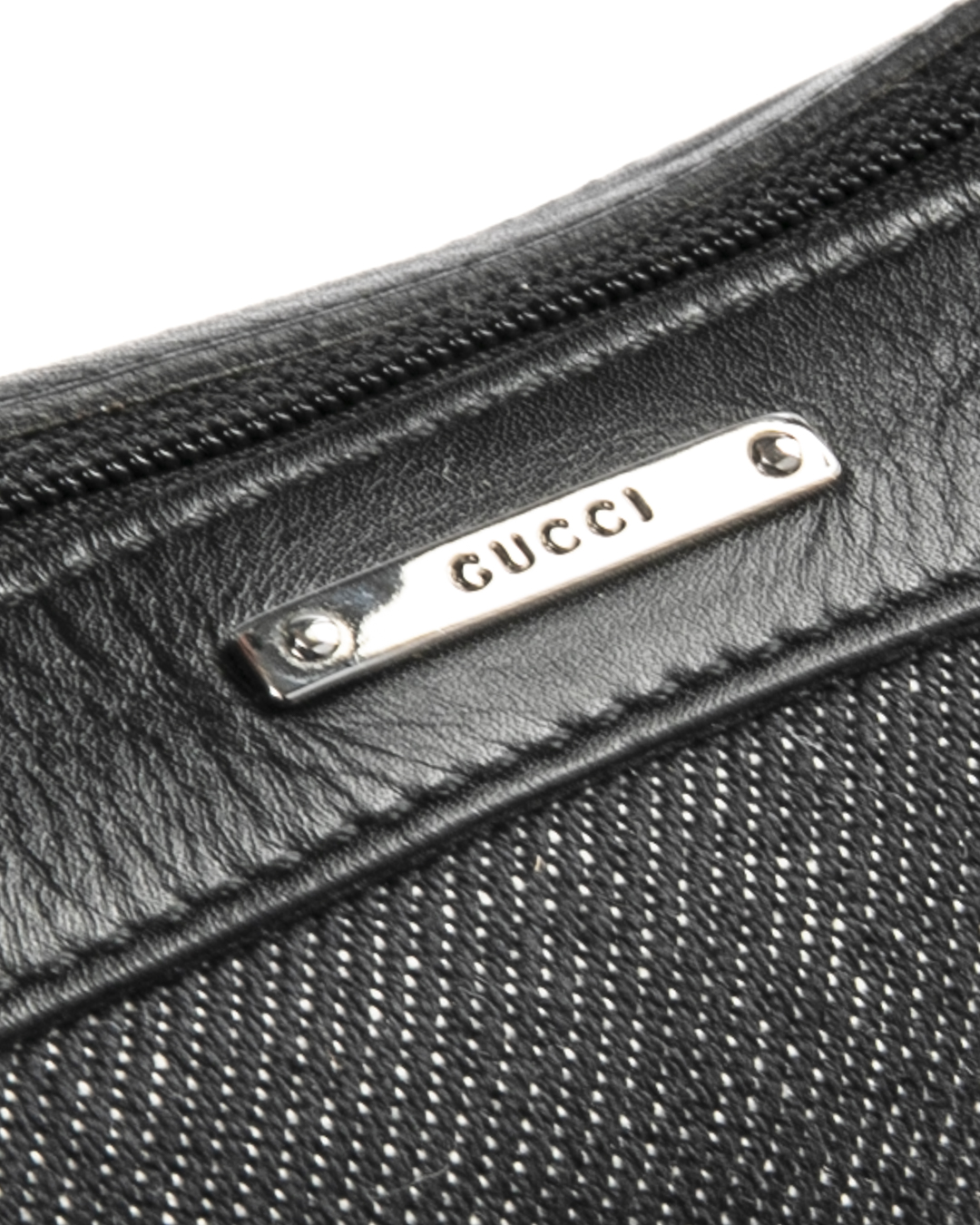 Pochette firmata Gucci, misura mini, realizzata in denim nero con rifiniture in pelle e hardware argento. Dotata di una chiusura superiore a zip, internamente rivestita in tessuto nella fantasia GG Supreme, la pochette è capiente per l'essenziale. Munita di un manico in tessuto nella classica fascia web, per una comoda portata a spalla o a mano. L'articolo si presenta in buone condizioni.