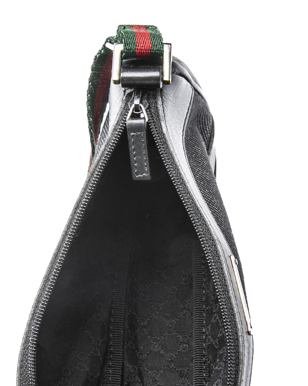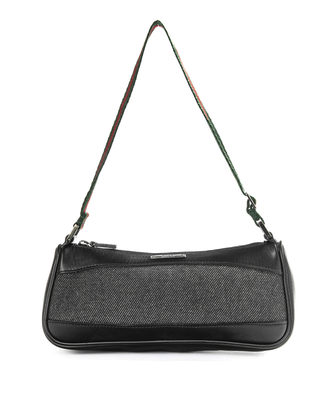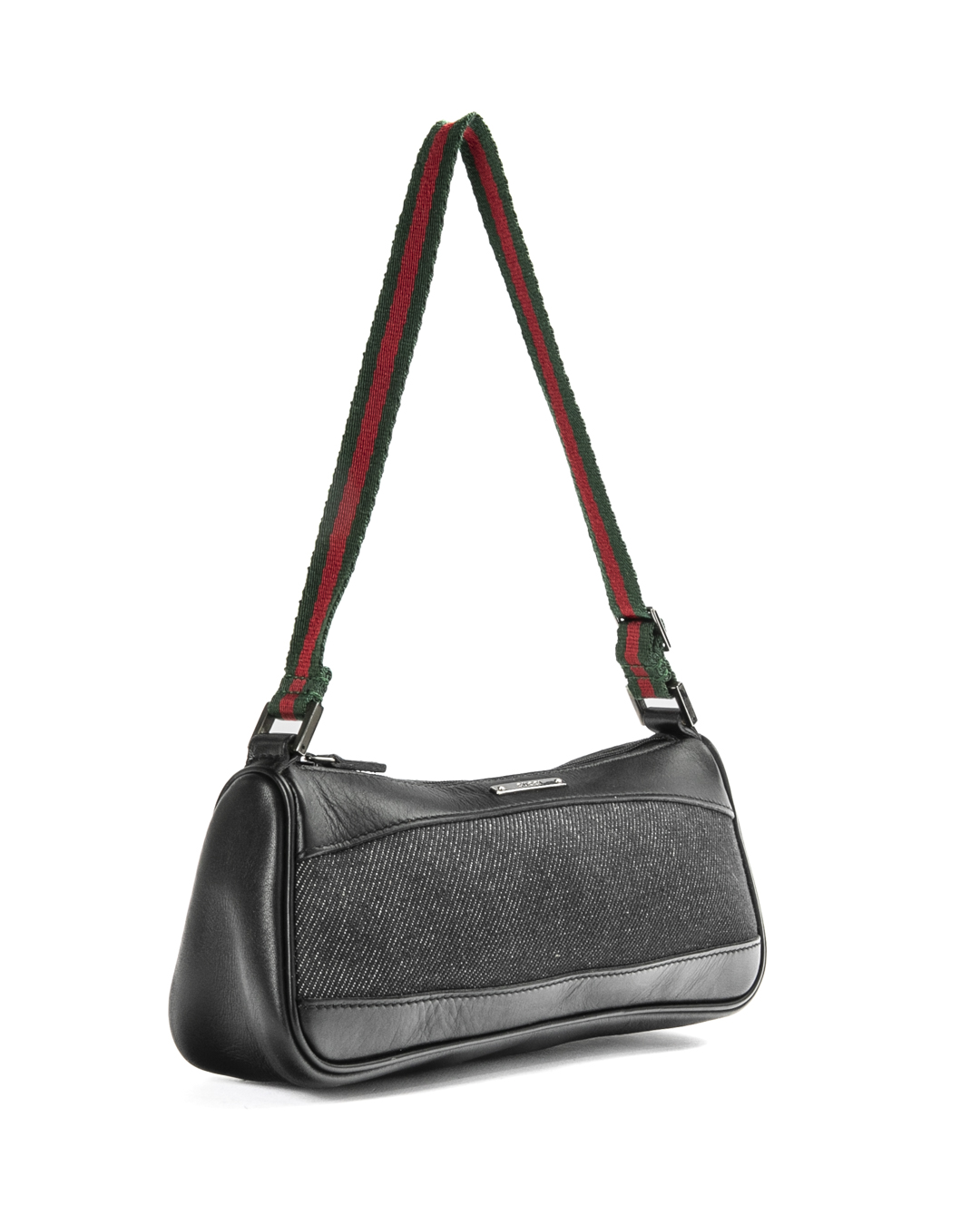 Pochette firmata Gucci, misura mini, realizzata in denim nero con rifiniture in pelle e hardware argento. Dotata di una chiusura superiore a zip, internamente rivestita in tessuto nella fantasia GG Supreme, la pochette è capiente per l'essenziale. Munita di un manico in tessuto nella classica fascia web, per una comoda portata a spalla o a mano. L'articolo si presenta in buone condizioni.