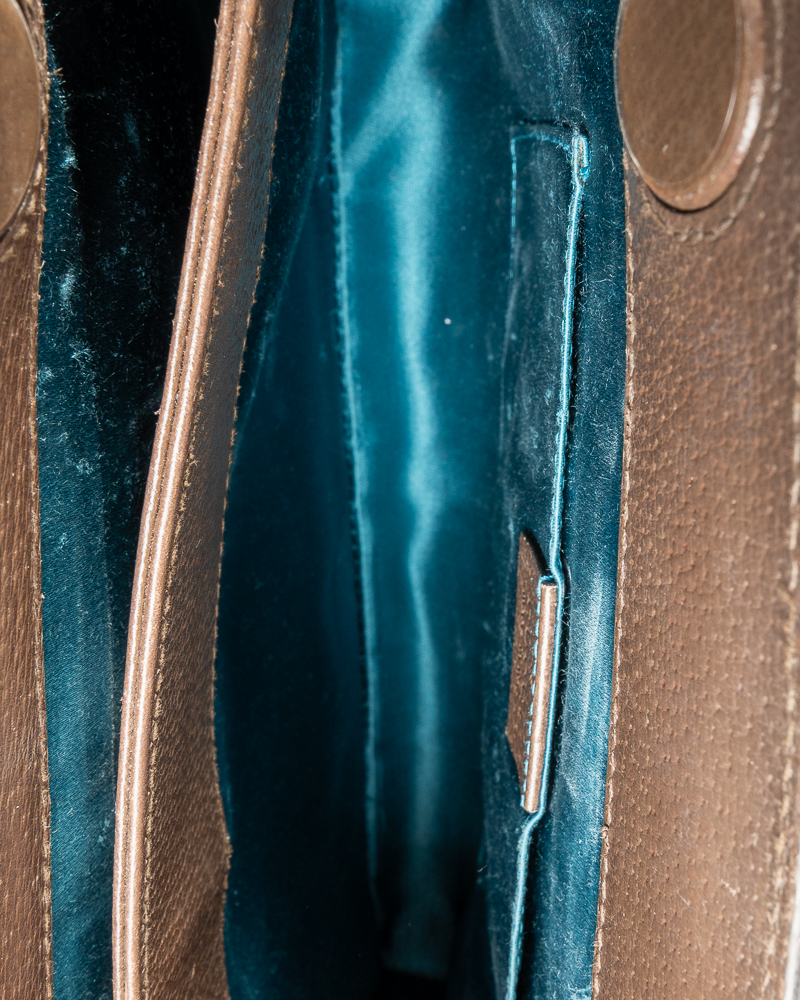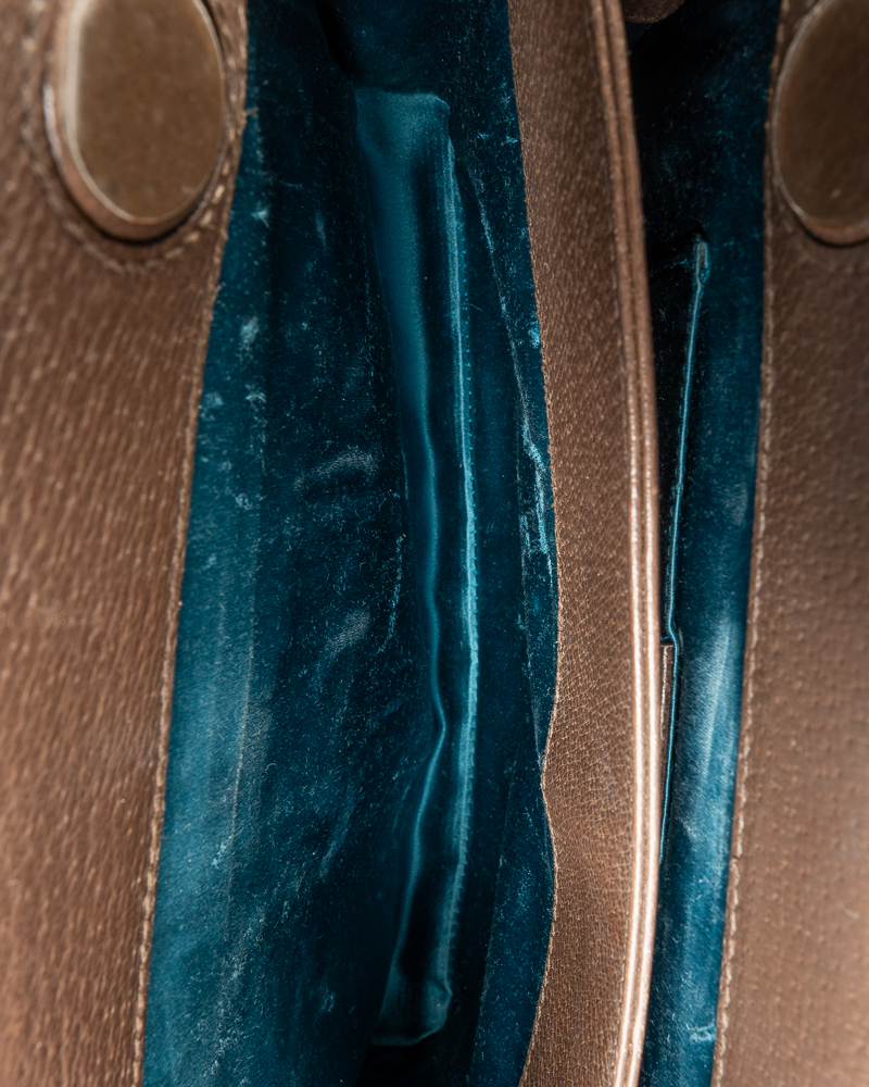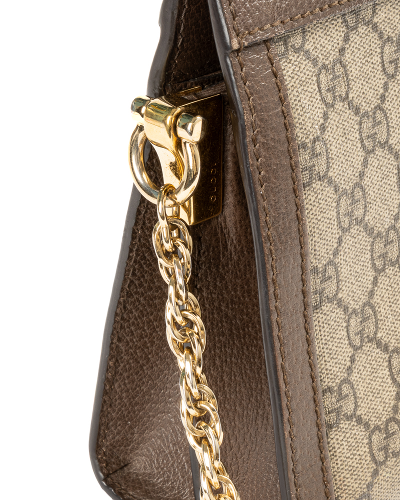 Borsa firmata Gucci, linea Ophidia nella misura small, realizzata in tela nella classica fantasia GG Supreme con inserti in pelle marrone e hardware dorato. Dotata di una chiusura magnetica, internamente rivestita in raso turchese, la borsa è abbastanza capiente. Munita di una tracolla in catena dorata, per una comoda portata a spalla o a tracolla. L’articolo si presenta in buone condizioni, con segni di usura visibili in foto.