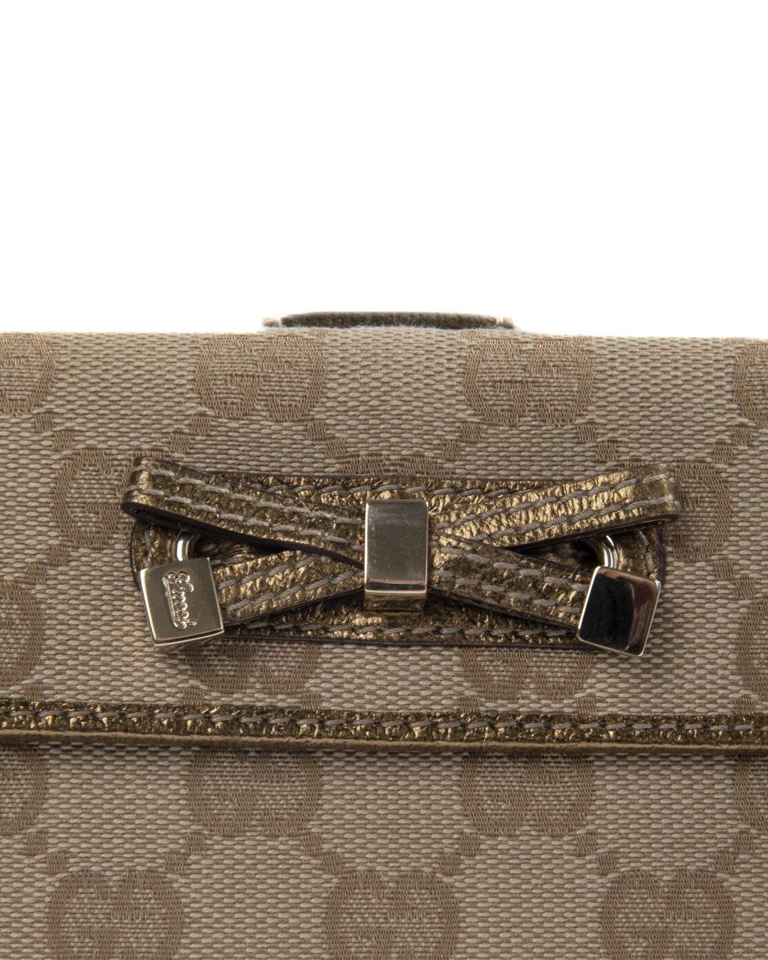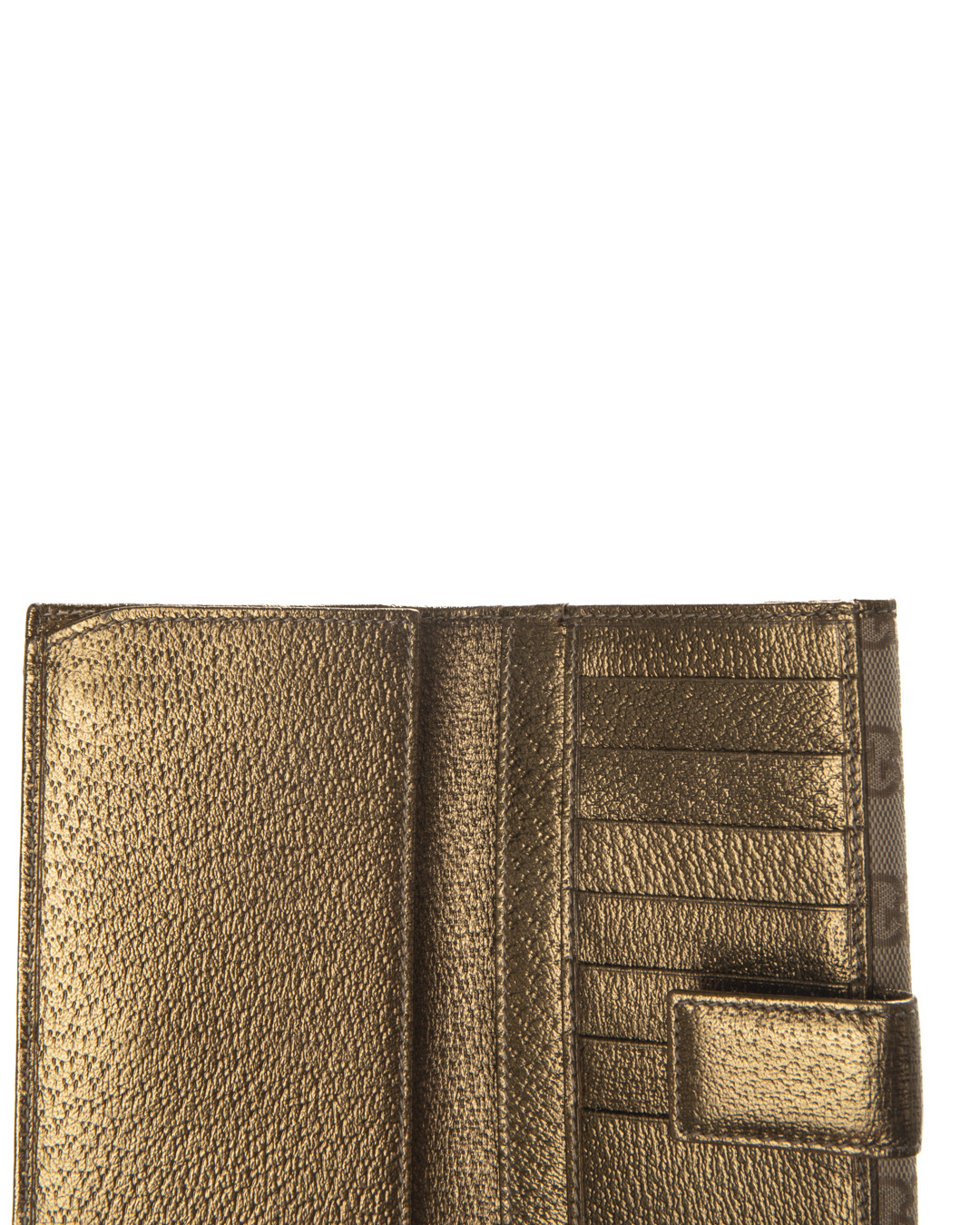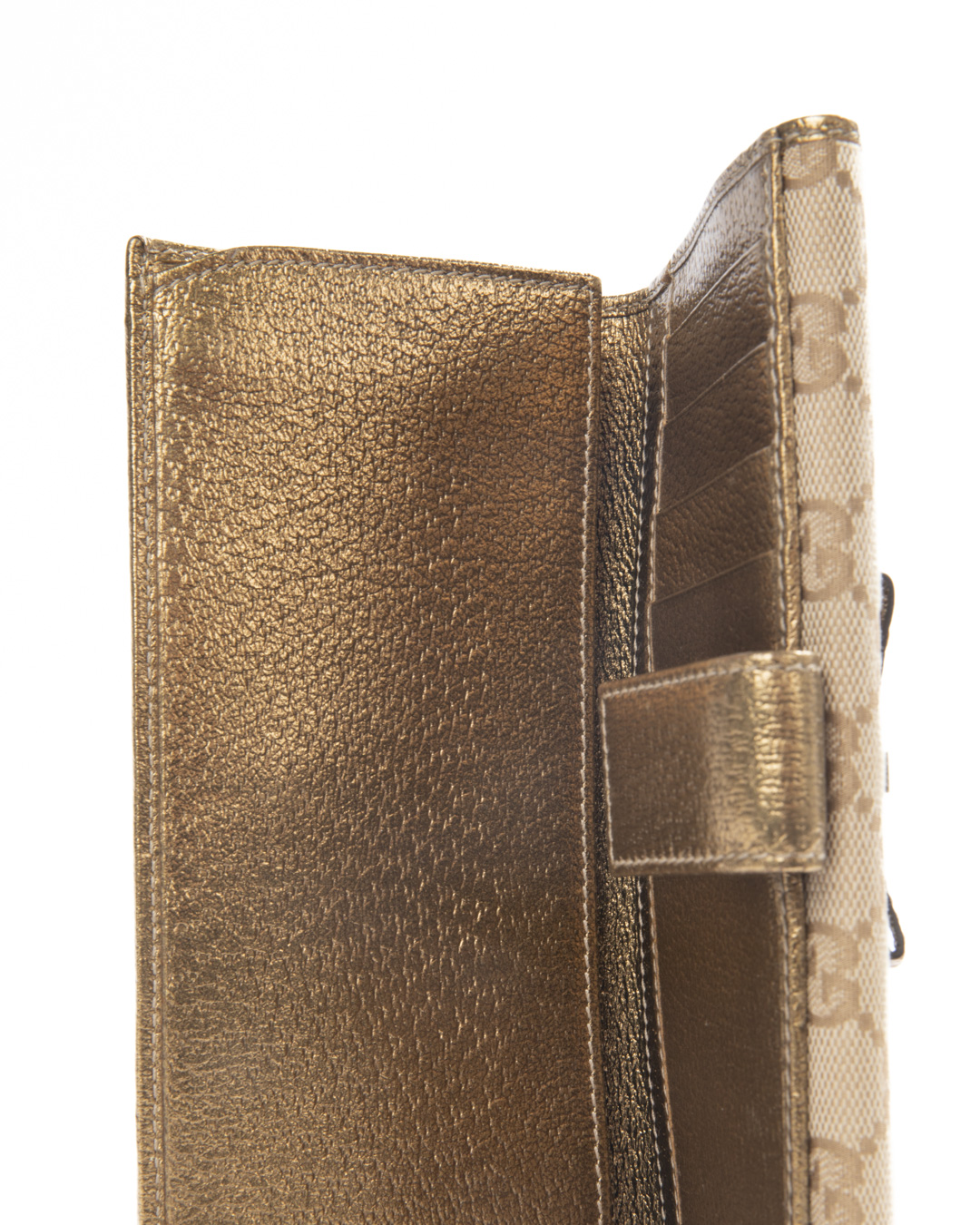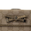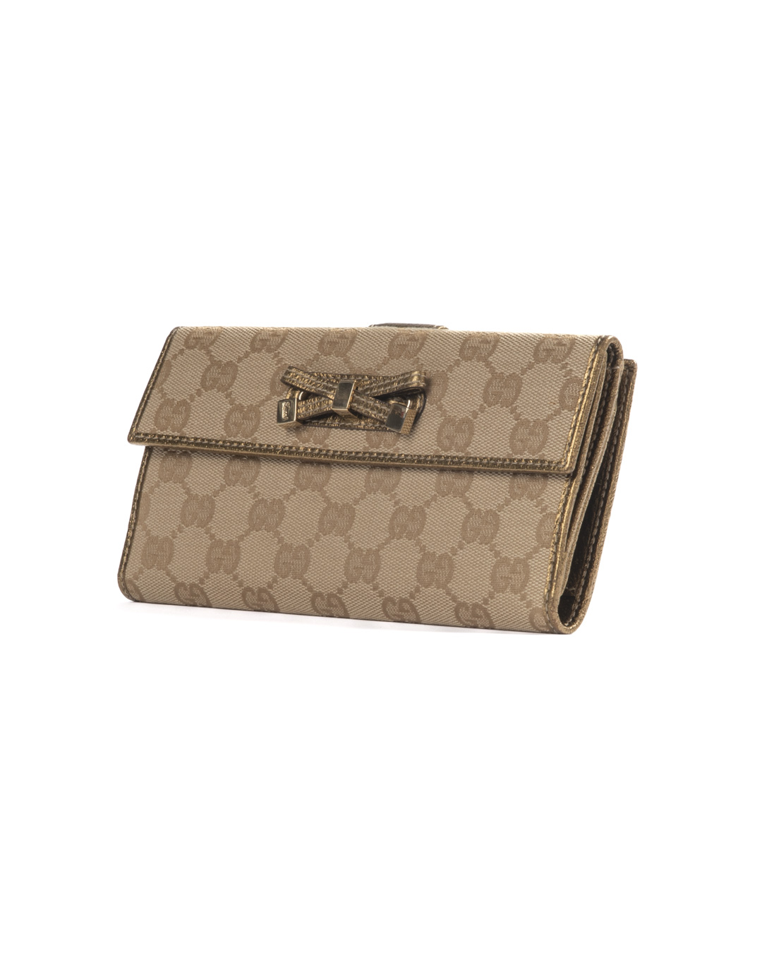 Portafoglio firmato Gucci, realizzato in tela nella classica fantasia GG Supreme con inserti in pelle e hardware dorato. Dotato di una doppia chiusura a clip, internamente rivestito in pelle con molteplici tasche, il portafoglio è abbastanza capiente. Arricchito da un fiocco sulla parte frontale. L’articolo si presenta in buone condizioni.