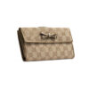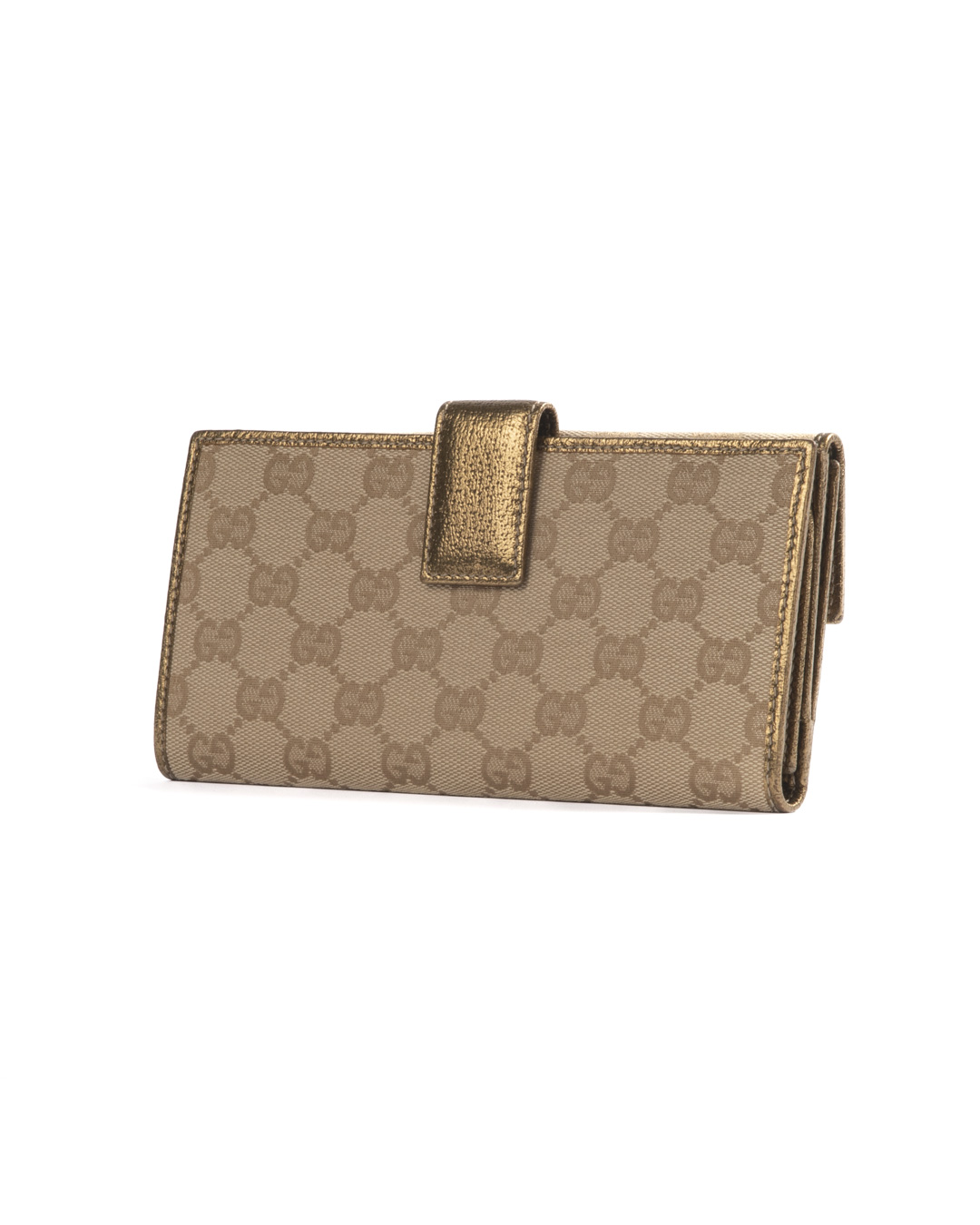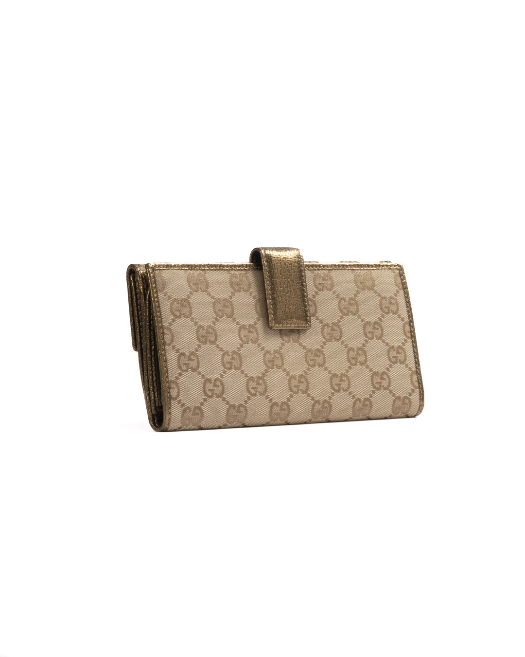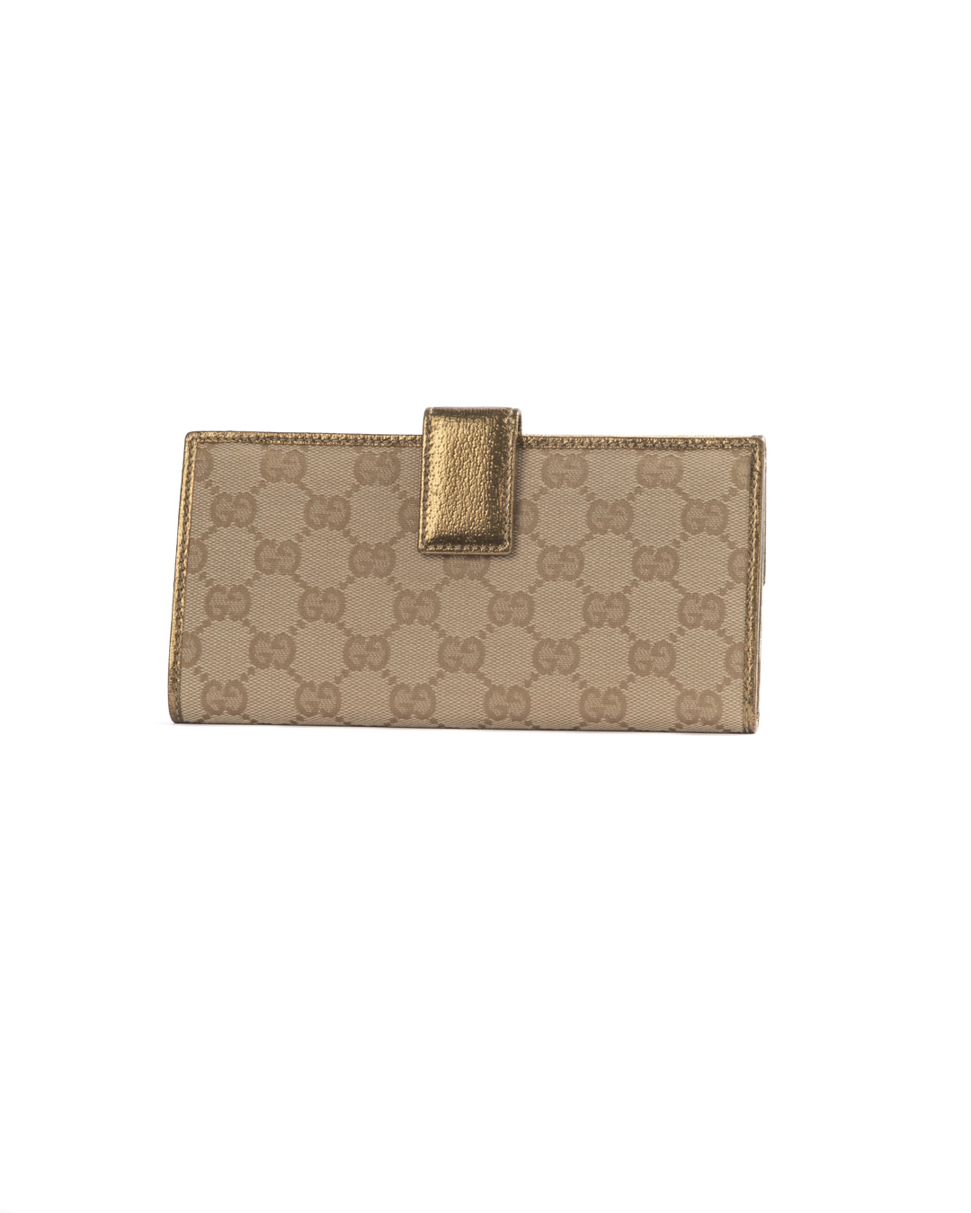 Portafoglio firmato Gucci, realizzato in tela nella classica fantasia GG Supreme con inserti in pelle e hardware dorato. Dotato di una doppia chiusura a clip, internamente rivestito in pelle con molteplici tasche, il portafoglio è abbastanza capiente. Arricchito da un fiocco sulla parte frontale. L’articolo si presenta in buone condizioni.