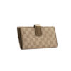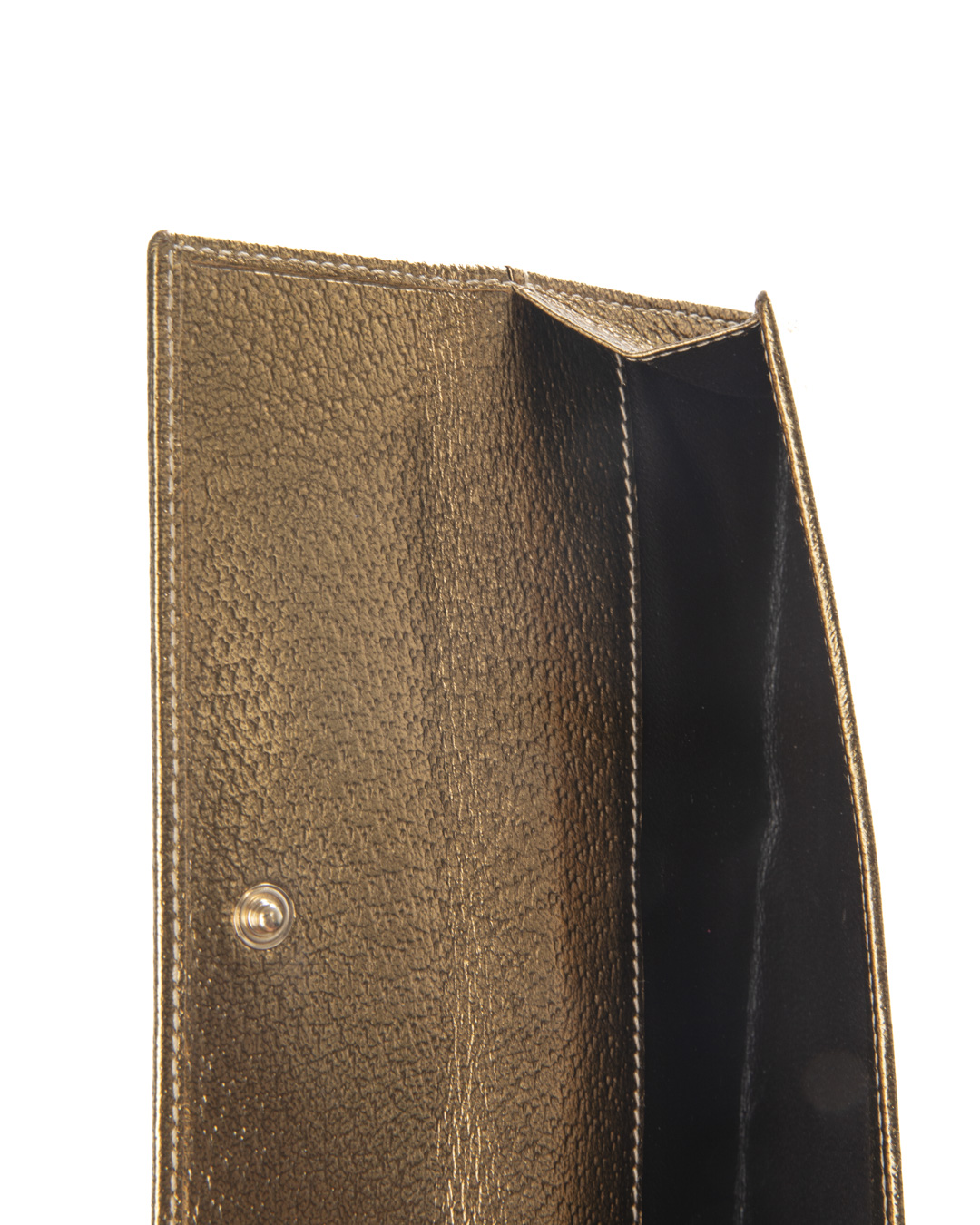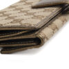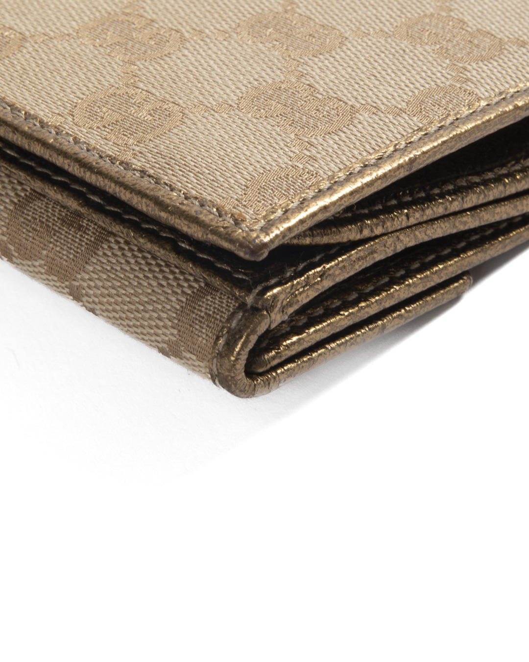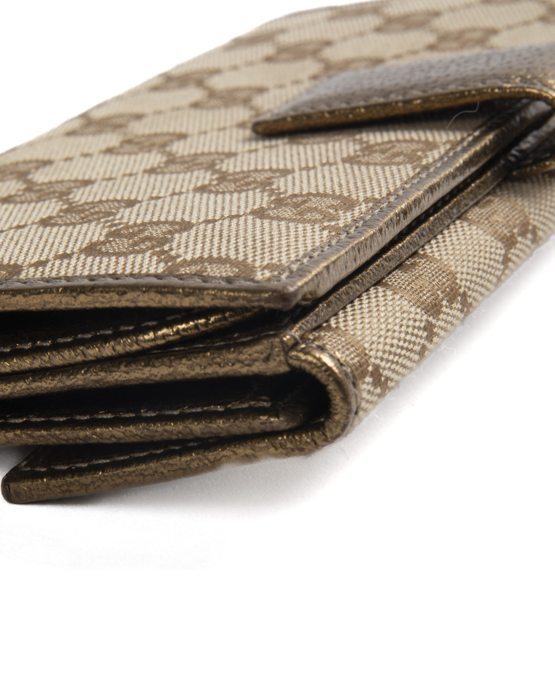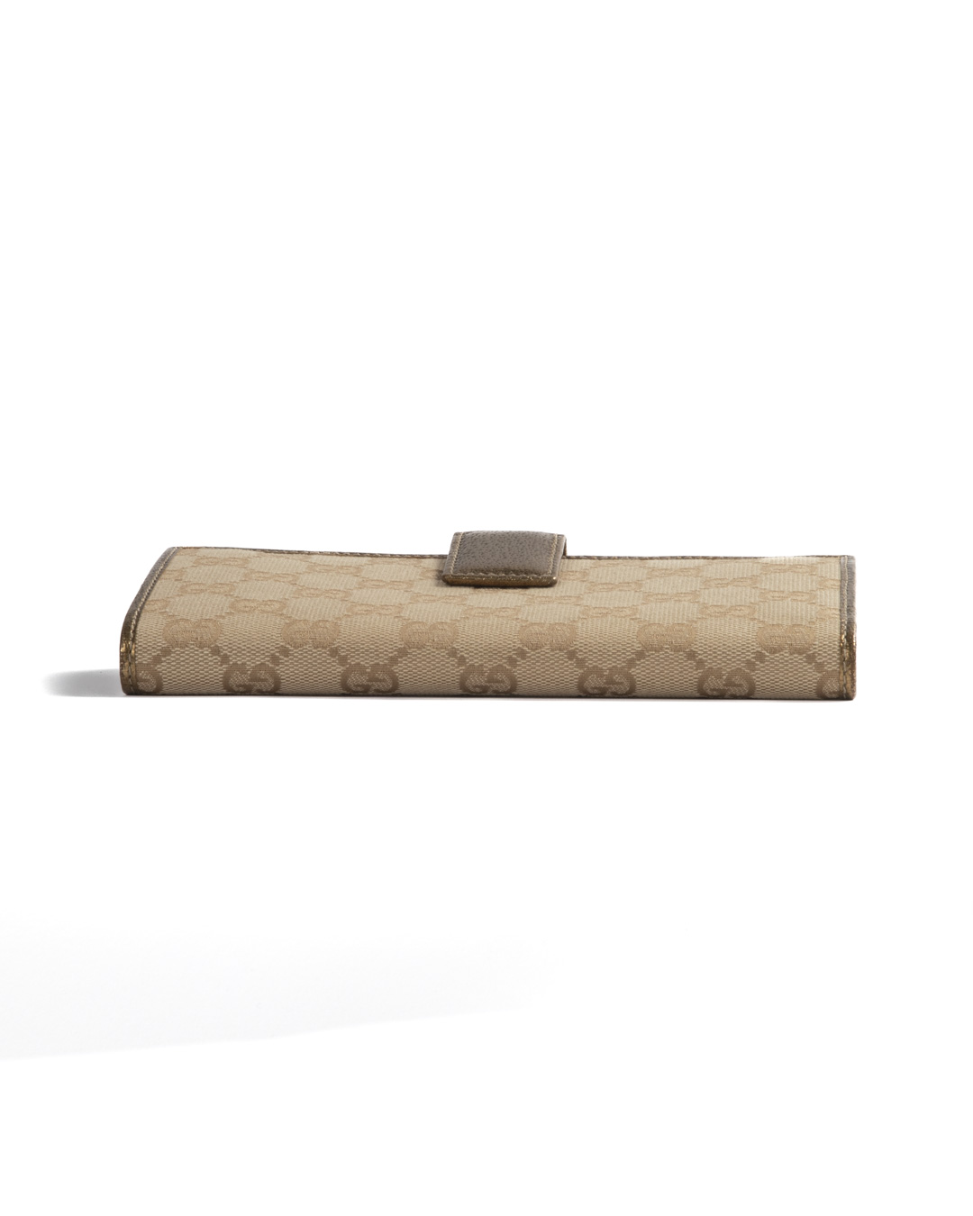 Portafoglio firmato Gucci, realizzato in tela nella classica fantasia GG Supreme con inserti in pelle e hardware dorato. Dotato di una doppia chiusura a clip, internamente rivestito in pelle con molteplici tasche, il portafoglio è abbastanza capiente. Arricchito da un fiocco sulla parte frontale. L’articolo si presenta in buone condizioni.