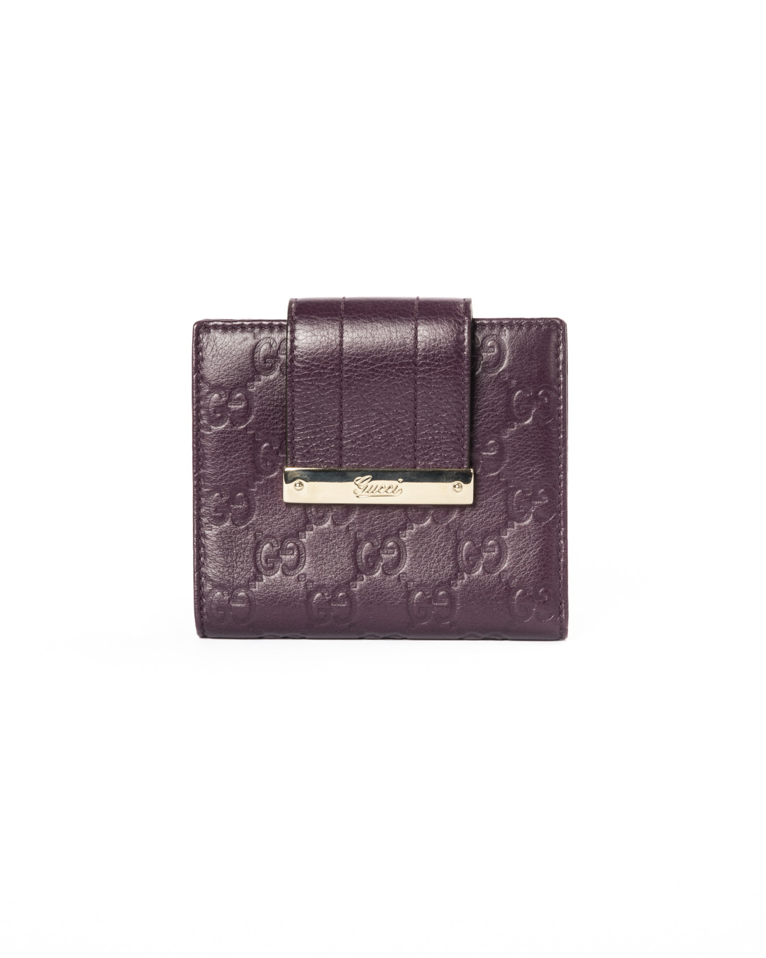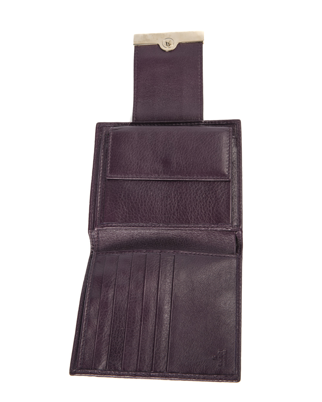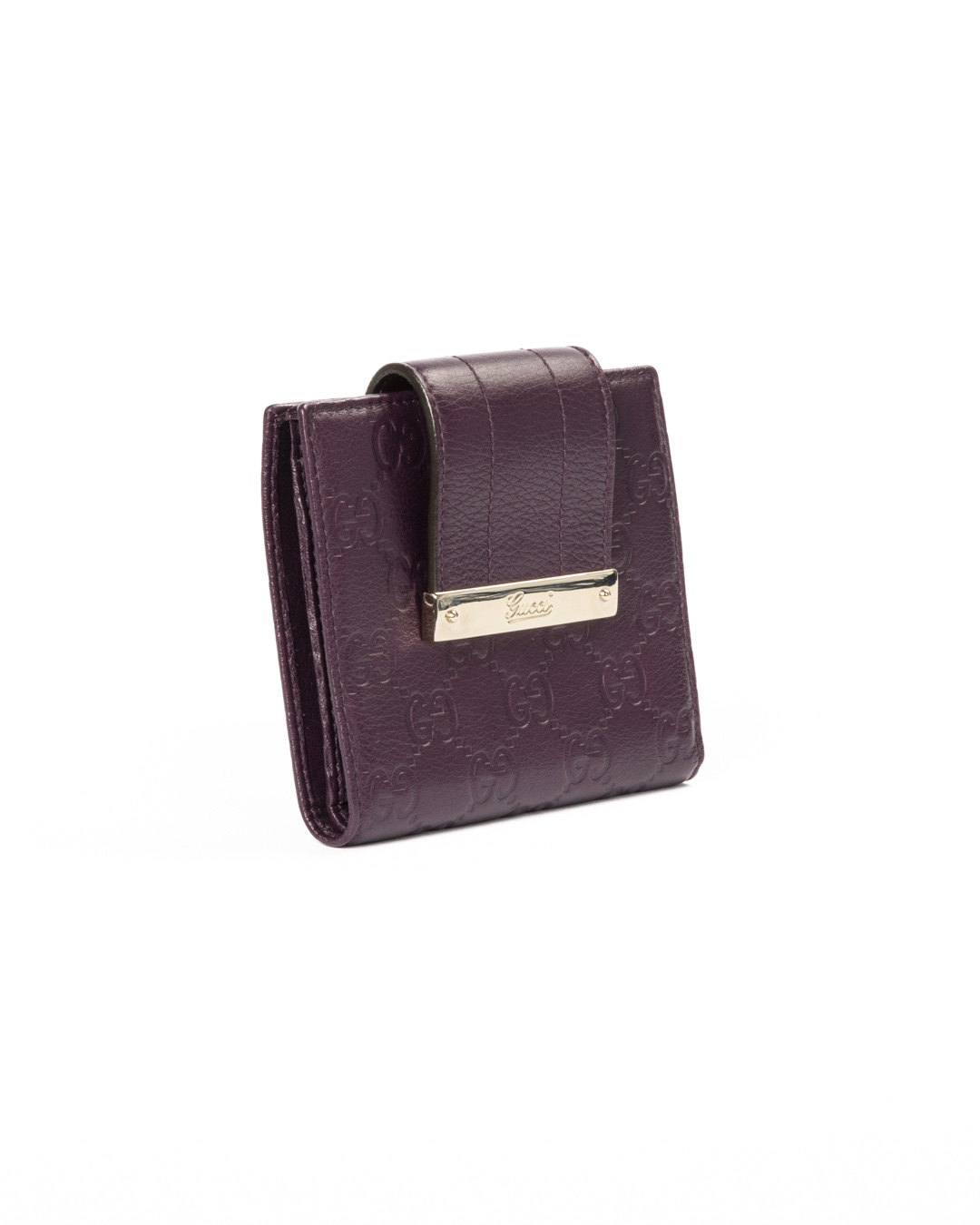 Portafoglio firmato Gucci, linea Guccissima, realizzato in pelle viola con la classica fantasia GG e hardware dorato. Dotato di una chiusura a clip, internamente rivestito in pelle liscia tono su tono con molteplici tasche comodo per documenti e banconote, il portafoglio è abbastanza capiente. L’articolo si presenta in ottime condizioni.