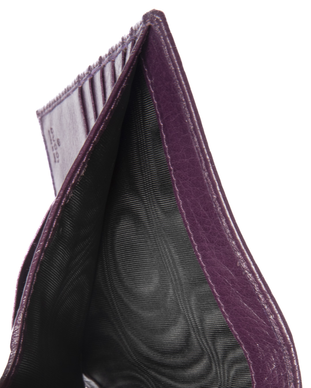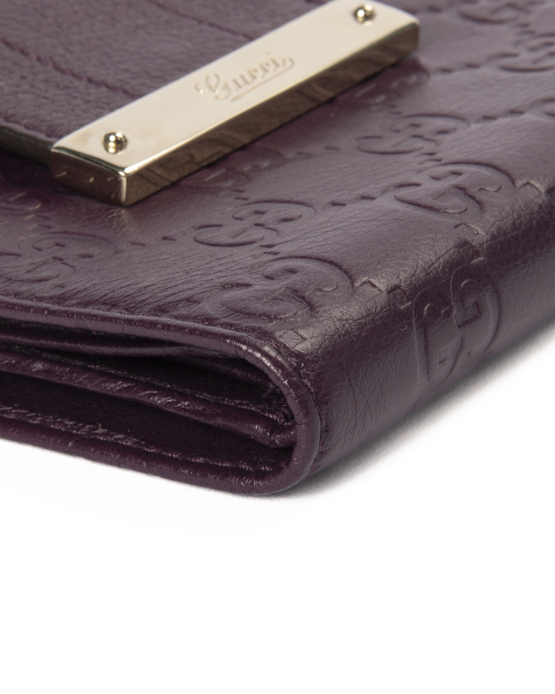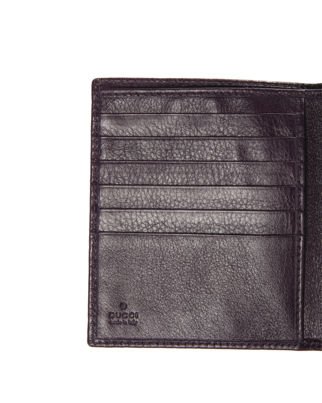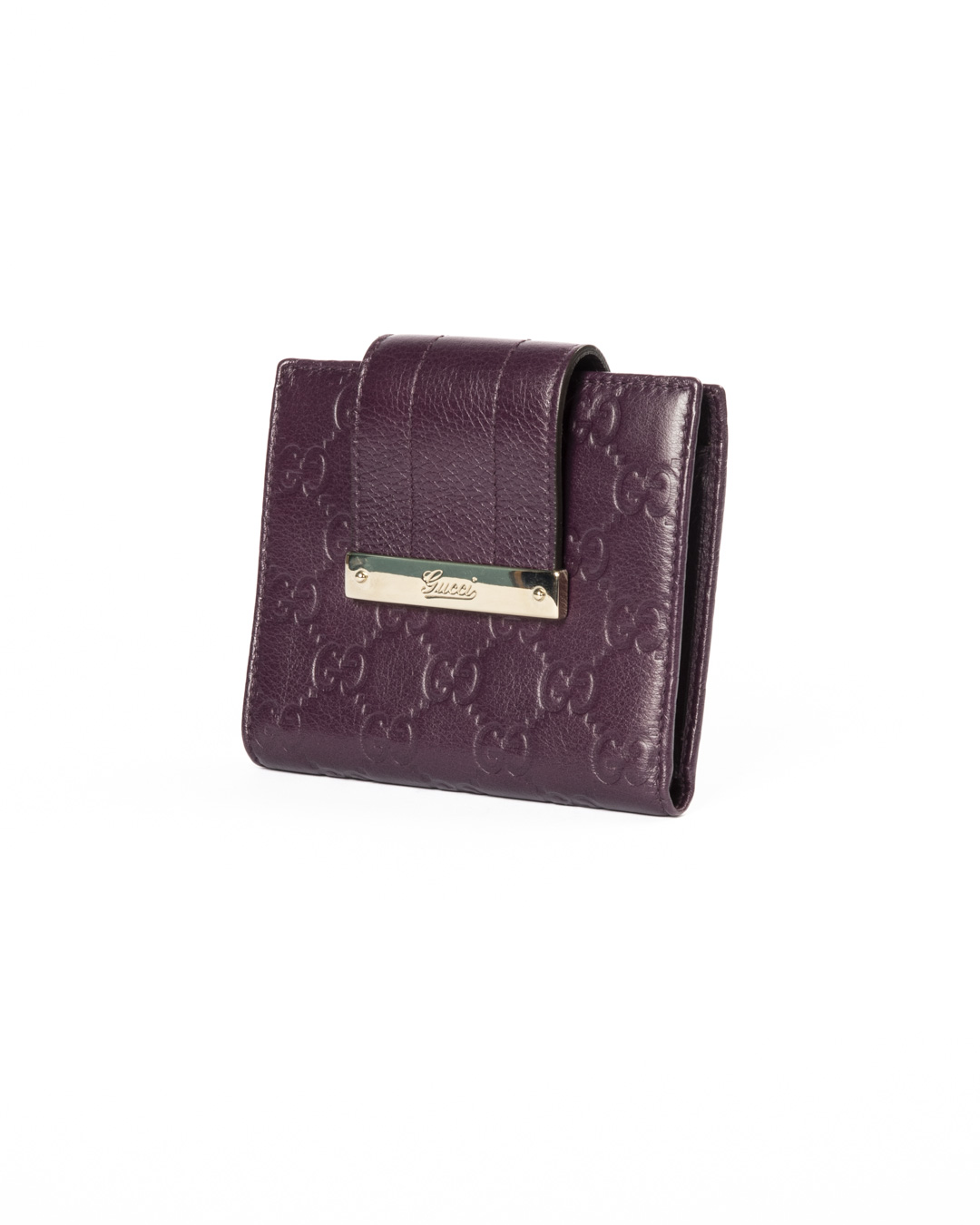 Portafoglio firmato Gucci, linea Guccissima, realizzato in pelle viola con la classica fantasia GG e hardware dorato. Dotato di una chiusura a clip, internamente rivestito in pelle liscia tono su tono con molteplici tasche comodo per documenti e banconote, il portafoglio è abbastanza capiente. L’articolo si presenta in ottime condizioni.