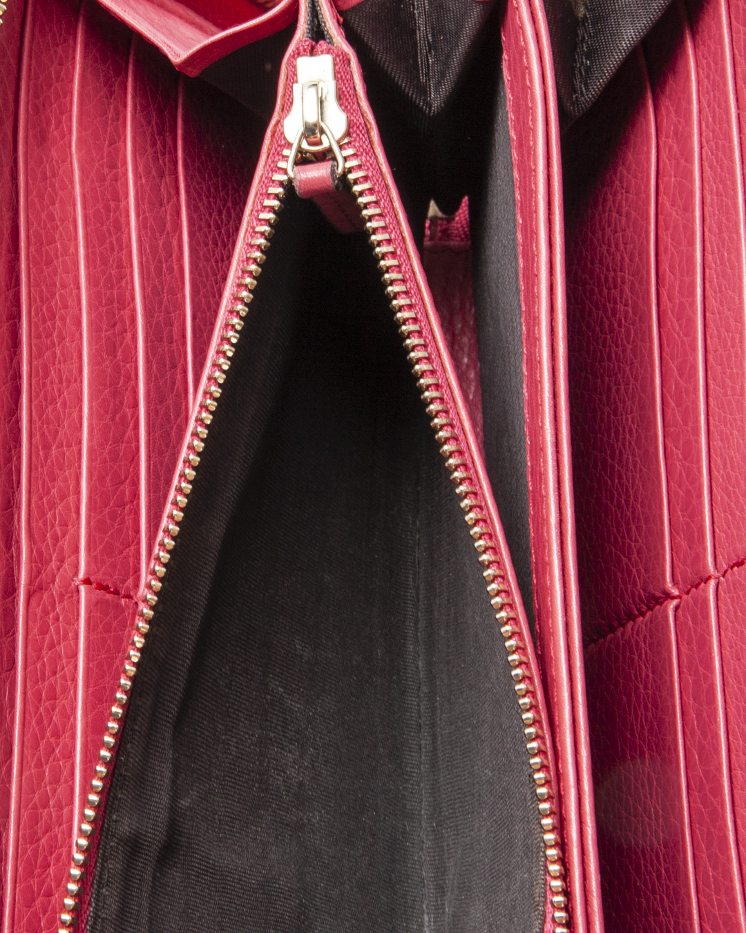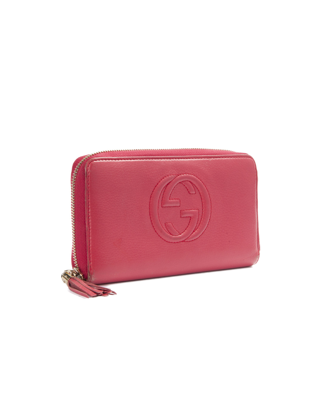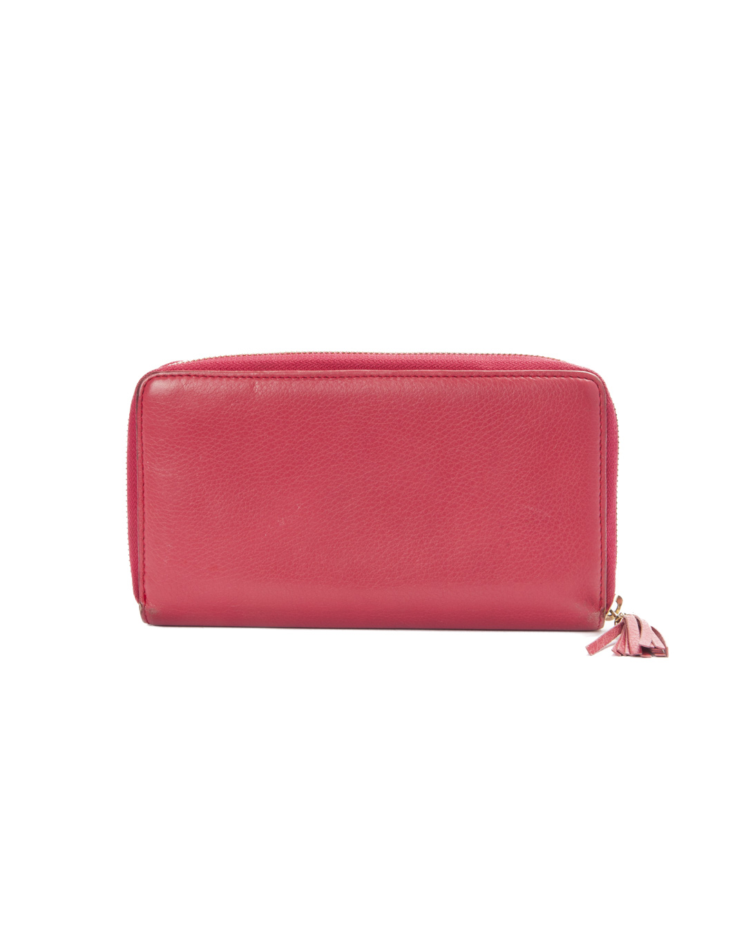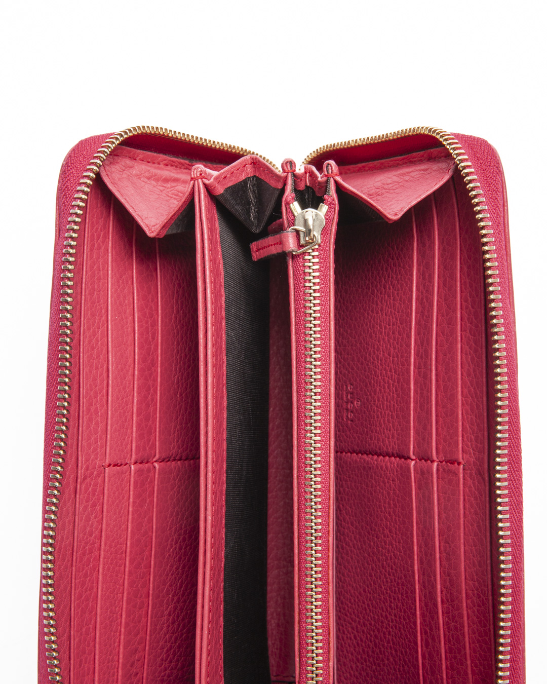 Portafoglio firmato Gucci, linea Soho, realizzato in pelle fucsia con hardware dorato. Dotato di una chiusura semicircolare a zip, internamente rivestito in pelle con molteplici tasche per documenti e banconote. L’articolo si presenta in buone condizioni, con segni di usura visibili in foto.