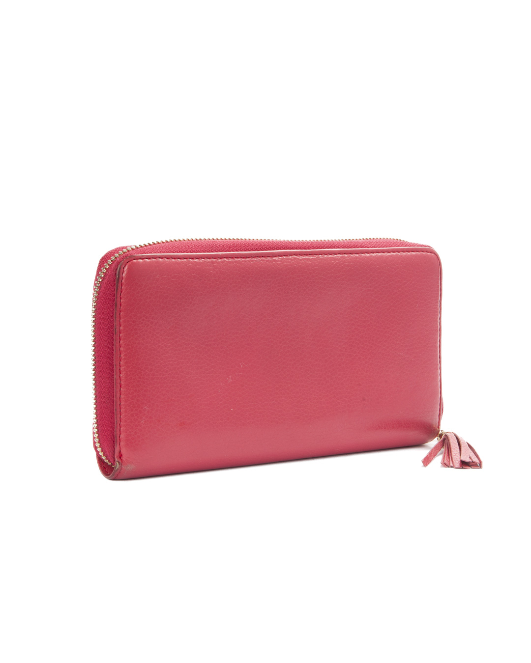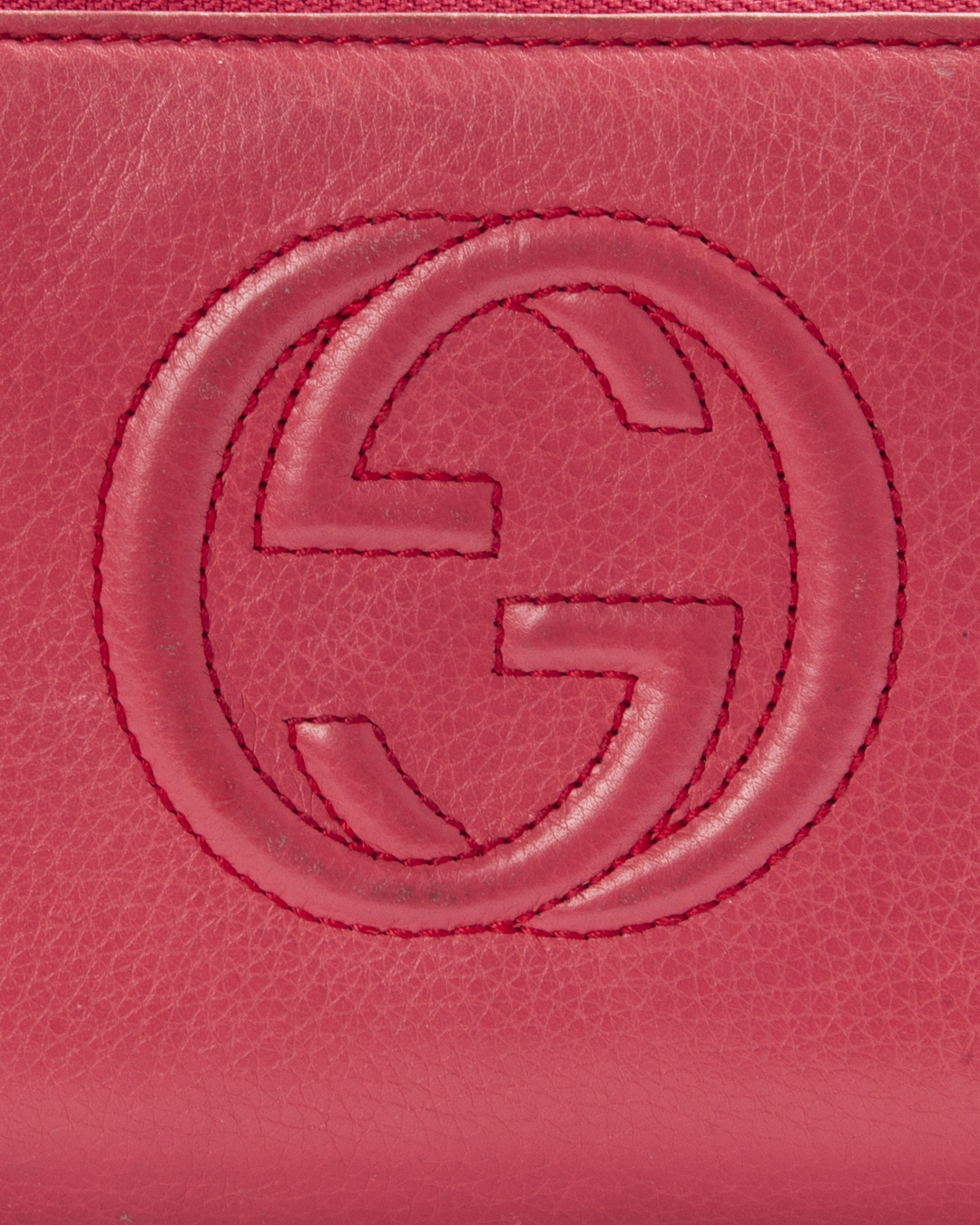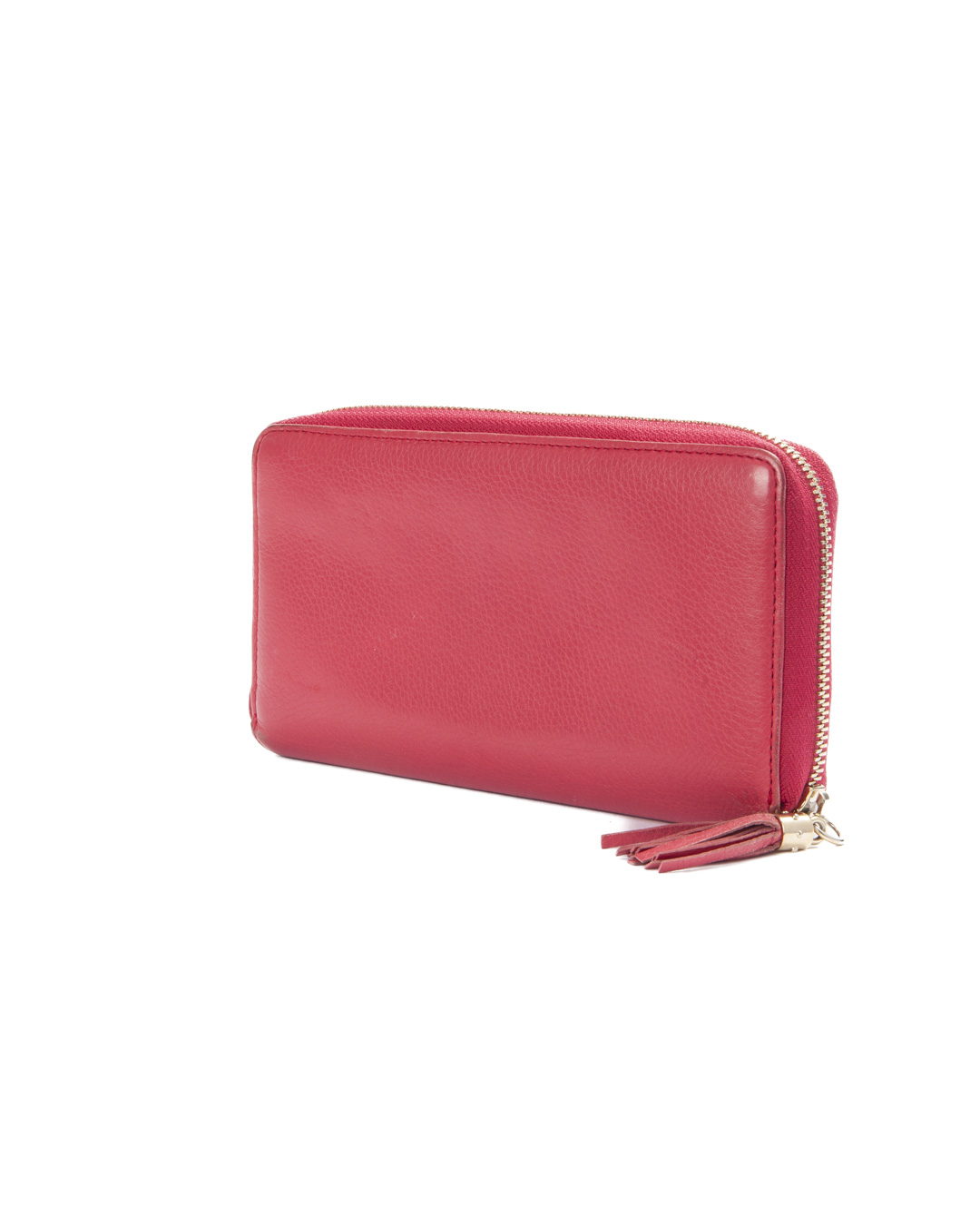 Portafoglio firmato Gucci, linea Soho, realizzato in pelle fucsia con hardware dorato. Dotato di una chiusura semicircolare a zip, internamente rivestito in pelle con molteplici tasche per documenti e banconote. L’articolo si presenta in buone condizioni, con segni di usura visibili in foto.