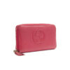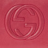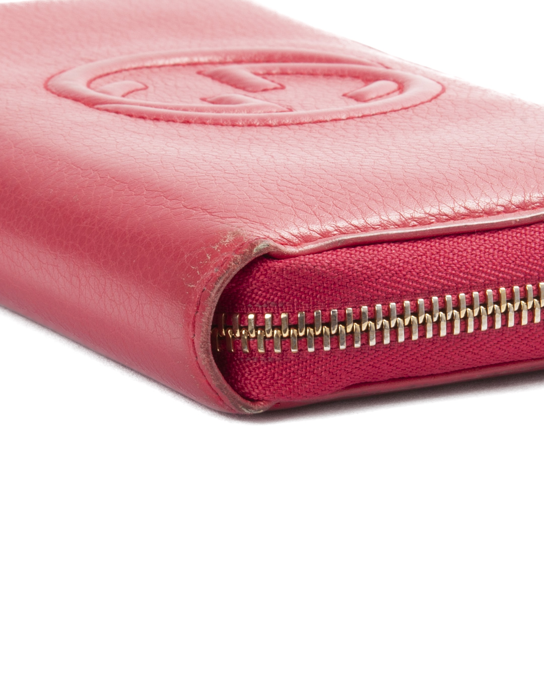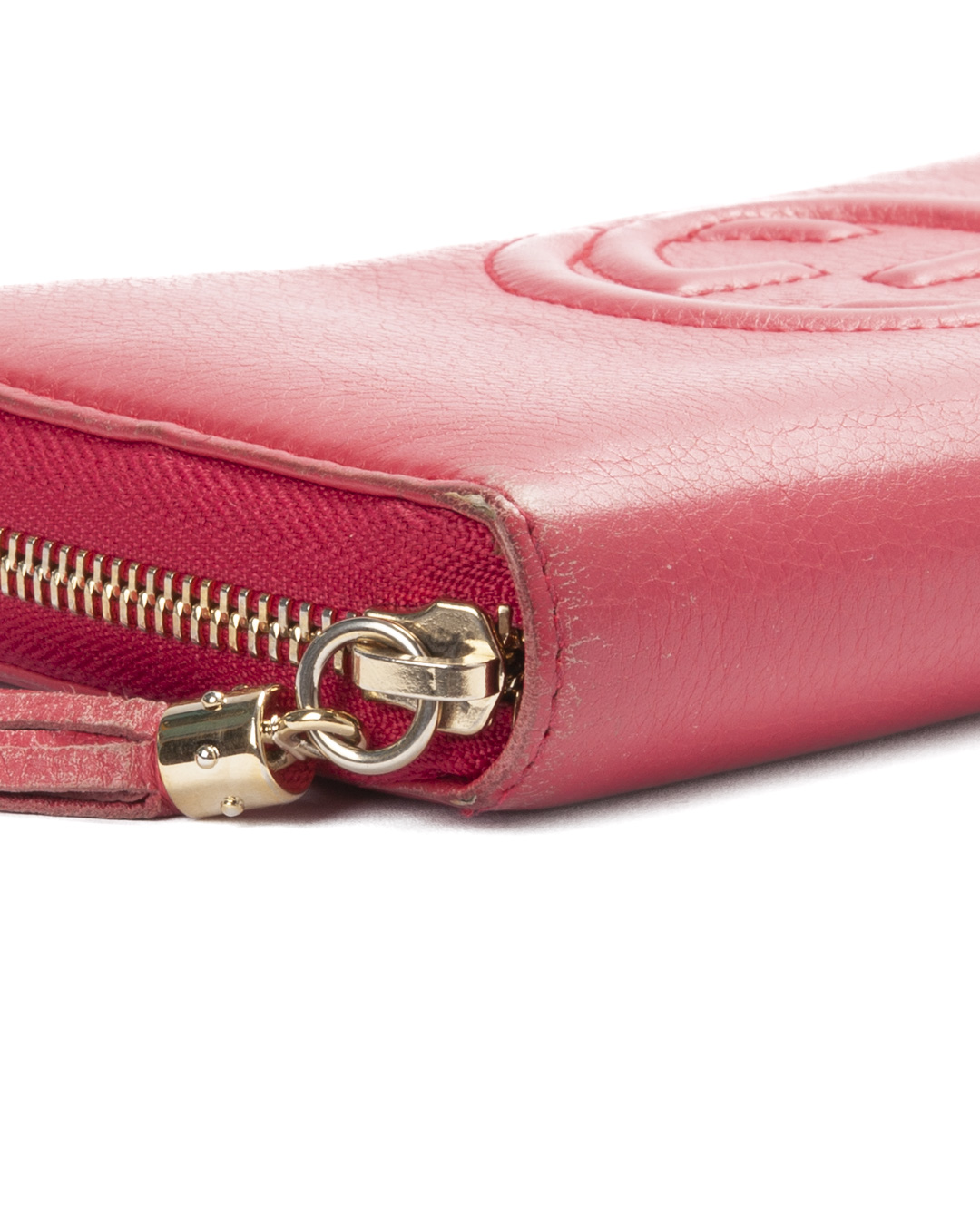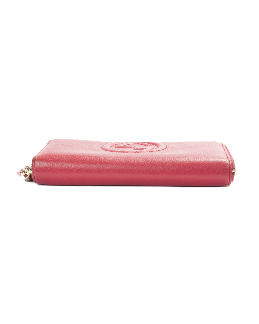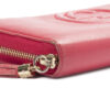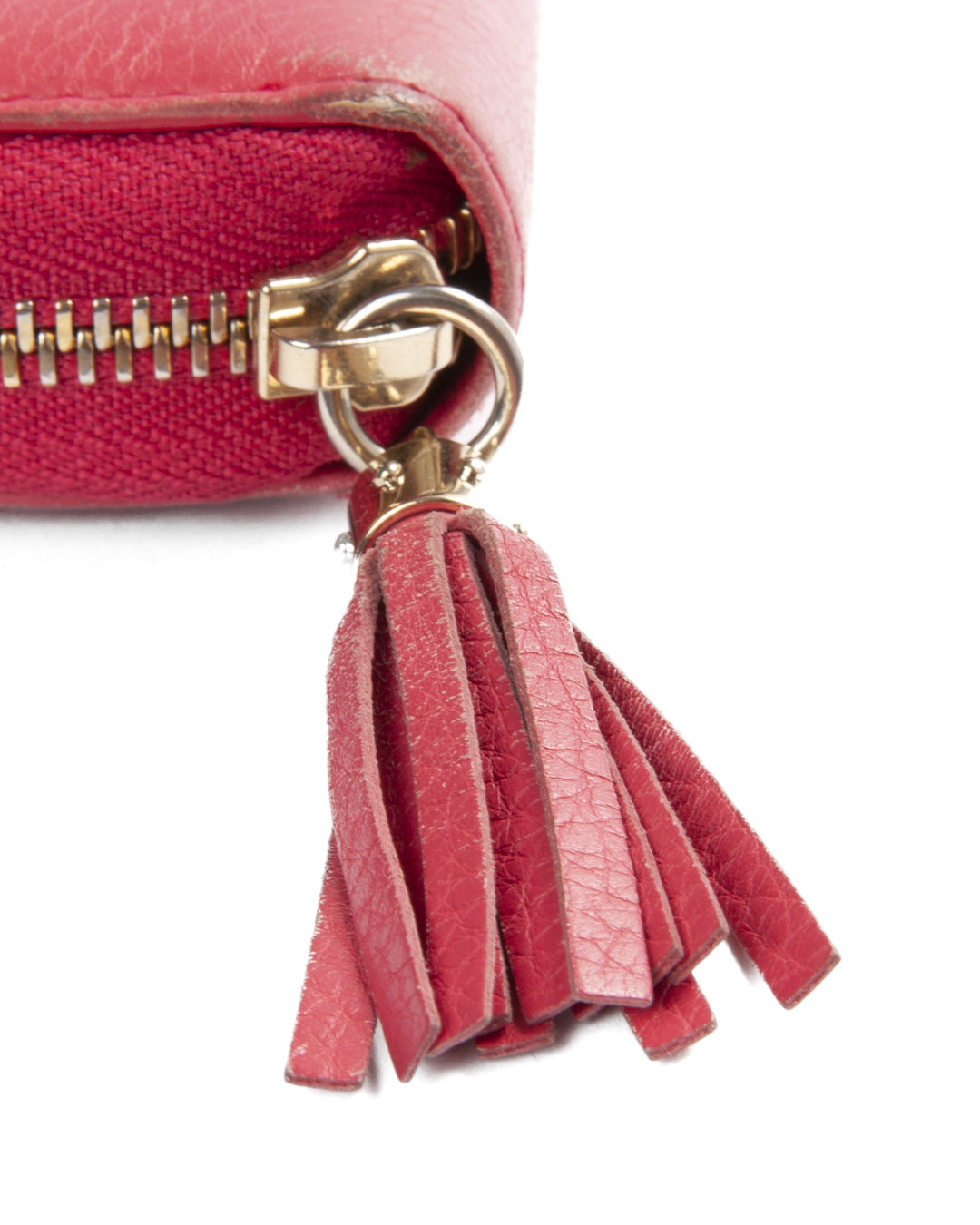 Portafoglio firmato Gucci, linea Soho, realizzato in pelle fucsia con hardware dorato. Dotato di una chiusura semicircolare a zip, internamente rivestito in pelle con molteplici tasche per documenti e banconote. L’articolo si presenta in buone condizioni, con segni di usura visibili in foto.