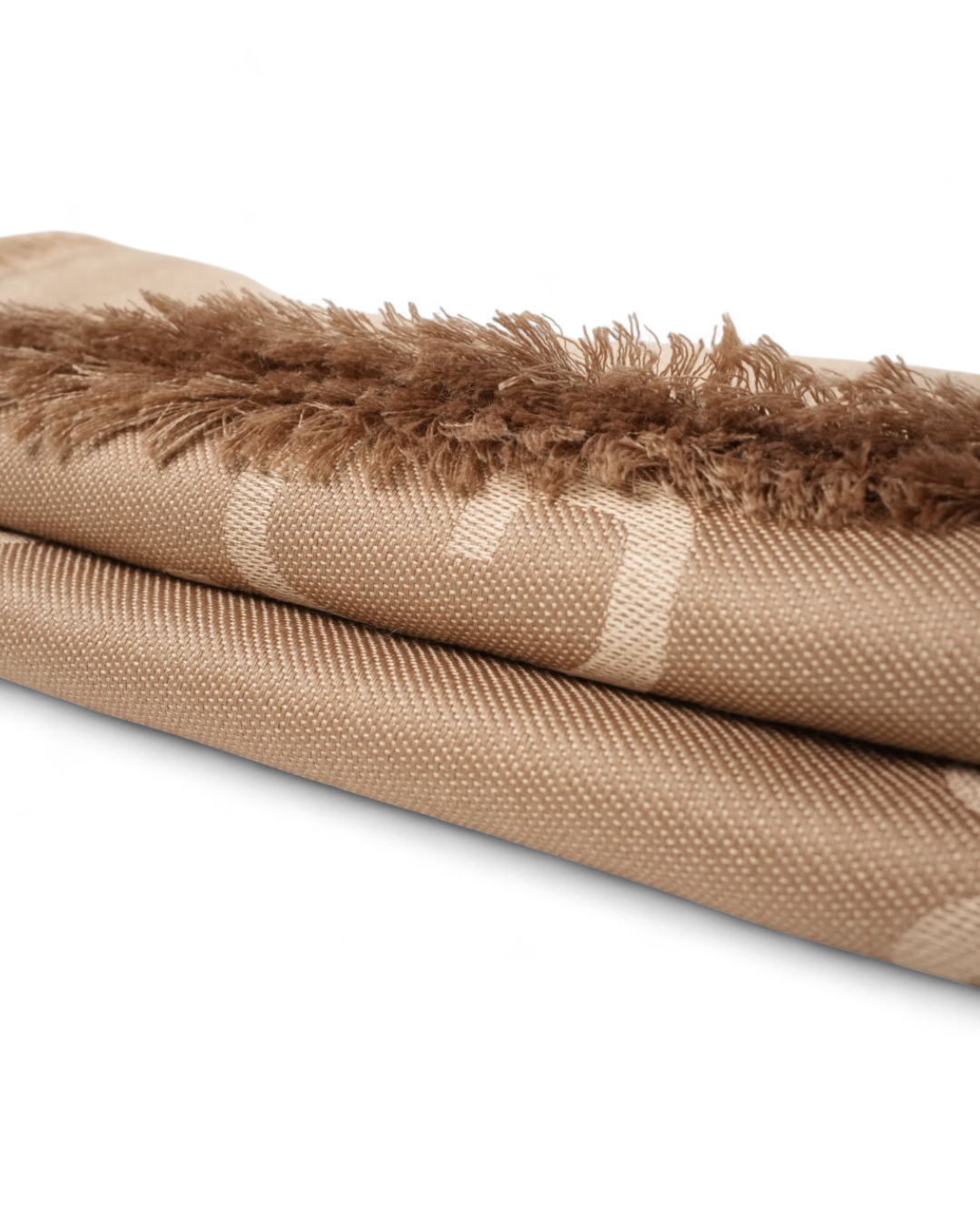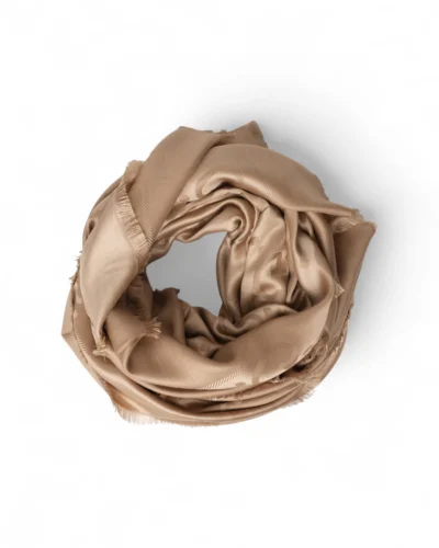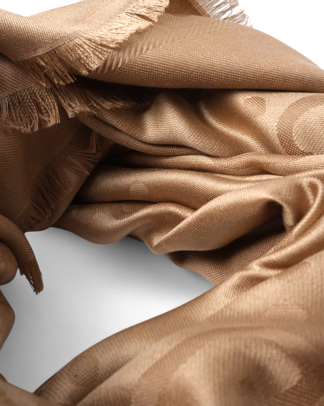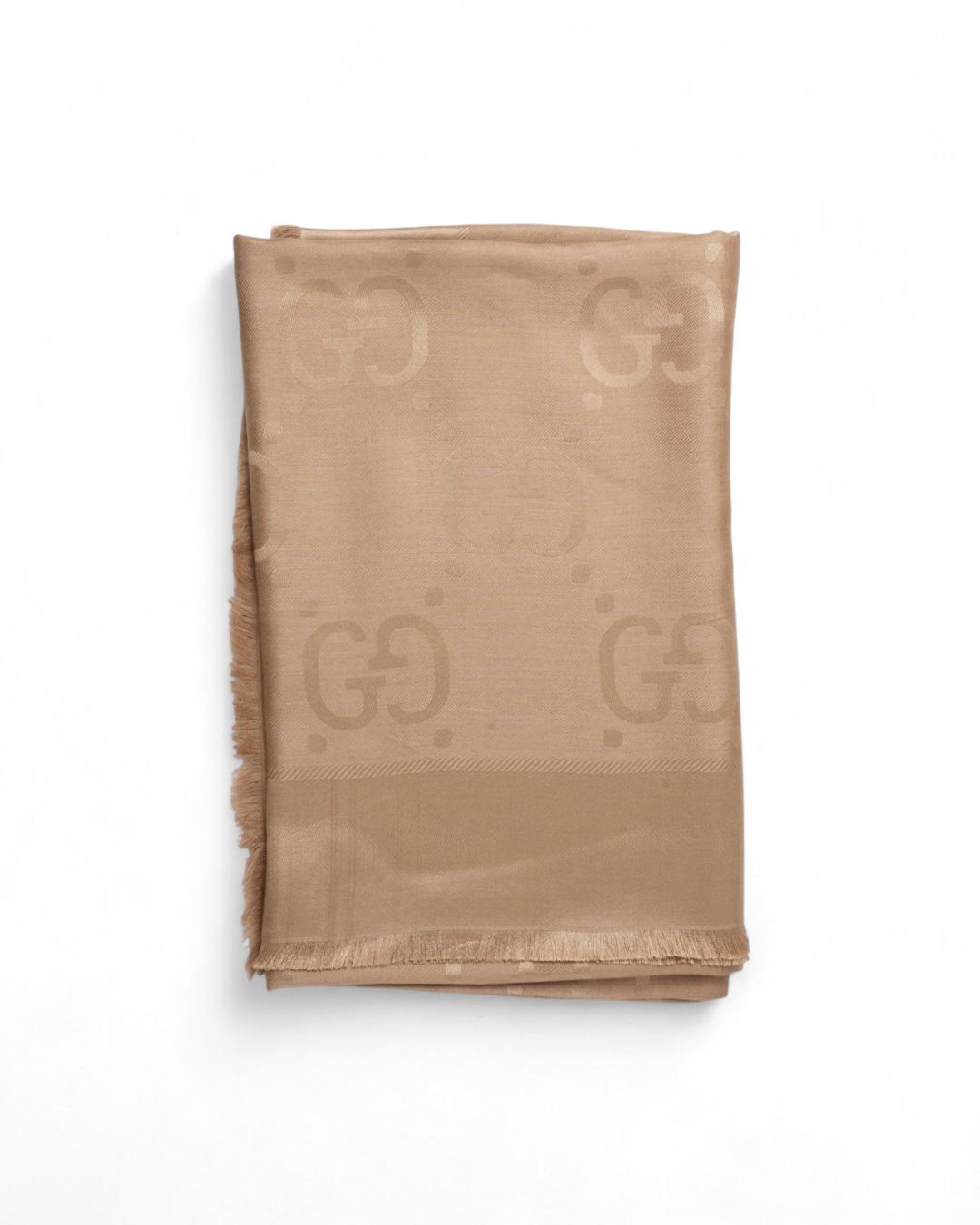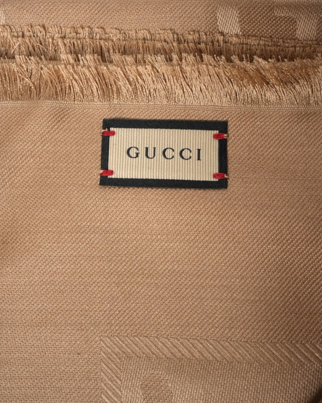 Scialle firmato Gucci, realizzato in lana e seta nella colorazione cammello con l’emblematico motivo GG tono su tono. Misura 140 centimetri di lunghezza e 140 centimetri di altezza. L’articolo si presenta in condizioni pari al nuovo.