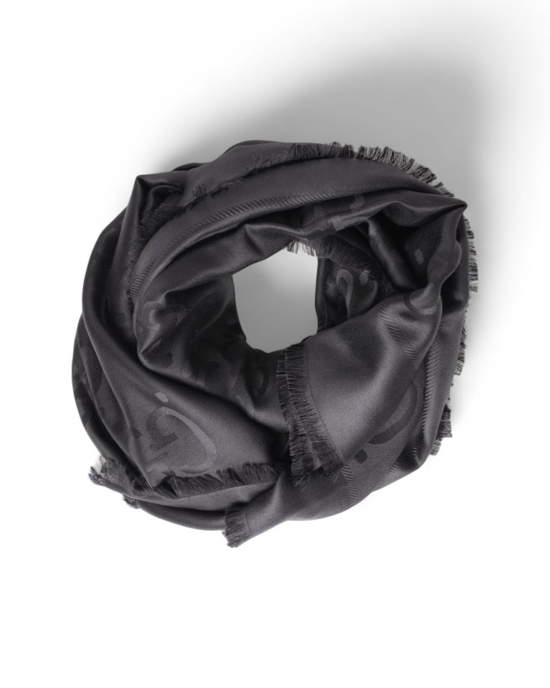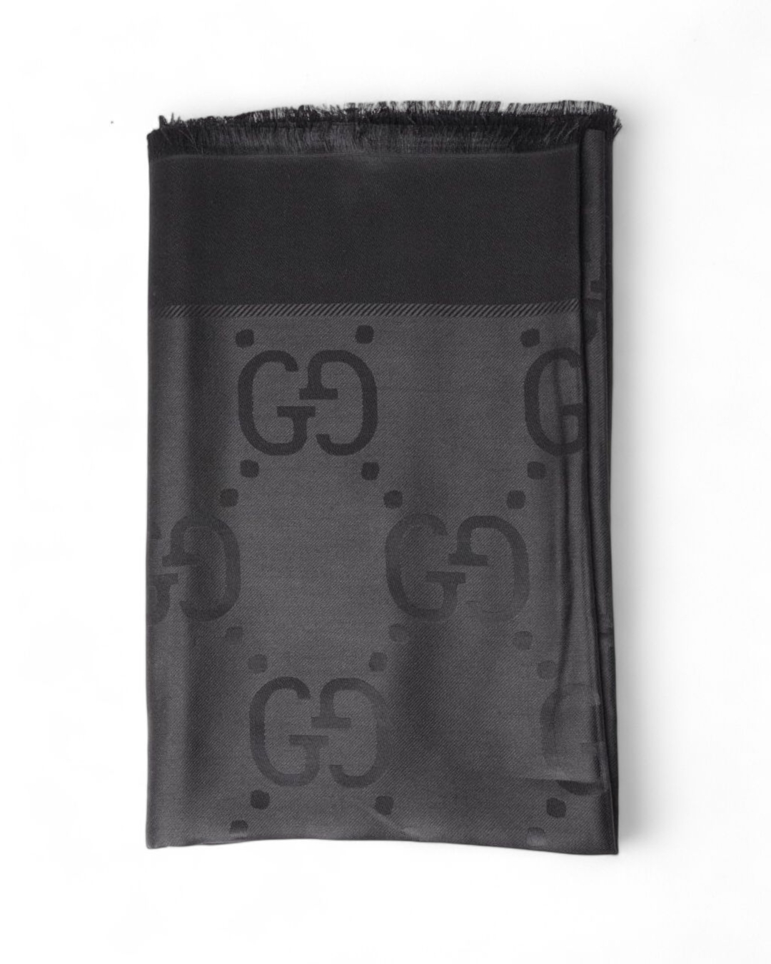 Scialle firmato Gucci, realizzato in lana e seta nella colorazione nero con l’emblematico motivo GG Jumbo tono su tono. Misura 140 centimetri di lunghezza e 140 centimetri di altezza. L’articolo si presenta in condizioni pari al nuovo.