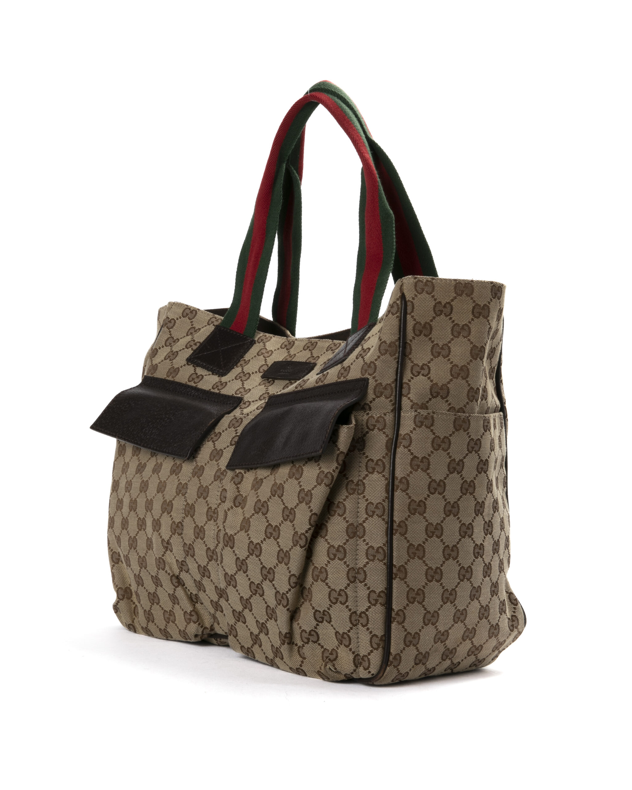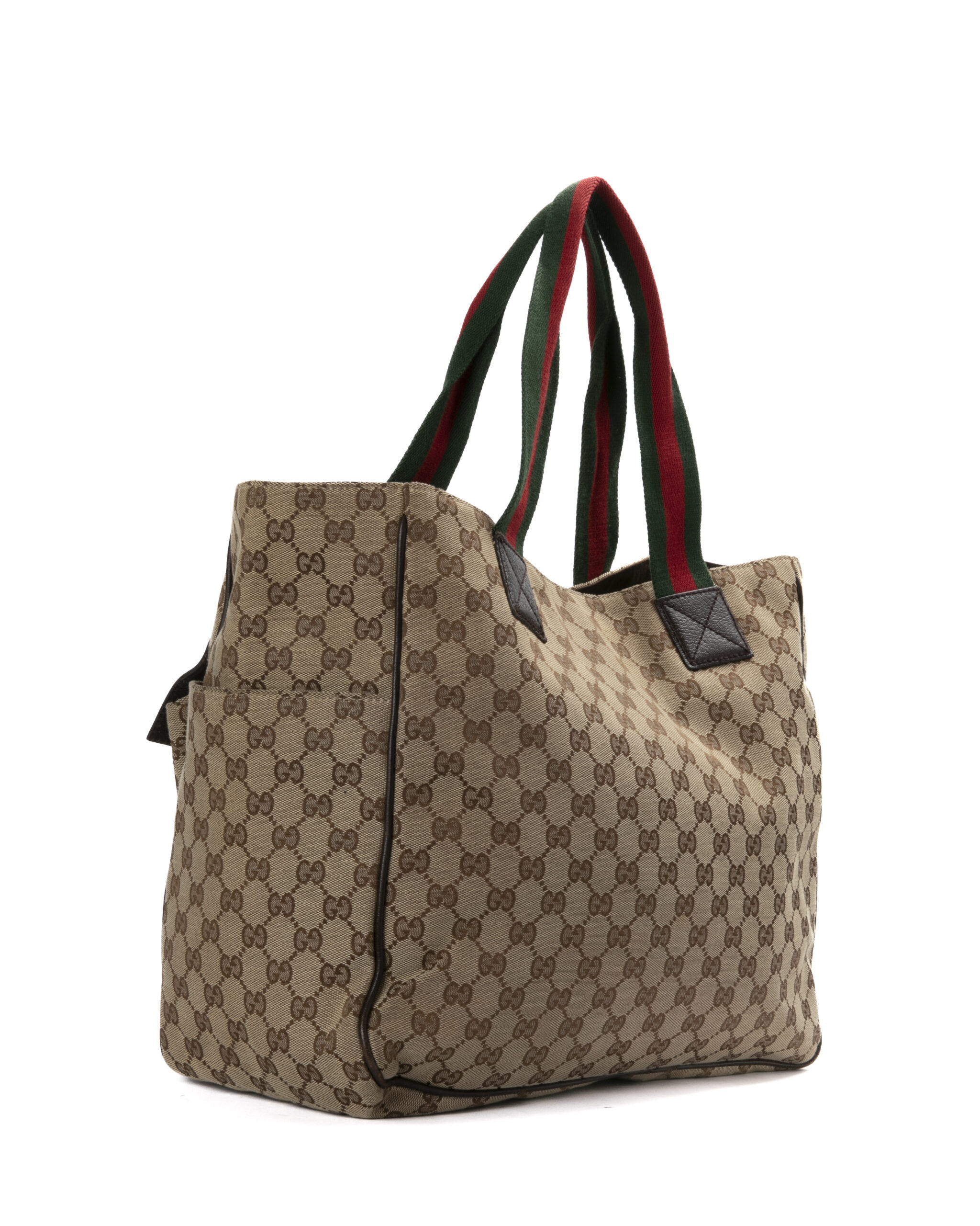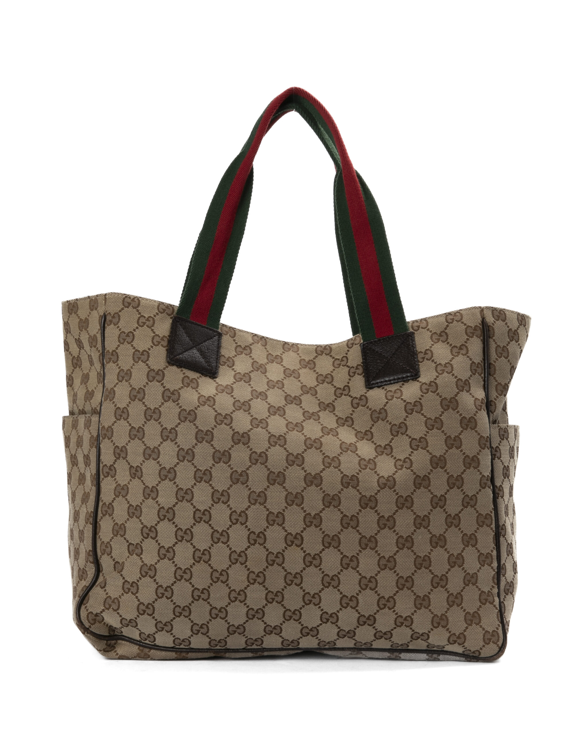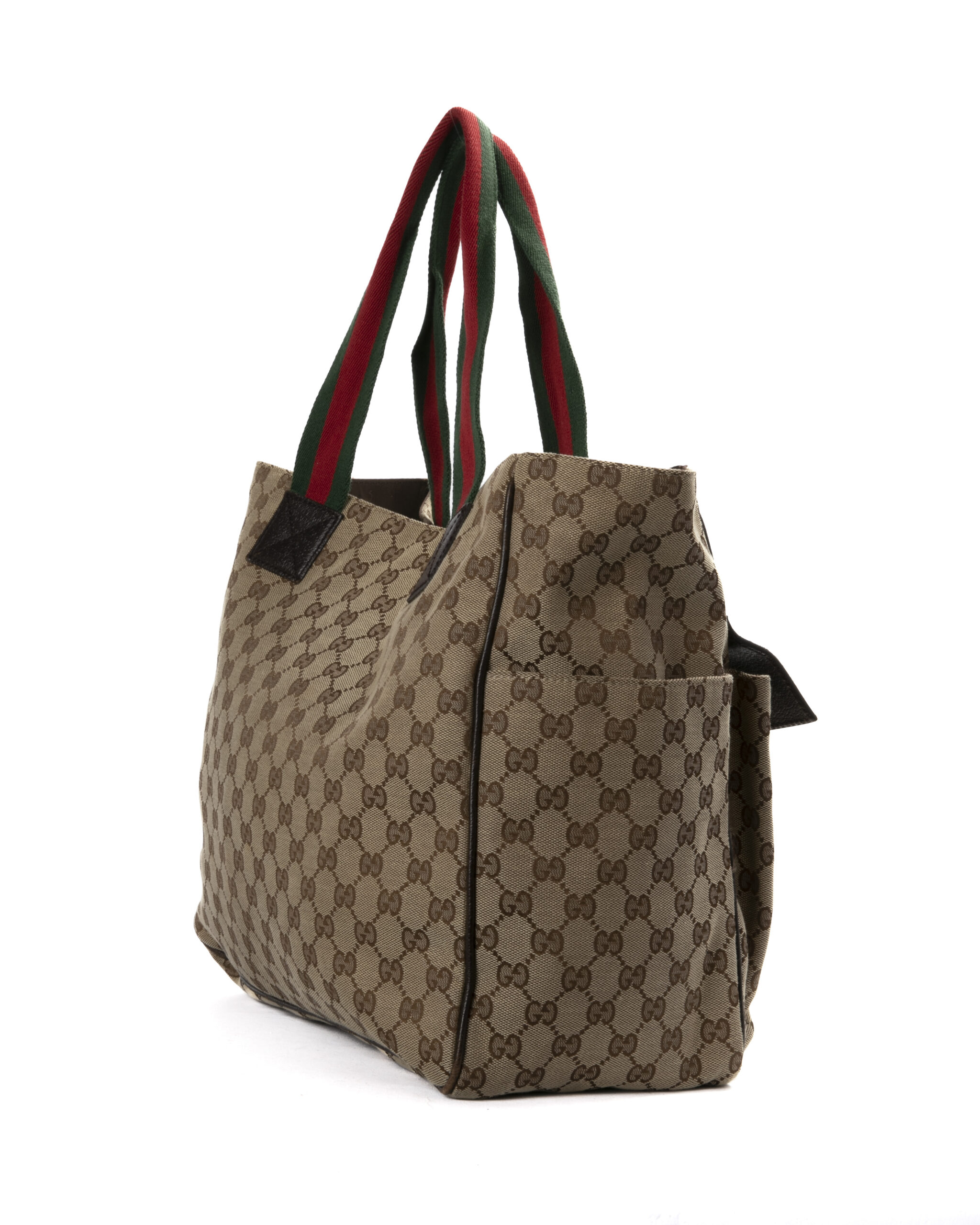 Borsa firmata Gucci, modello shopper nella misura large, realizzata in tela marrone nella classica fantasia gg supreme con inserti in pelle marrone e hardware argento. Dotata di una chiusura calamitata, internamente rivestita in tessuto marrone con comode tasche, la borsa è abbastanza capiente. Munito di doppio manico in tessuto nella fantasia web, per una comoda portata a spalla o a mano. Arricchita da due comode tasche con chiusura calamitata sulla parte frontale. L’articolo si presenta in buone condizioni, con segni di usura visibili in foto.