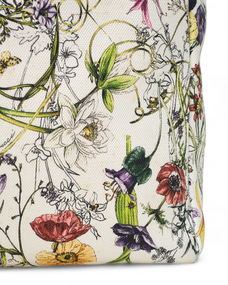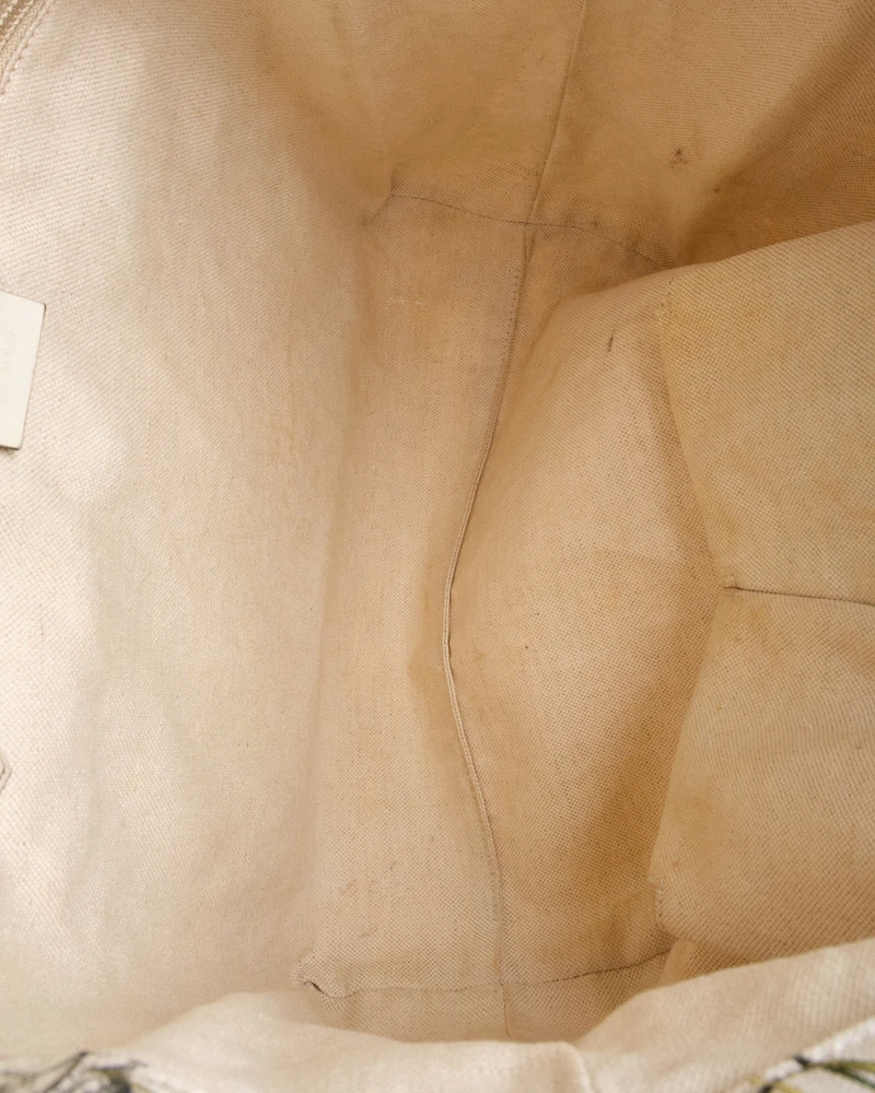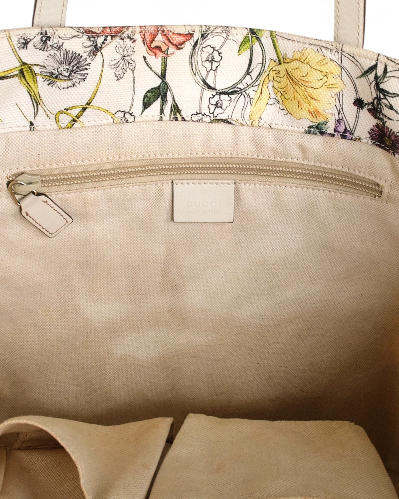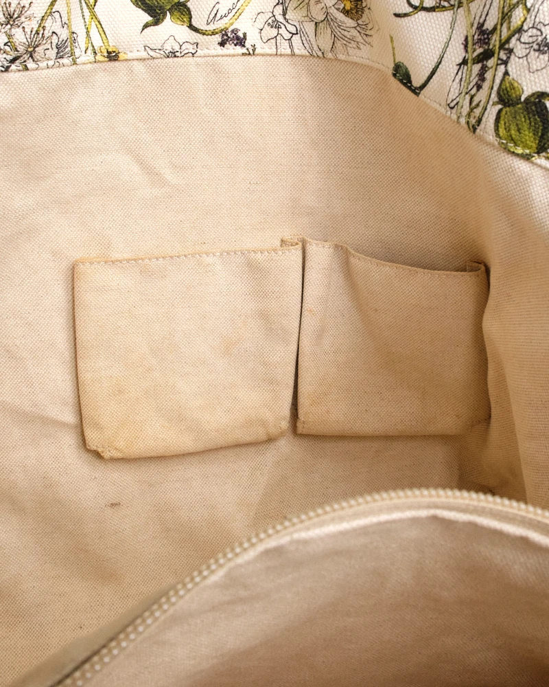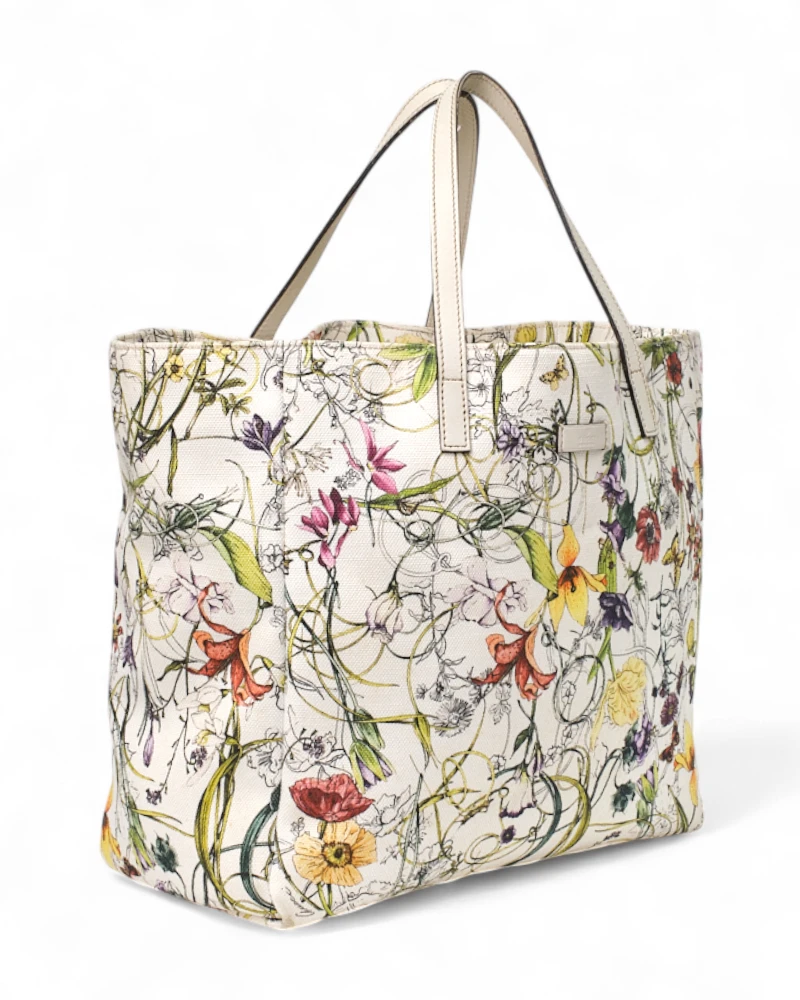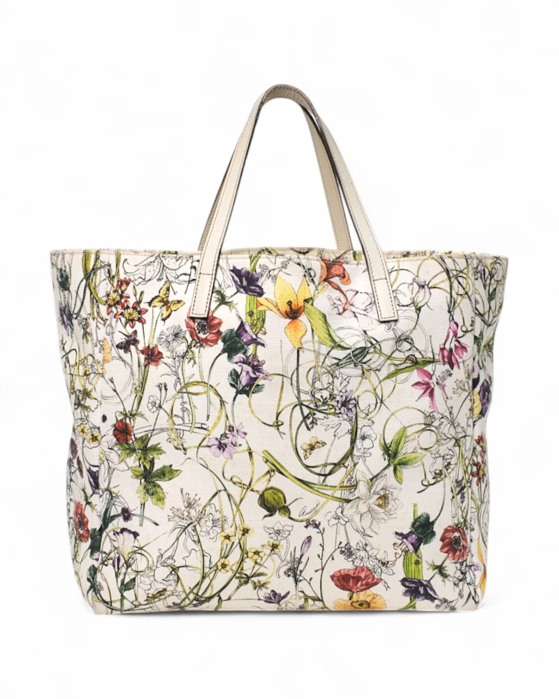 Borsa firmata Gucci, modello Shopper, misura medium, realizzata in tela bianca con fantasia flora e rifiniture in pelle. Non è dotata di nessuna chiusura, internamente rivestita in tessuto sono su tono e presenta comode tasche con e senza zip, la borsa è abbastanza capiente. Munita di doppi manici in pelle per una portata a braccio. L’articolo si presenta in buone condizioni.