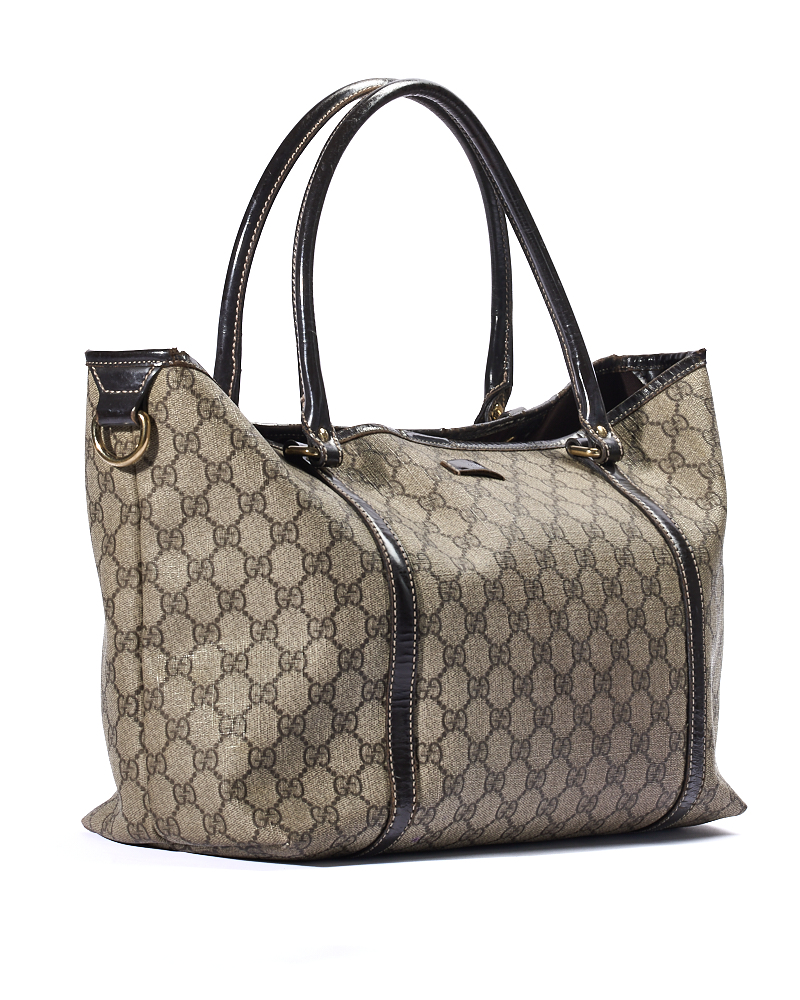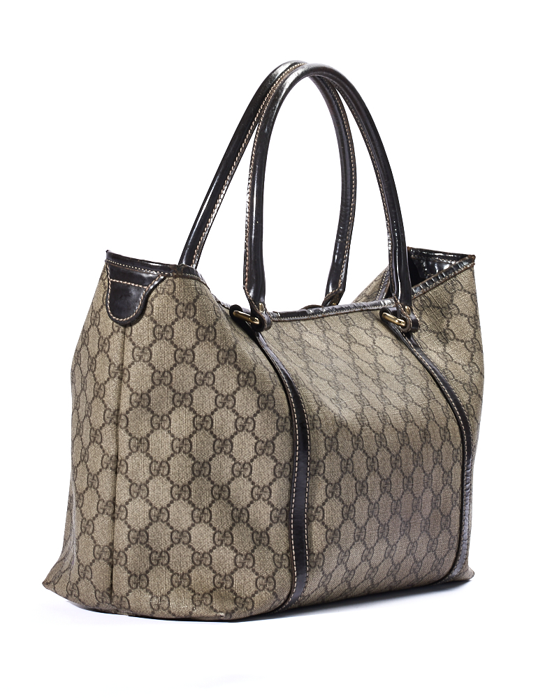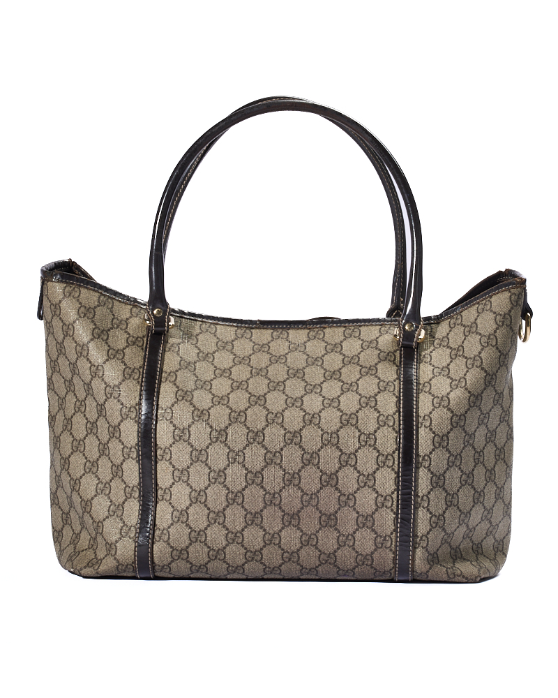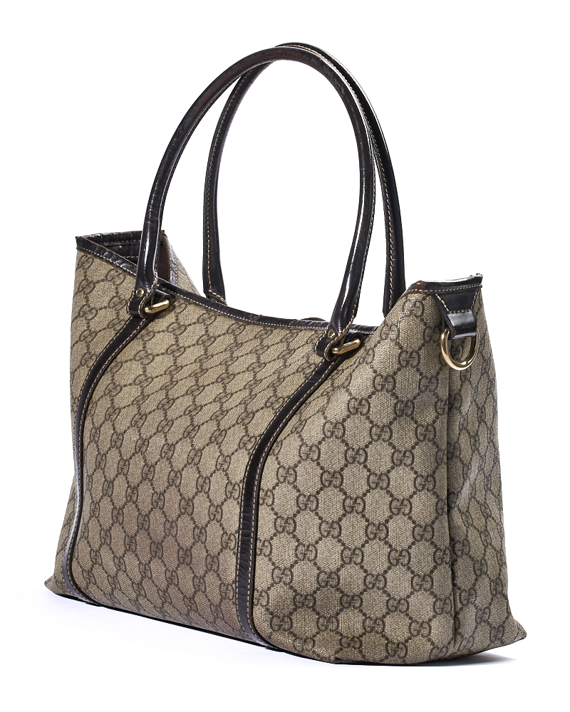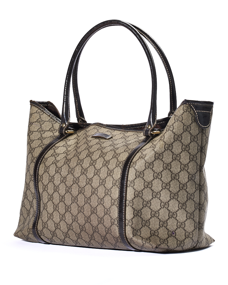 Borsa firmata Gucci, modello Shopper, misura Medium, realizzata in tela nella classica fantasia GG Supreme con rifiniture in pelle marrone e hardware dorato, dotata di una chiusura centrale calamitata, internamente rivestita in tela marrone e presenta una comoda tasca, la borsa è abbastanza capiente. Munita di doppi manici in pelle per una portata a spalla. L’articolo si presenta in buone condizioni.