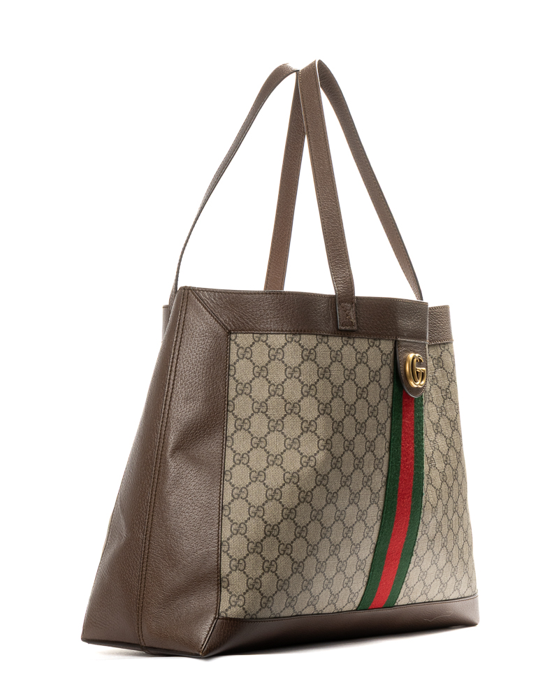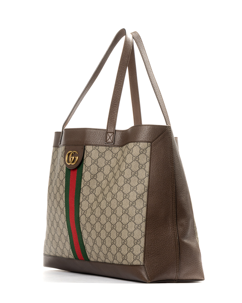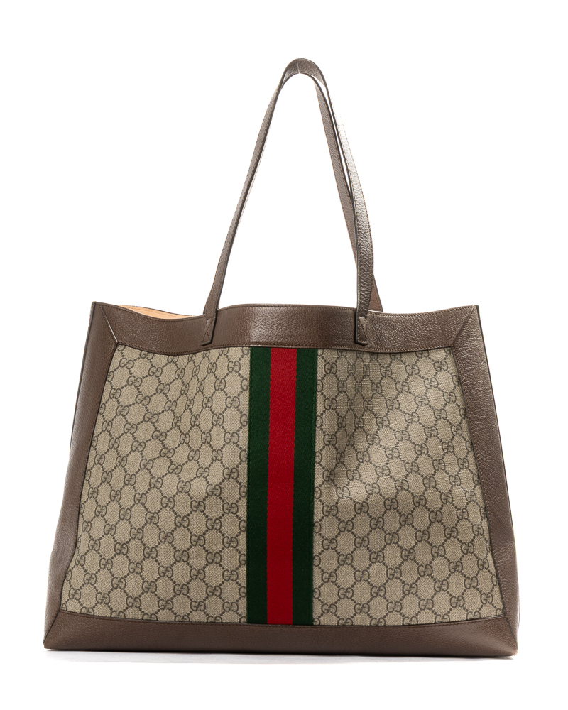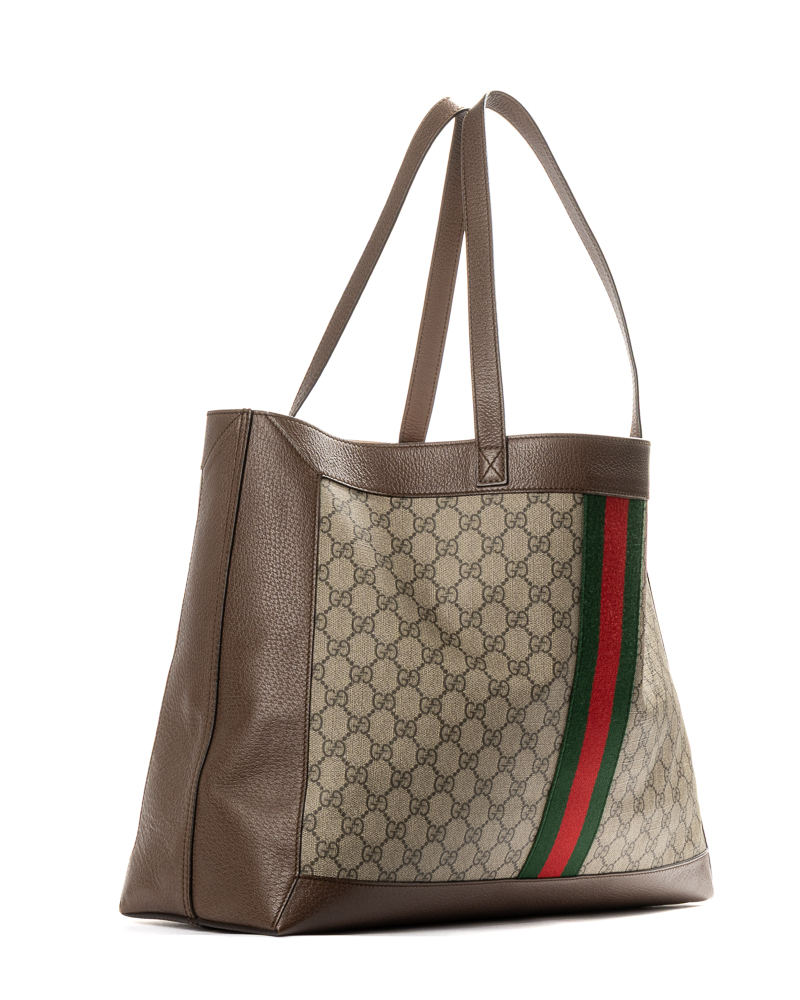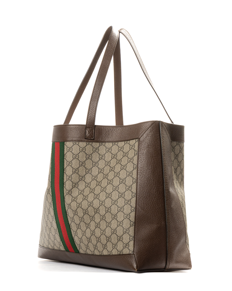 Borsa firmata Gucci, linea Ophidia, modello shopper nella misura large, realizzata in tela nella fantasia GG Supreme con inserti in pelle marrone e hardware dorato. Non è dotata di nessuna chiusura, internamente rivestita in tessuto scamosciato beige, la borsa è molto capiente. Munita di doppio manico in pelle, per una comoda portata a spalla o a mano. Arricchita dalla classica fascia web in tessuto verde e rossa. L’articolo si presenta in buone condizioni, con piccole usure.
