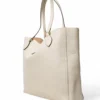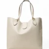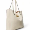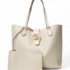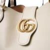 Borsa firmata Gucci, modello Shopper Vertical, realizzata in pelle bianca con hardware dorato. Dotata di una fascia con classico logo del brand “GG” in metallo oro e chiusura a bottone calamitato. Internamente rivestita in tessuto scamosciato beige con comoda pochette rimovibile, la borsa è molto capiente. Munita di doppio manico in pelle, per una comoda portata a mano o a spalla. L’articolo si presenta in buone condizioni.