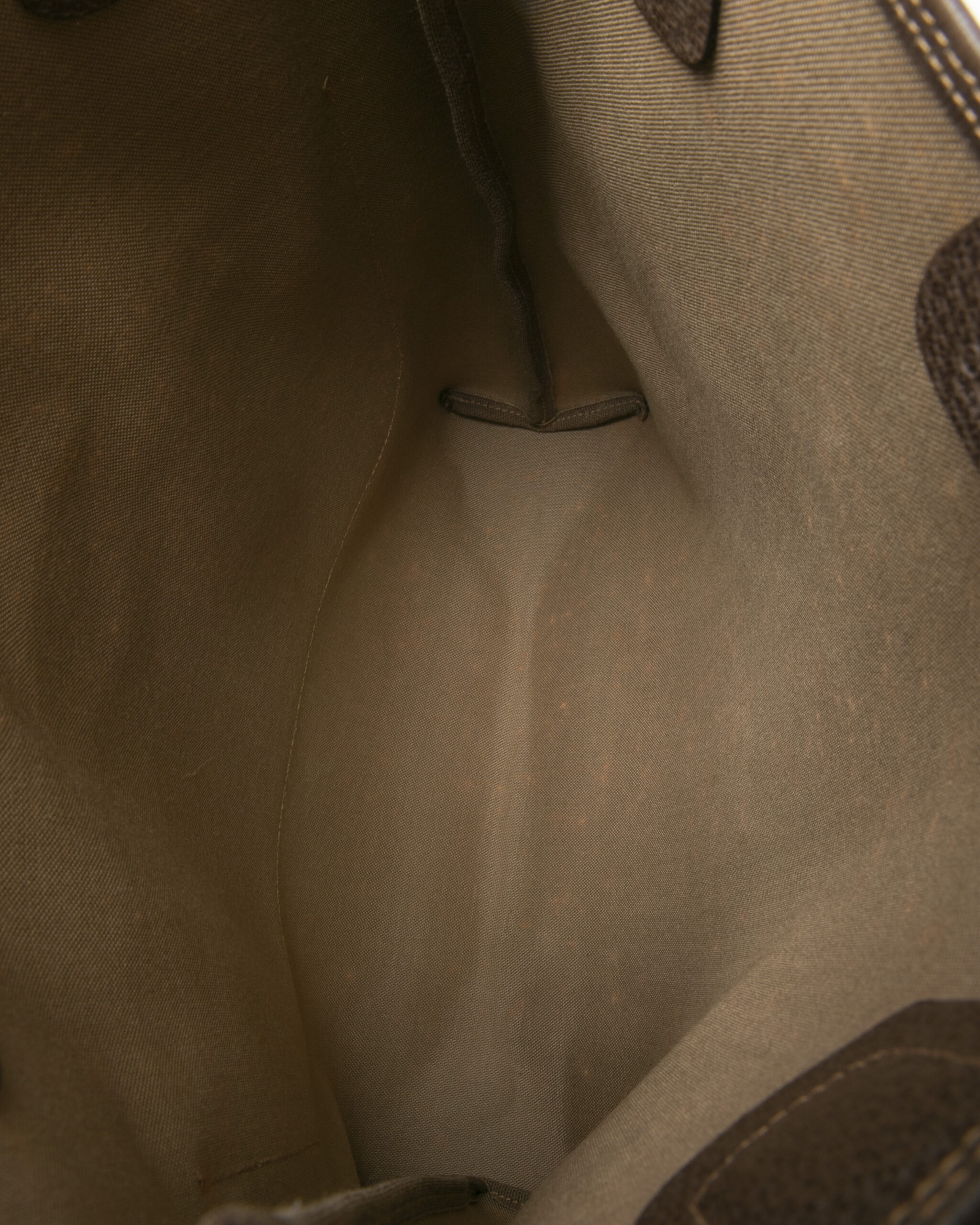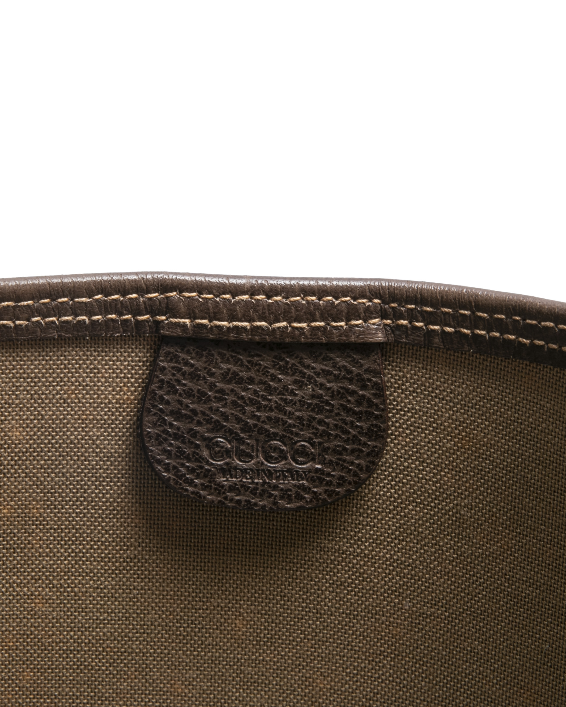 Borsa firmata Gucci, linea Ophidia Vintage, modello shopper vertical nella misura large, realizzata in tela nella classica fantasia GG Supreme con inserti in pelle e hardware dorato. Non è dotata di nessuna chiusura, internamente rivestita in tela marrone, la borsa è abbastanza capiente. Munita di doppio manico in tessuto nella classica fascia web verde e rossa, per una comoda portata a spalla o a mano. Completa di una comoda tasca aperta sulla parte frontale. L’articolo si presenta in buone condizioni, con piccoli segni di usura visibili in foto.
