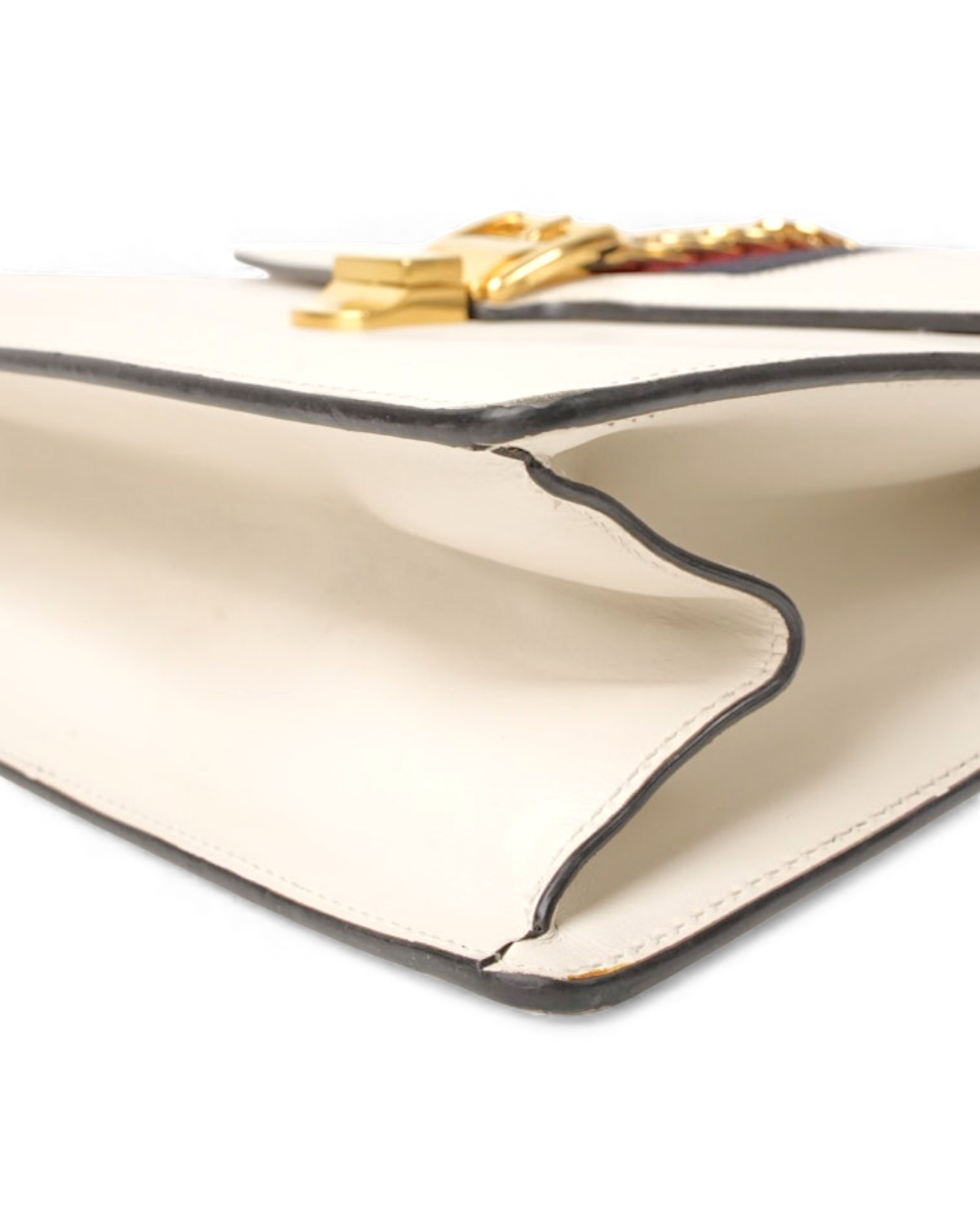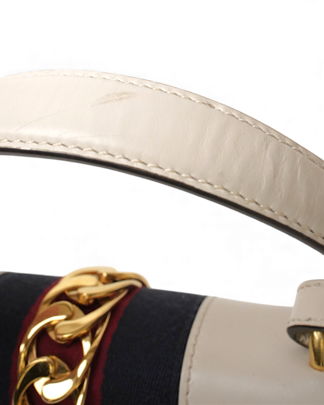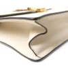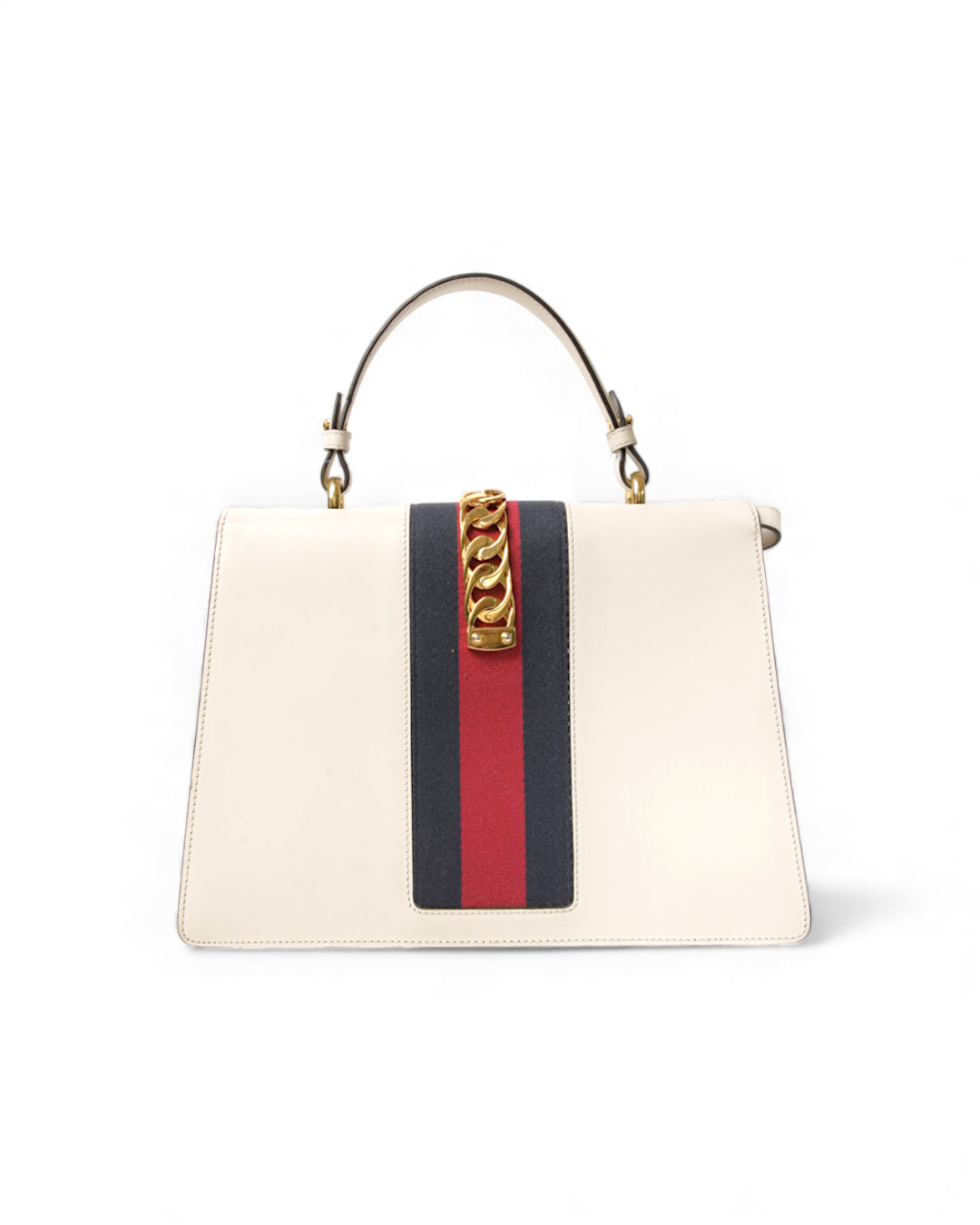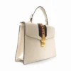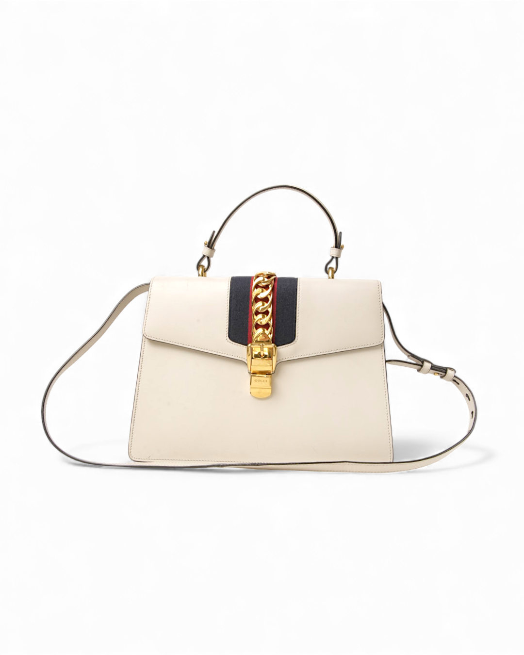 Borsa firmata Gucci, modello Silvye nella misura large, realizzata in pelle box bianca con hardware dorato. Dotata di una patta con chiusura ad incastro, internamente rivestita in tessuto scamosciato beige con comoda tasca, la borsa è abbastanza capiente. Munita di un manico e di una tracolla rimovibile e regolabile, per una comoda portata a spalla o a tracolla. Arricchita dalla classica fascia web blu e rossa. L’articolo si presenta in buone condizioni, con piccoli segni di usura visibili in foto.