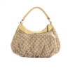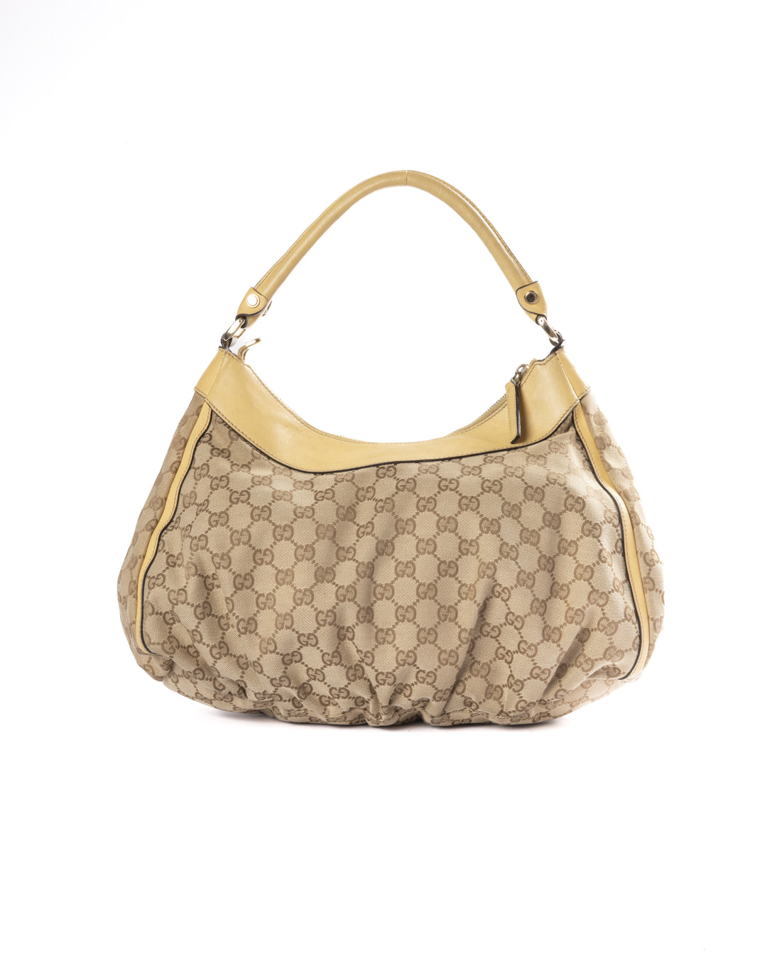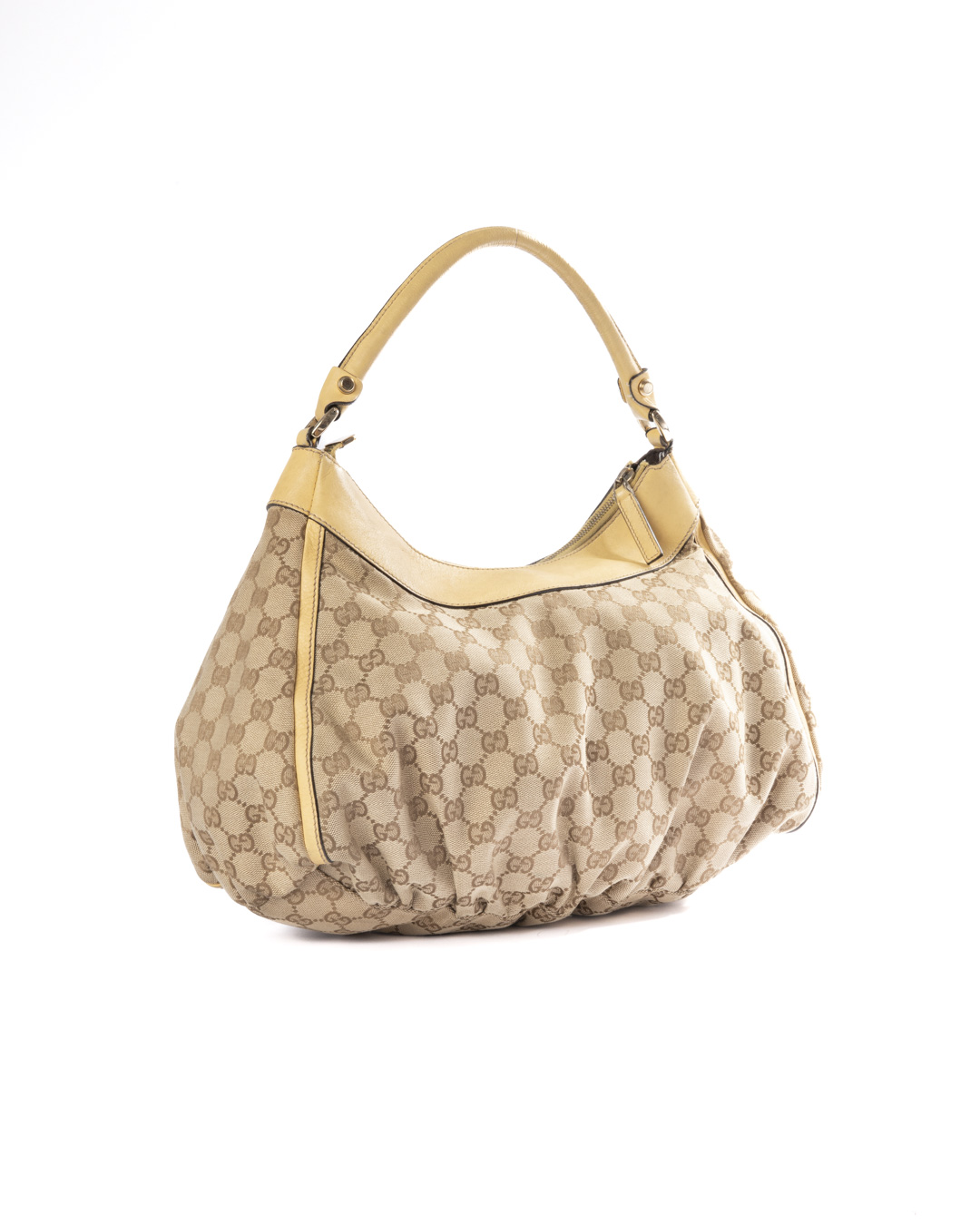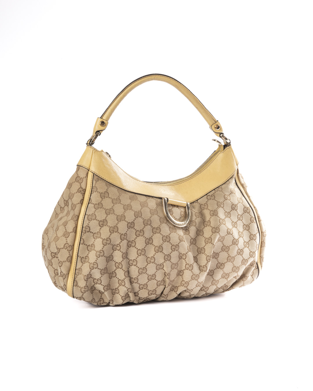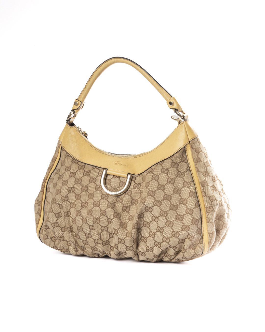 Borsa firmata Gucci, modello D-Ring Hobo, realizzata in tela nella classica fantasia GG Supreme con inserti in pelle gialla e hardware argento. Dotata di una chiusura superiore a zip, internamente rivestita in tela marrone con comoda tasca, la borsa è abbastanza capiente. Munita di un manico in pelle, per una comoda portata a spalla o a mano. L’articolo si presenta in buone condizioni.