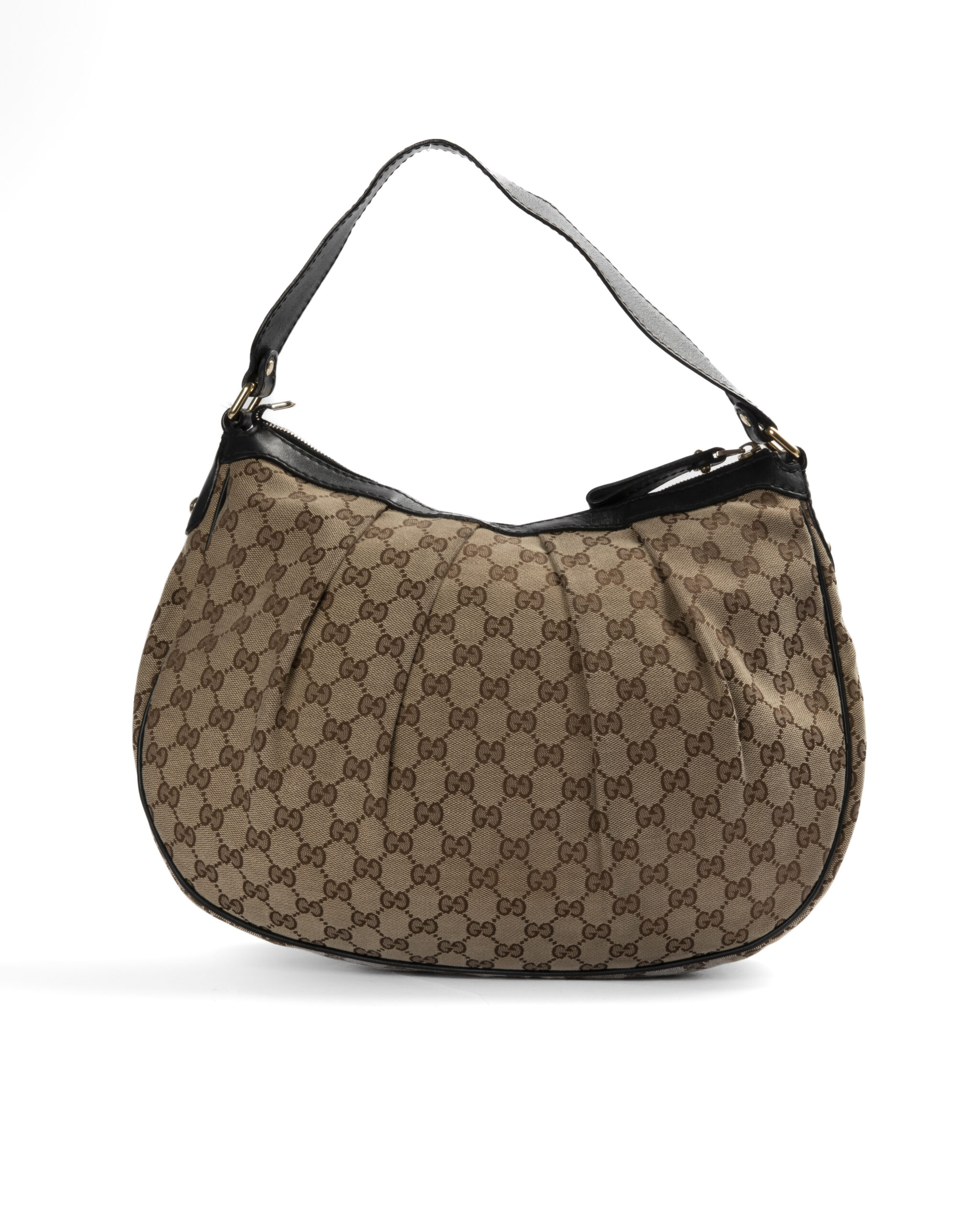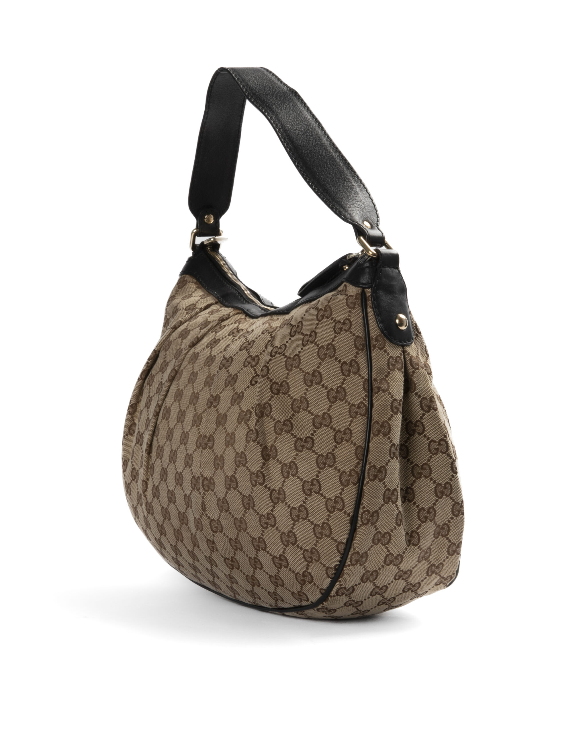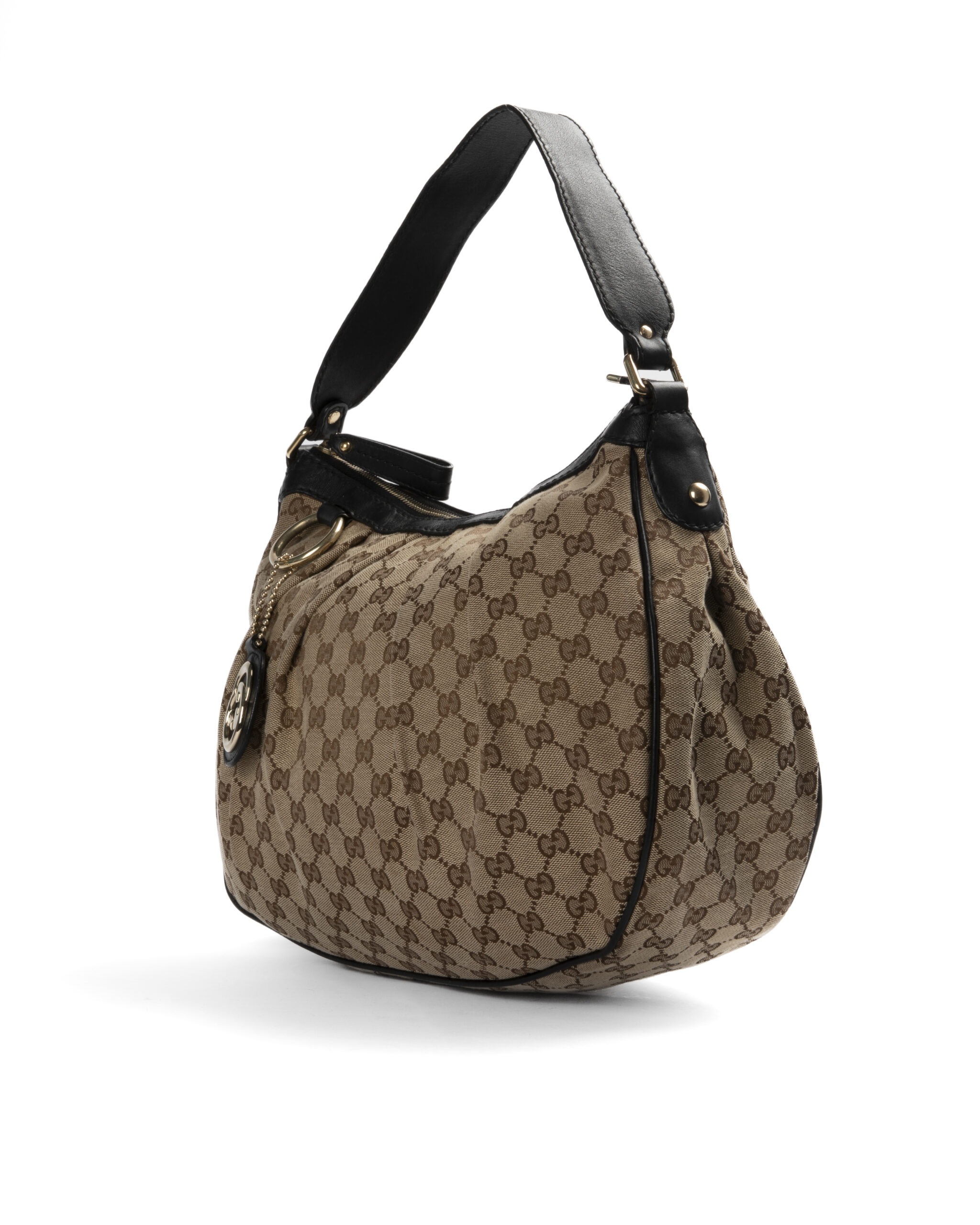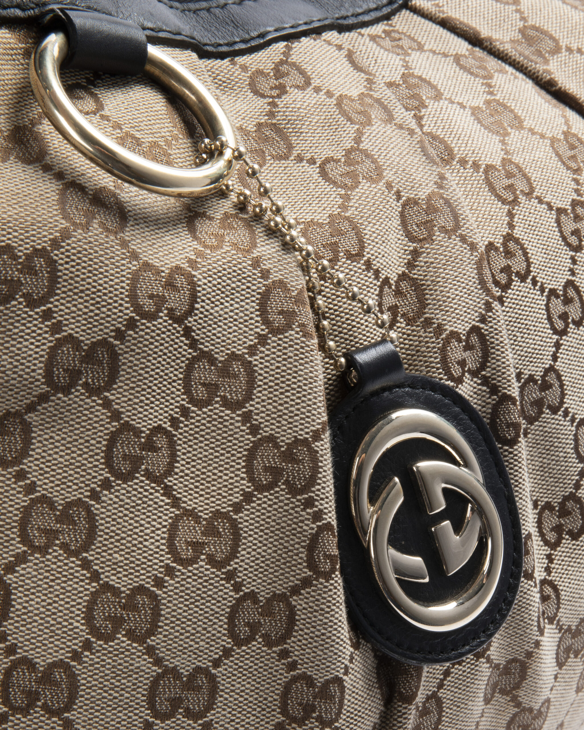 Borsa firmata Gucci, linea Sukey, modello hobo nella misura medium, realizzata in tela marrone nella fantasia GG Supreme con inserti in pelle nero e hardware dorato. Dotata di una chiusura a zip, internamente rivestita in tessuto marrone con comode tasche, la borsa è abbastanza capiente. Munita di un manico in pelle, per una comoda portata a spalla o a mano. L’articolo si presenta in ottime condizioni.