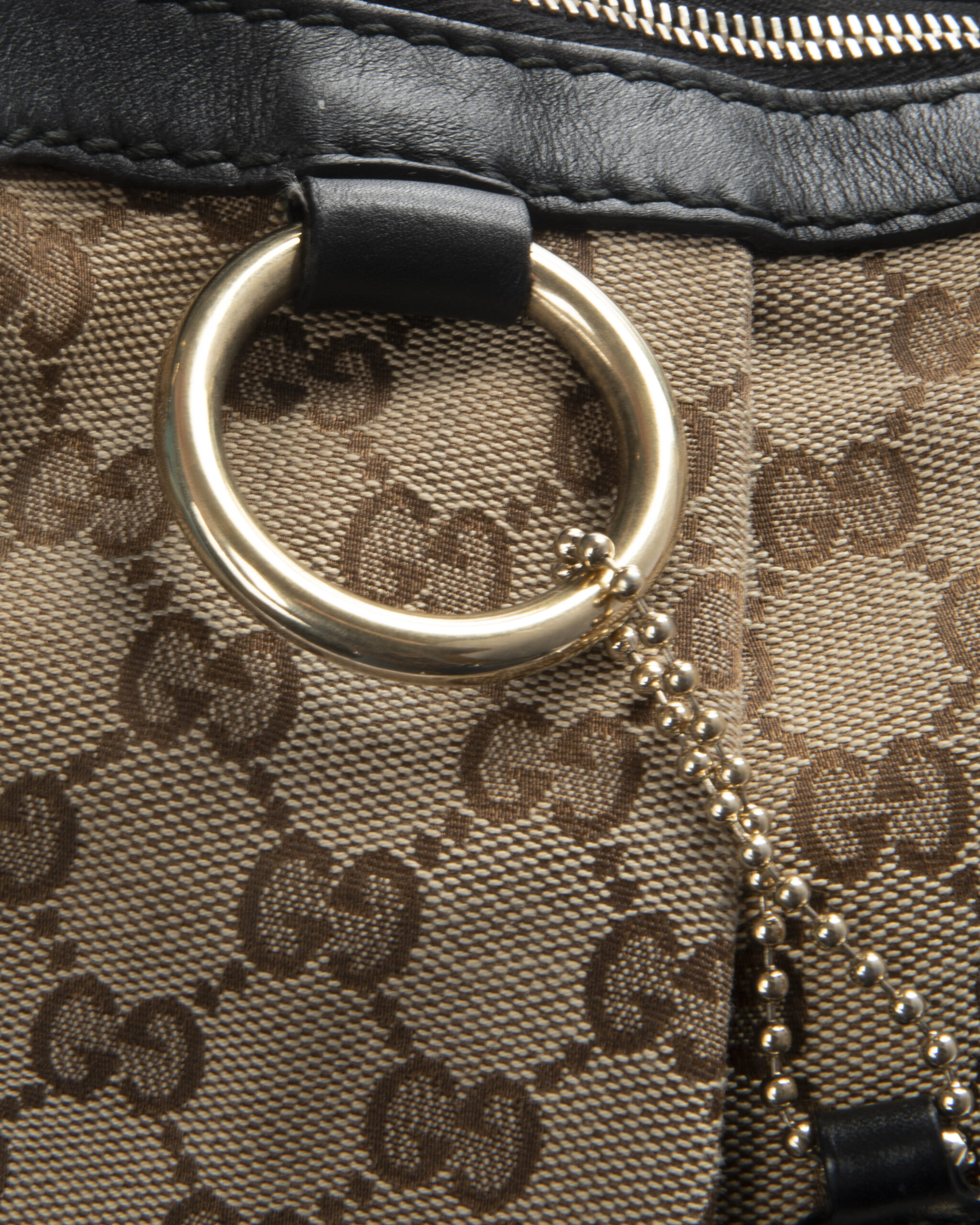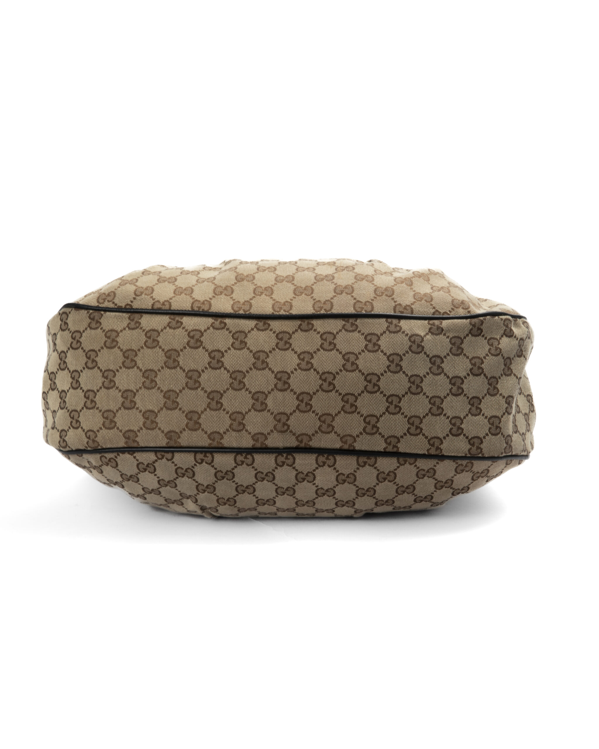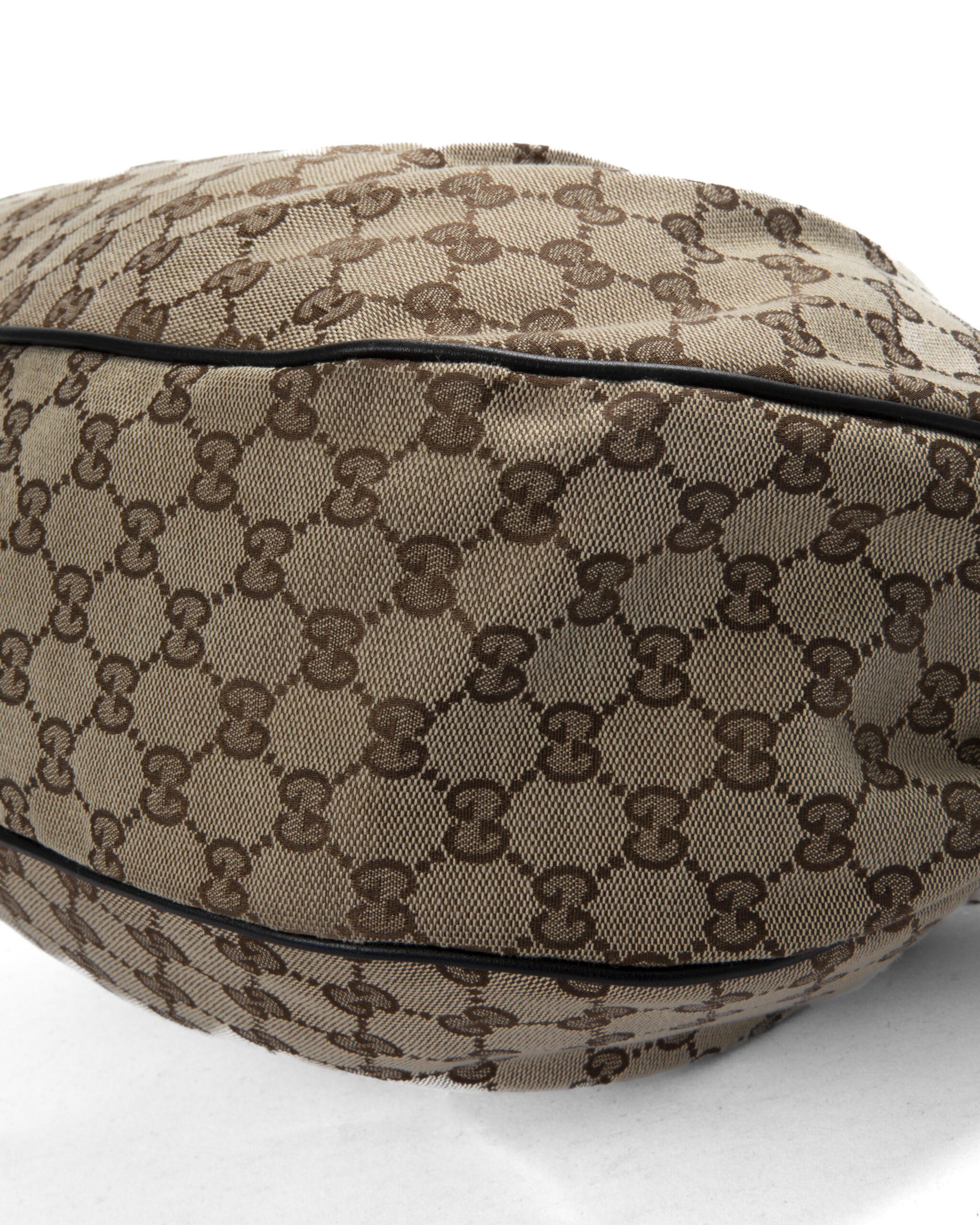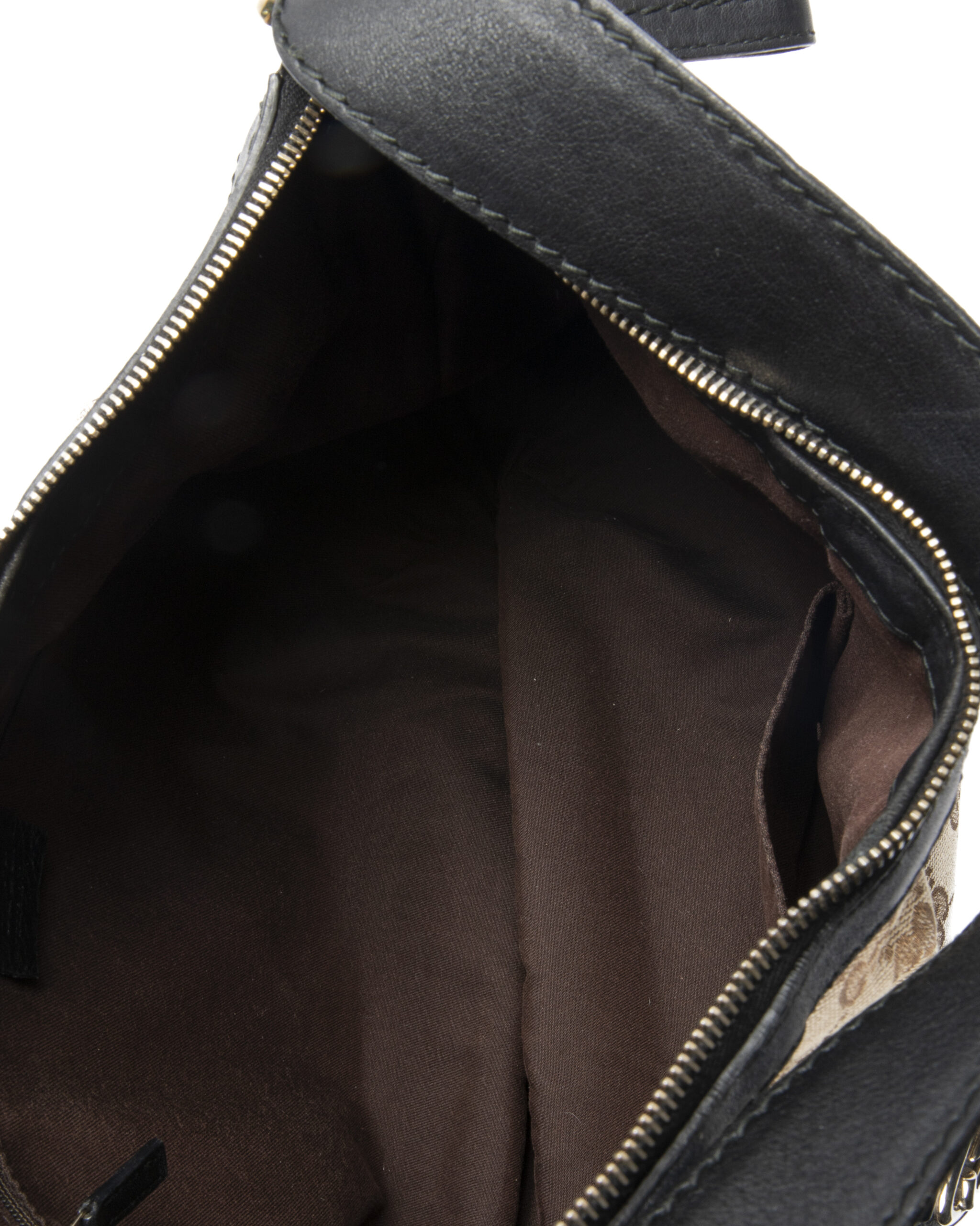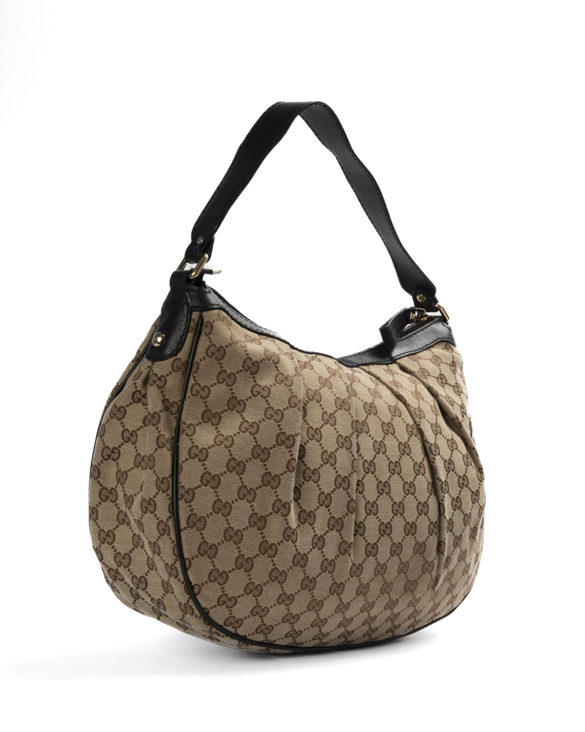 Borsa firmata Gucci, linea Sukey, modello hobo nella misura medium, realizzata in tela marrone nella fantasia GG Supreme con inserti in pelle nero e hardware dorato. Dotata di una chiusura a zip, internamente rivestita in tessuto marrone con comode tasche, la borsa è abbastanza capiente. Munita di un manico in pelle, per una comoda portata a spalla o a mano. L’articolo si presenta in ottime condizioni.