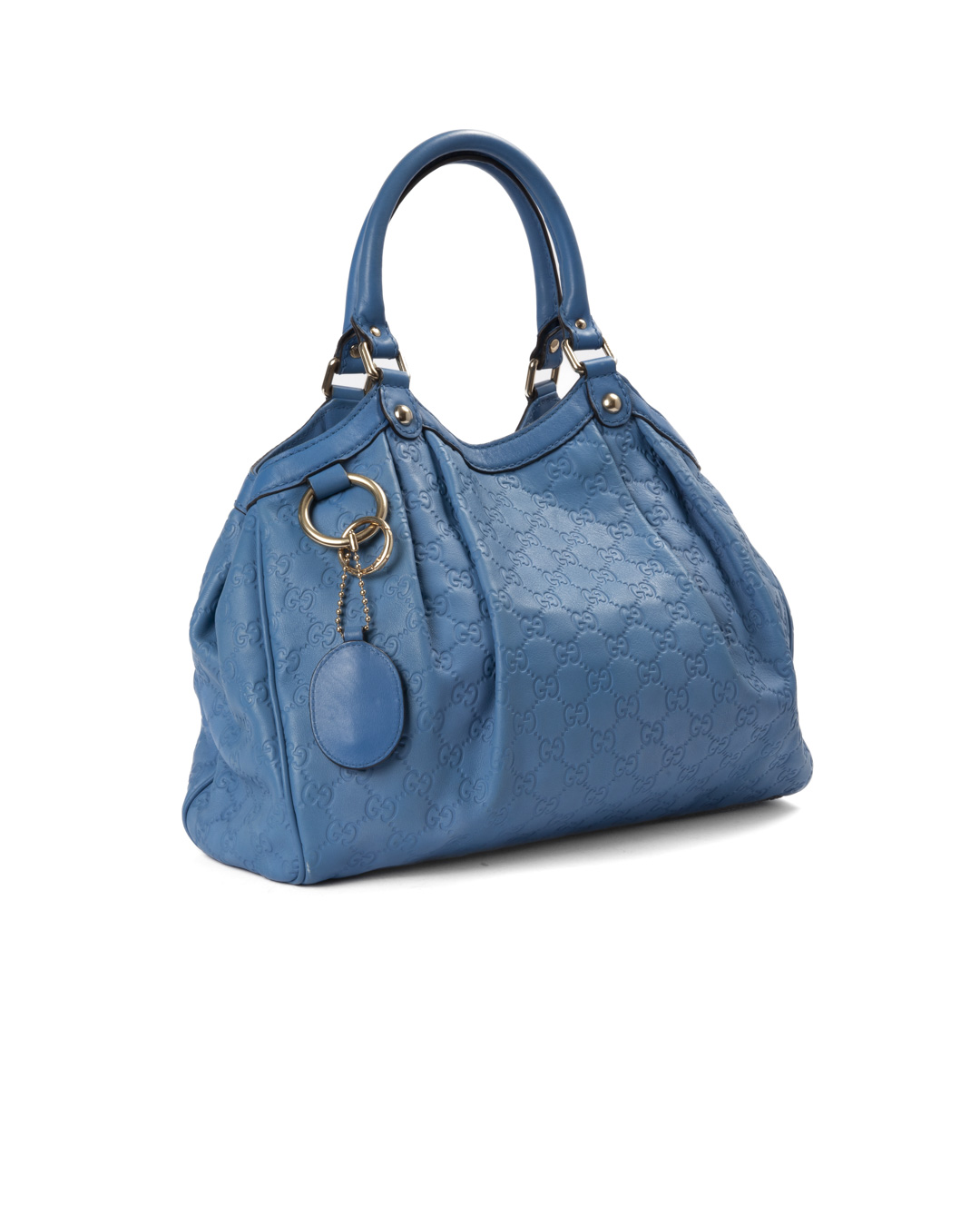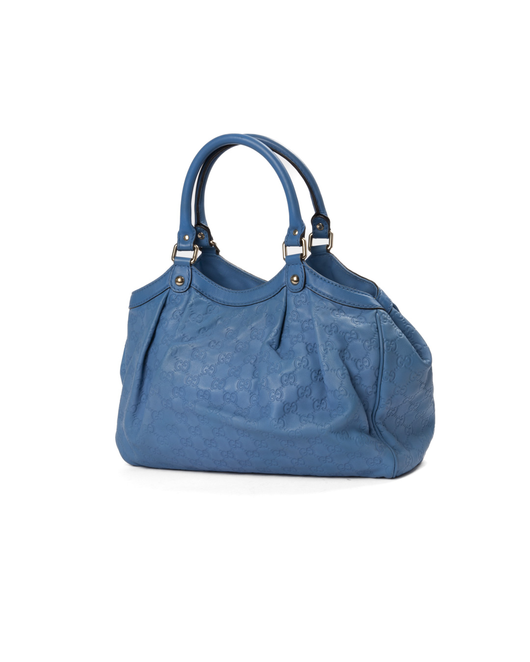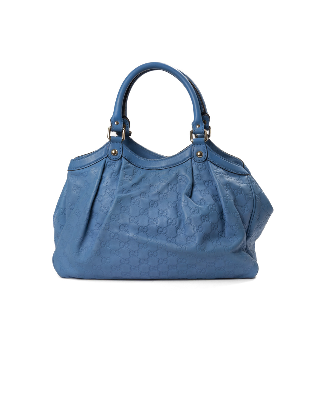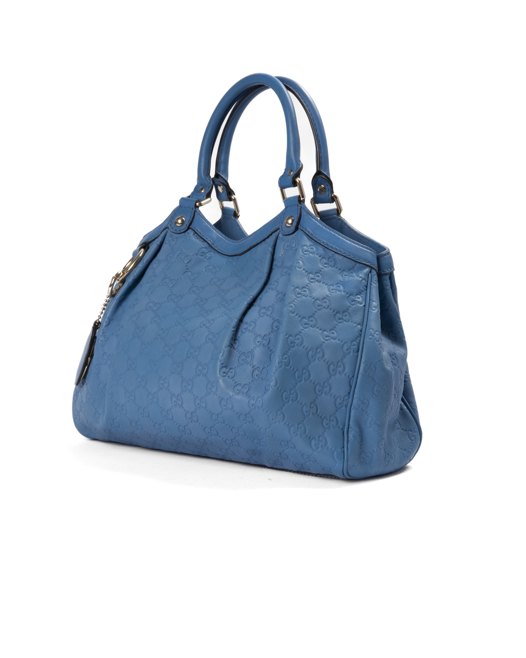 Borsa firmata Gucci, modello Sukey nella misura medium, realizzata in pelle azzurra nella fantasia GG Guccissima con hardware dorato. Dotata di una chiusura calamitata, internamente rivestita in tela beige con comoda tasca, la borsa è abbastanza capiente. Munita di doppio manico in pelle, per una comoda portata a mano. L’articolo si presenta in buone condizioni.
