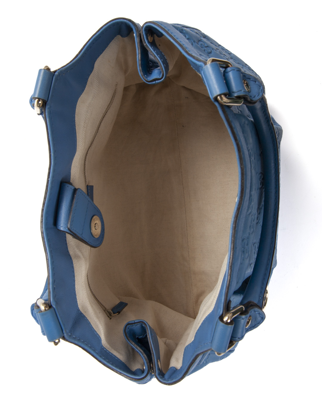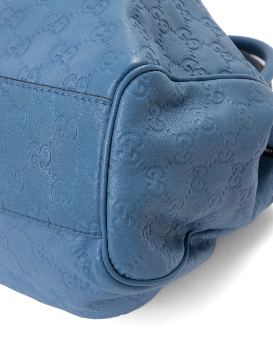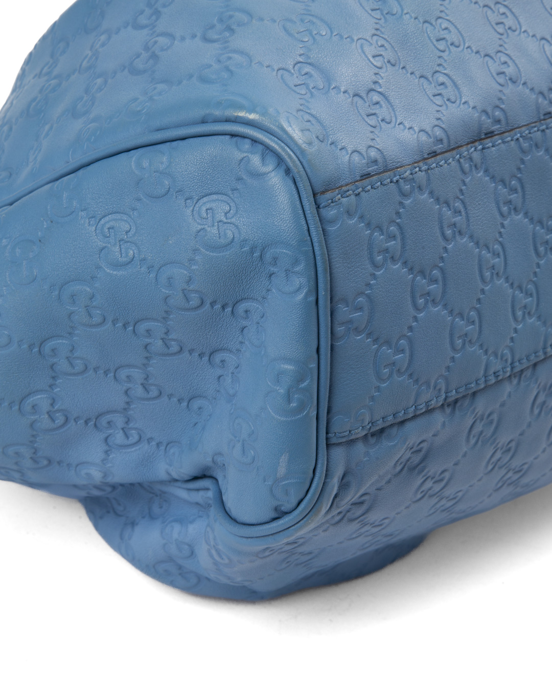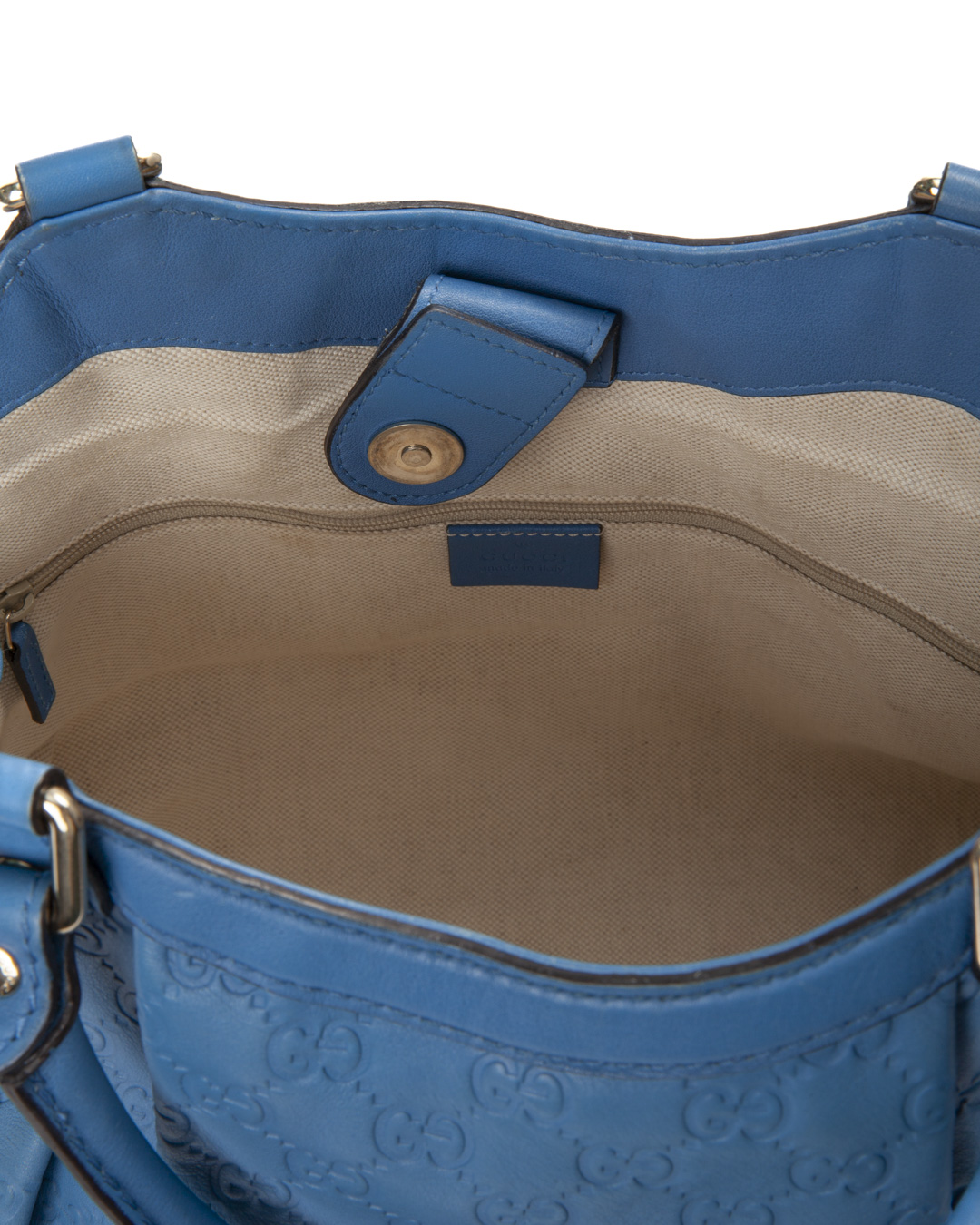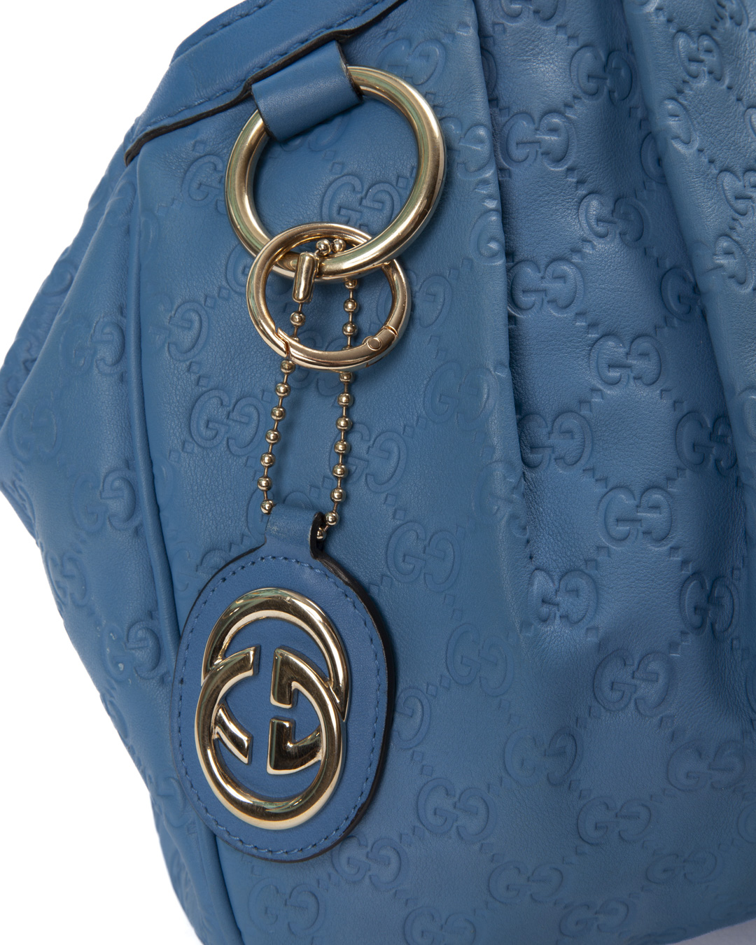Borsa firmata Gucci, modello Sukey nella misura medium, realizzata in pelle azzurra nella fantasia GG Guccissima con hardware dorato. Dotata di una chiusura calamitata, internamente rivestita in tela beige con comoda tasca, la borsa è abbastanza capiente. Munita di doppio manico in pelle, per una comoda portata a mano. L’articolo si presenta in buone condizioni.
