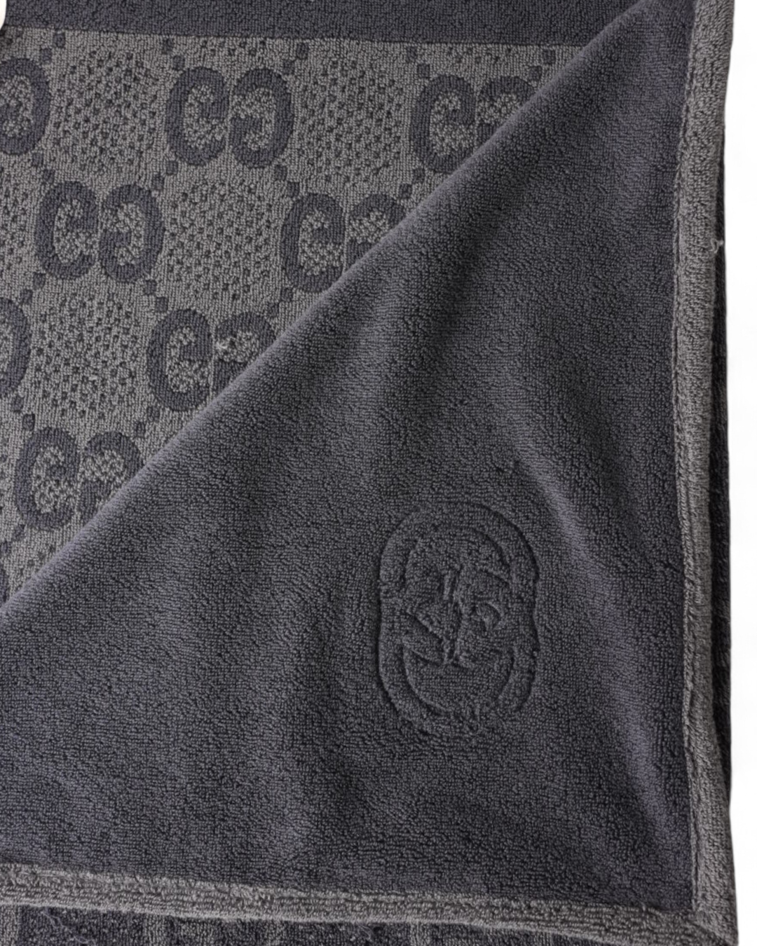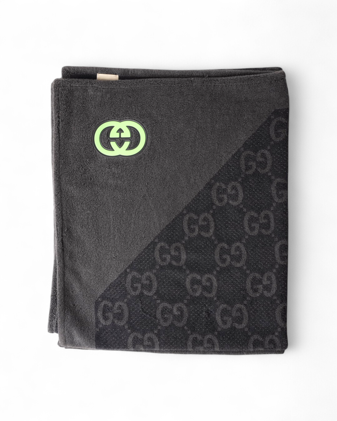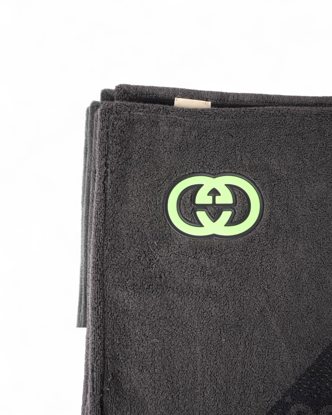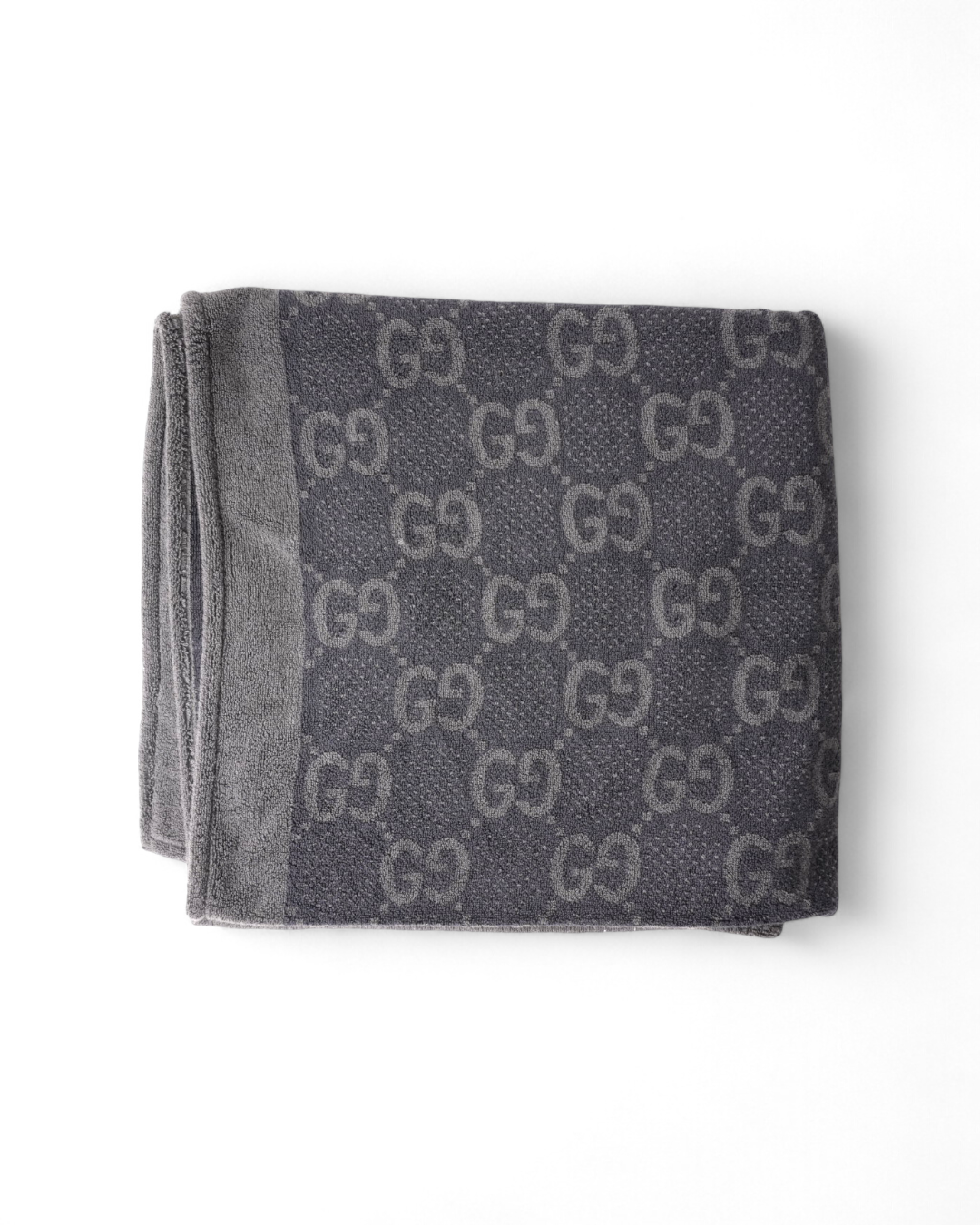 Telo Mare firmato Gucci, realizzato in spugna grigio con classica fantasia GGJumbo. Misura 95 centimetri di lunghezza e 165 centimetri di altezza. L’articolo si presenta in ottime condizioni.