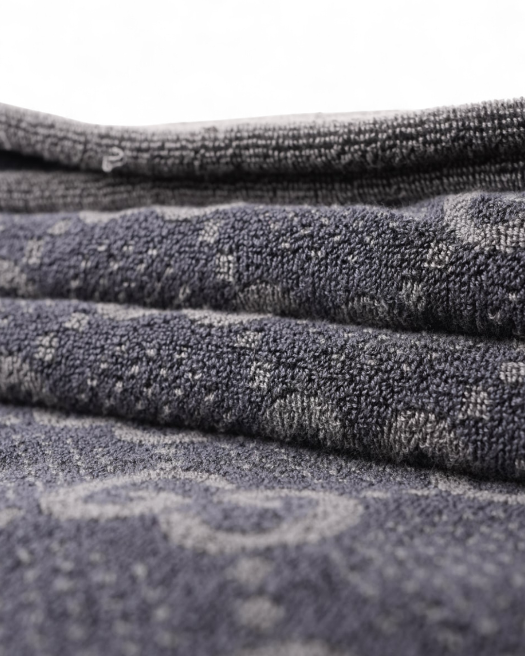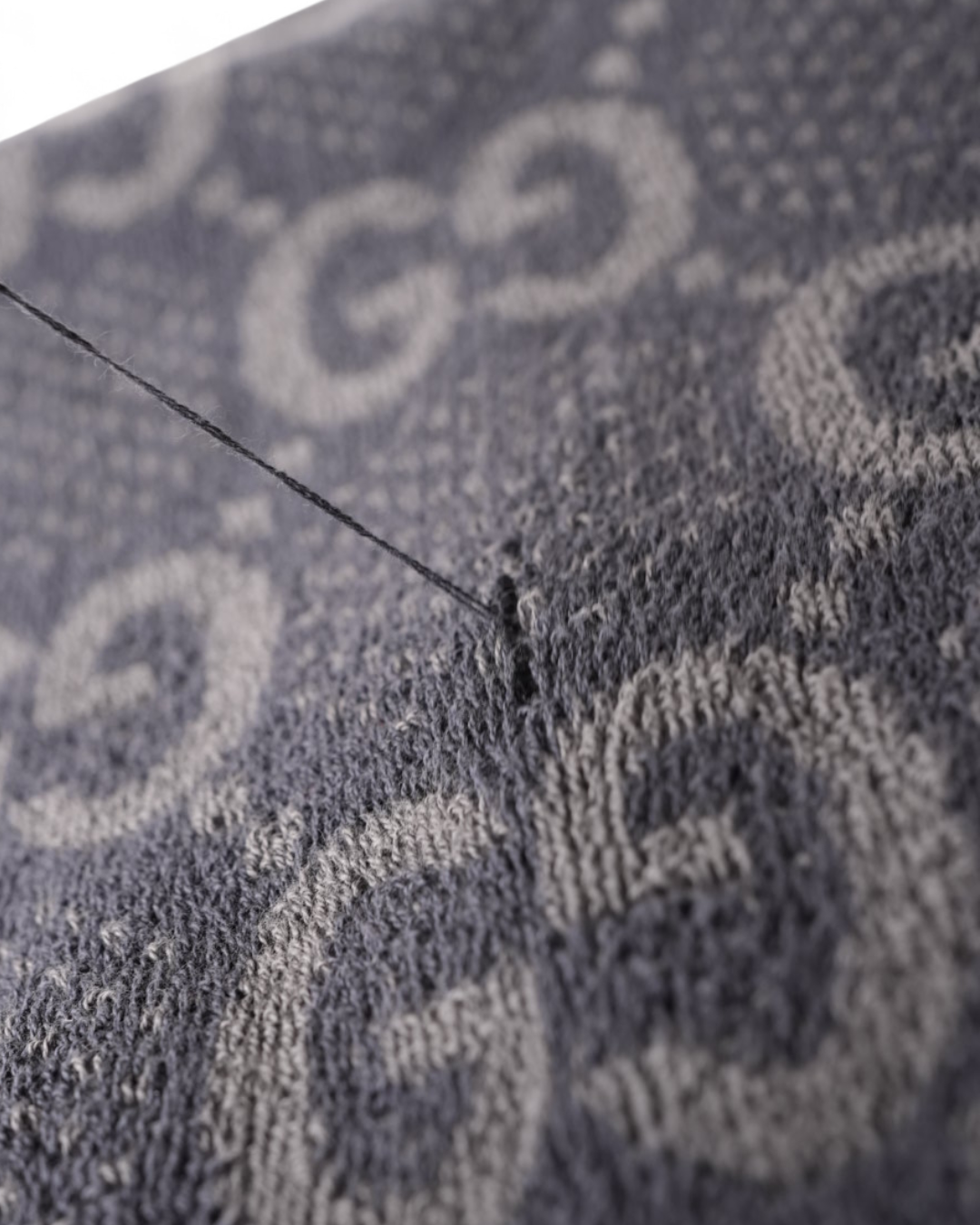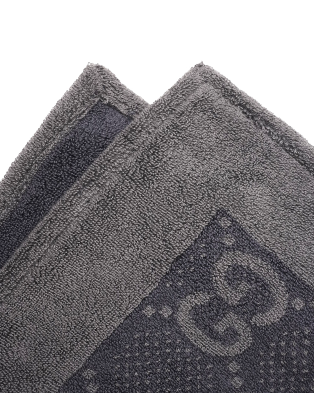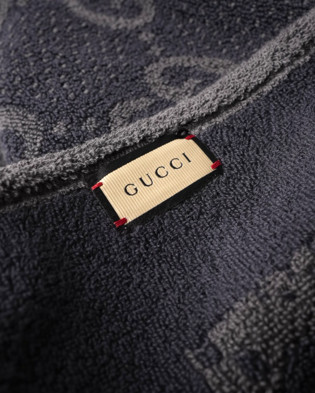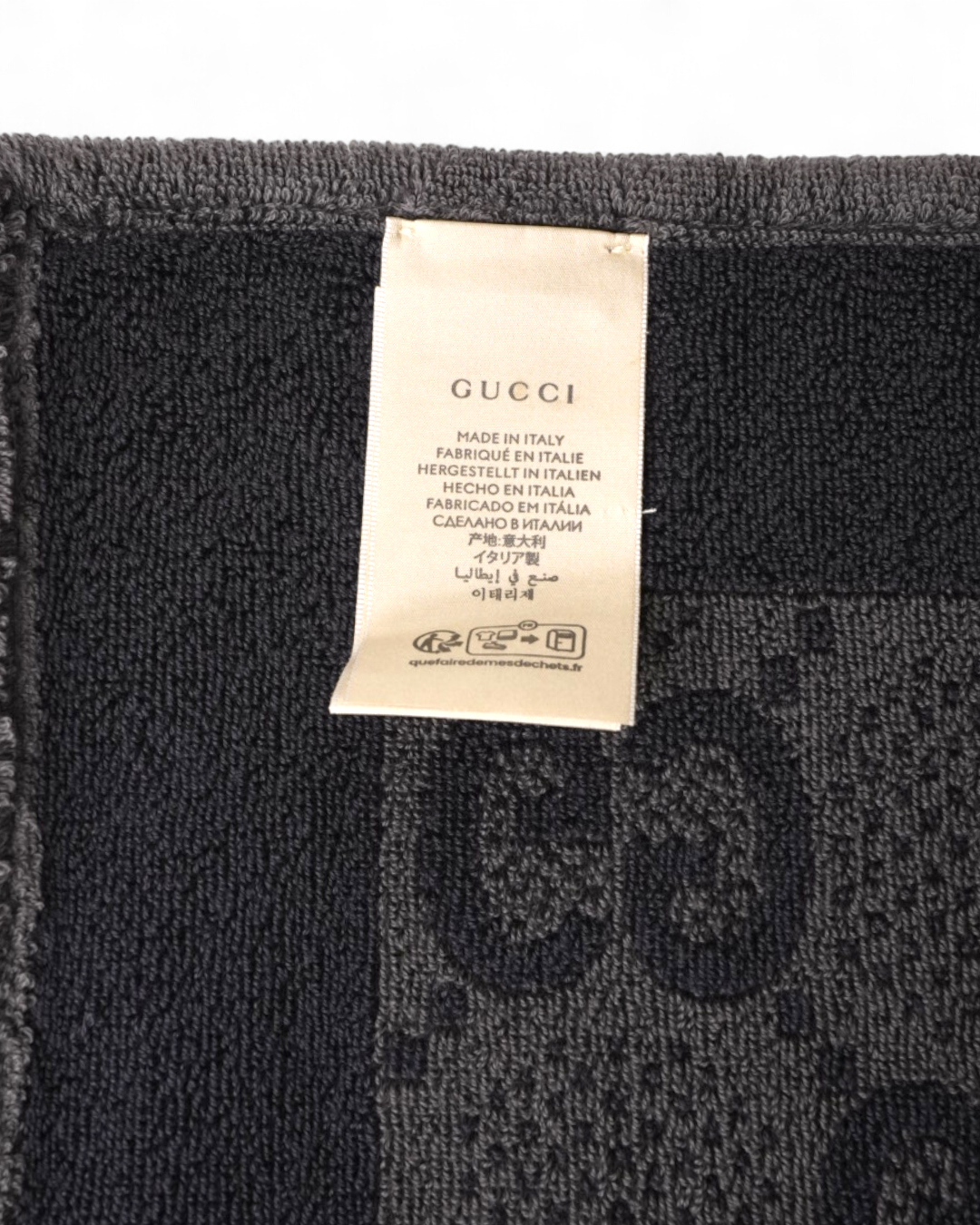 Telo Mare firmato Gucci, realizzato in spugna grigio con classica fantasia GGJumbo. Misura 95 centimetri di lunghezza e 165 centimetri di altezza. L’articolo si presenta in ottime condizioni.