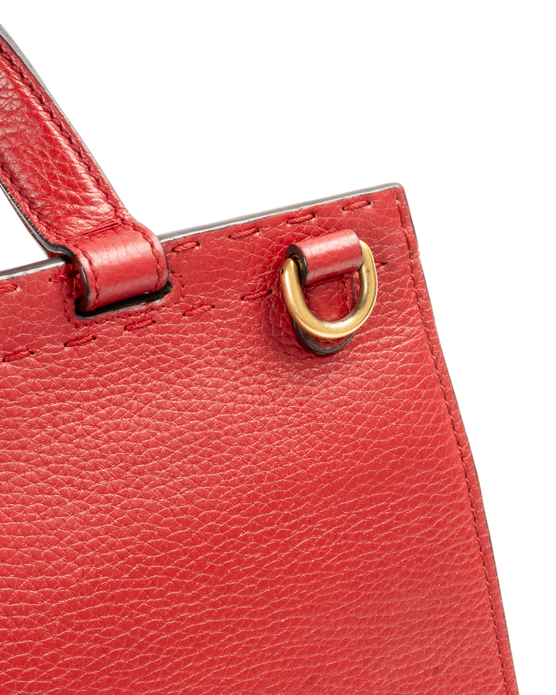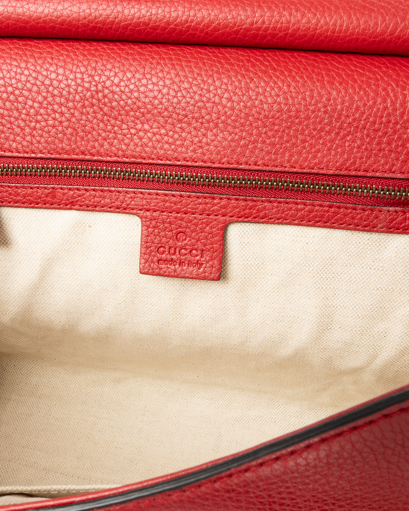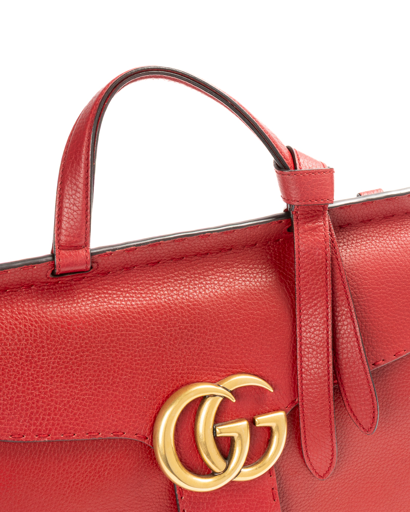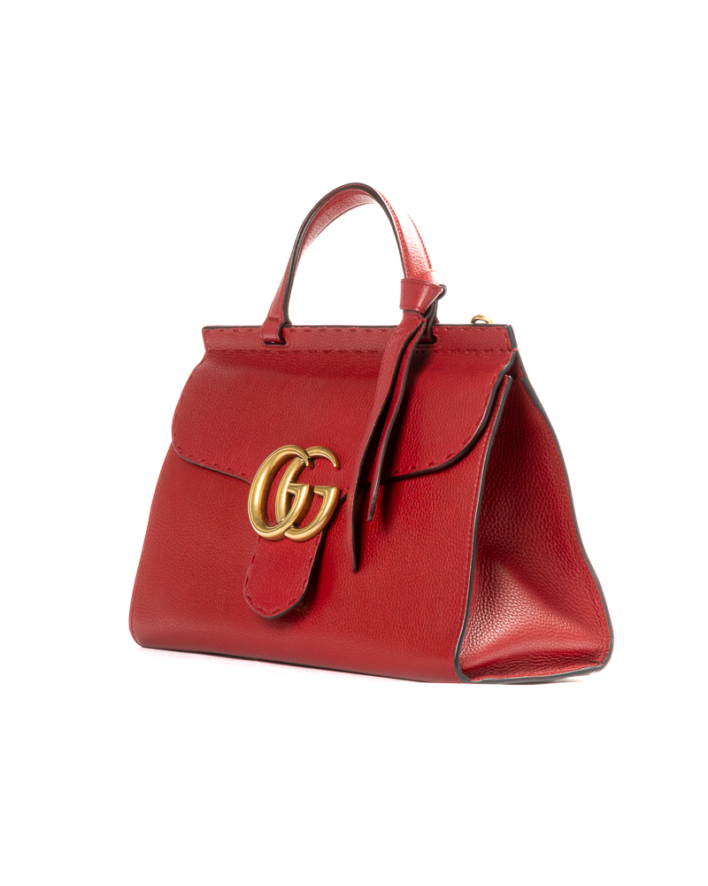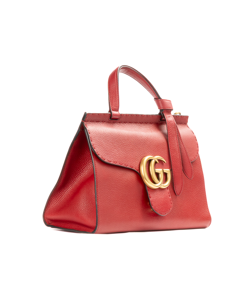 Borsa firmata Gucci, linea Marmont, modello Top Handle nella misura medium, realizzata in pelle martellata rossa con hardware dorato. Dotata di una patta con classico logo del brand "GG" e chiusura ad incastro, internamente rivestita in tela beige con comode tasche, la borsa è abbastanza capiente. Munita di un manico e di una tracolla rimovibile e regolabile, per una comoda portata a spalla o a mano. L'articolo si presenta in ottime condizioni.