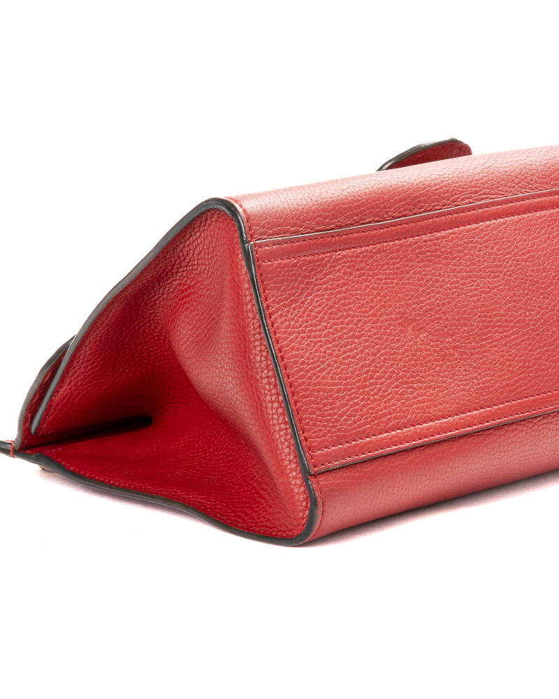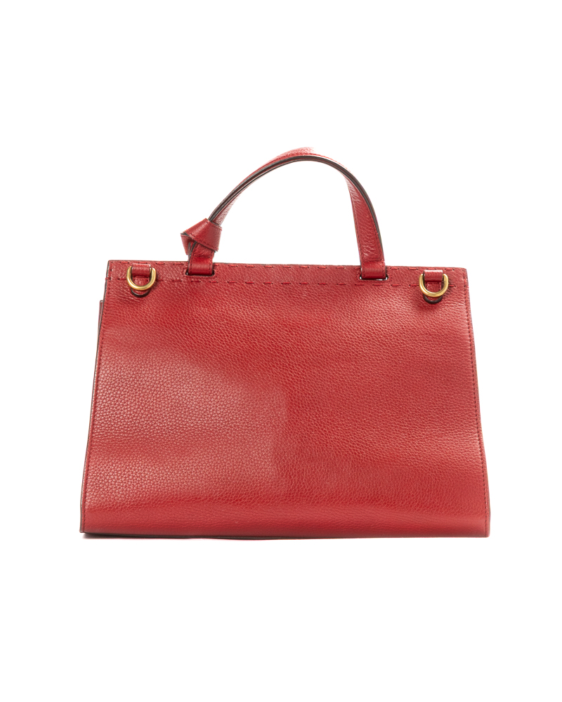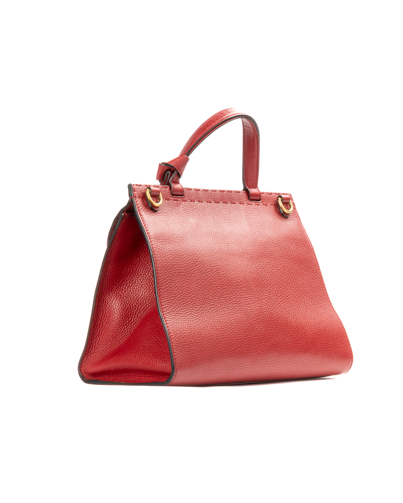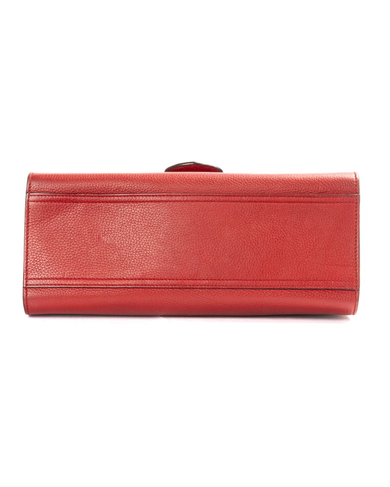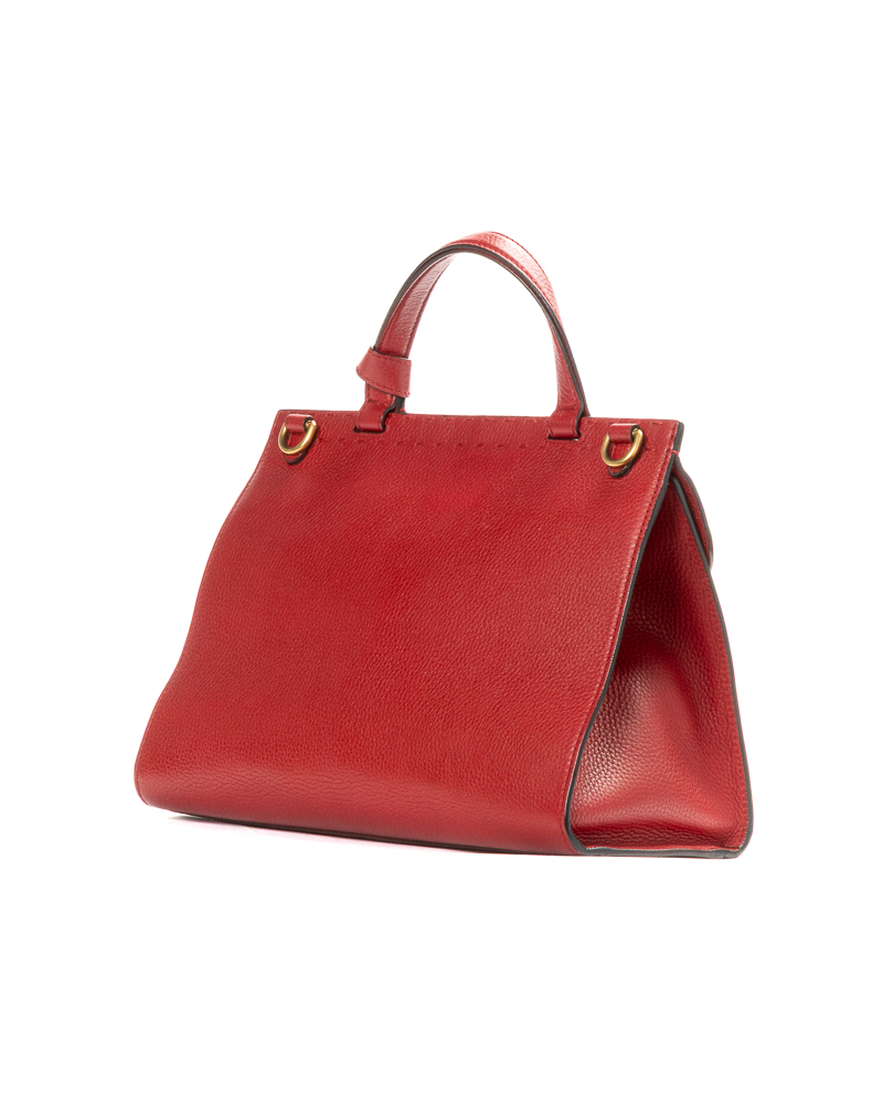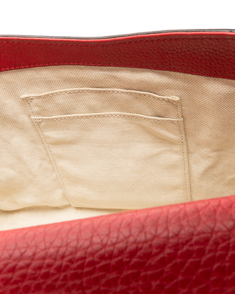 Borsa firmata Gucci, linea Marmont, modello Top Handle nella misura medium, realizzata in pelle martellata rossa con hardware dorato. Dotata di una patta con classico logo del brand "GG" e chiusura ad incastro, internamente rivestita in tela beige con comode tasche, la borsa è abbastanza capiente. Munita di un manico e di una tracolla rimovibile e regolabile, per una comoda portata a spalla o a mano. L'articolo si presenta in ottime condizioni.