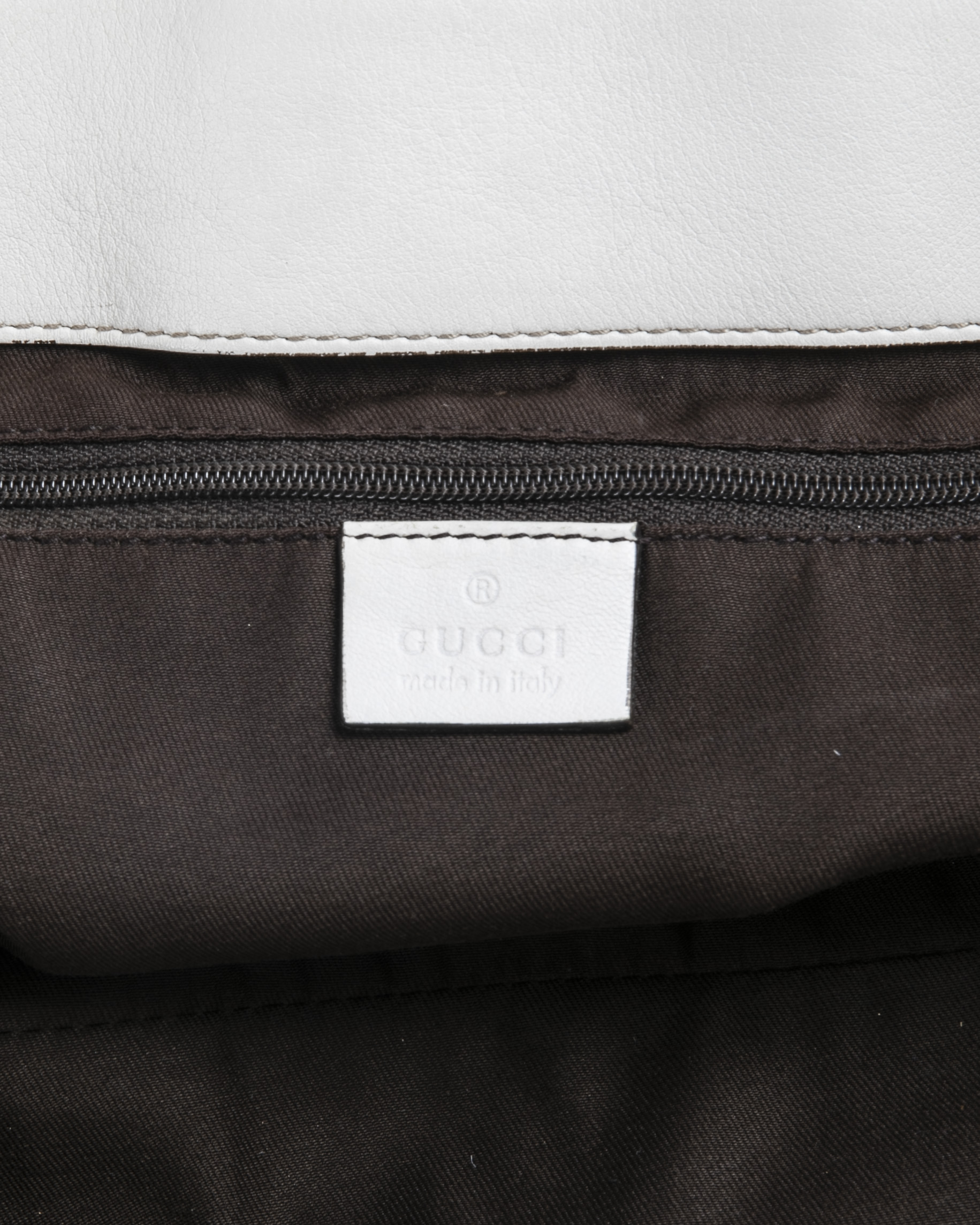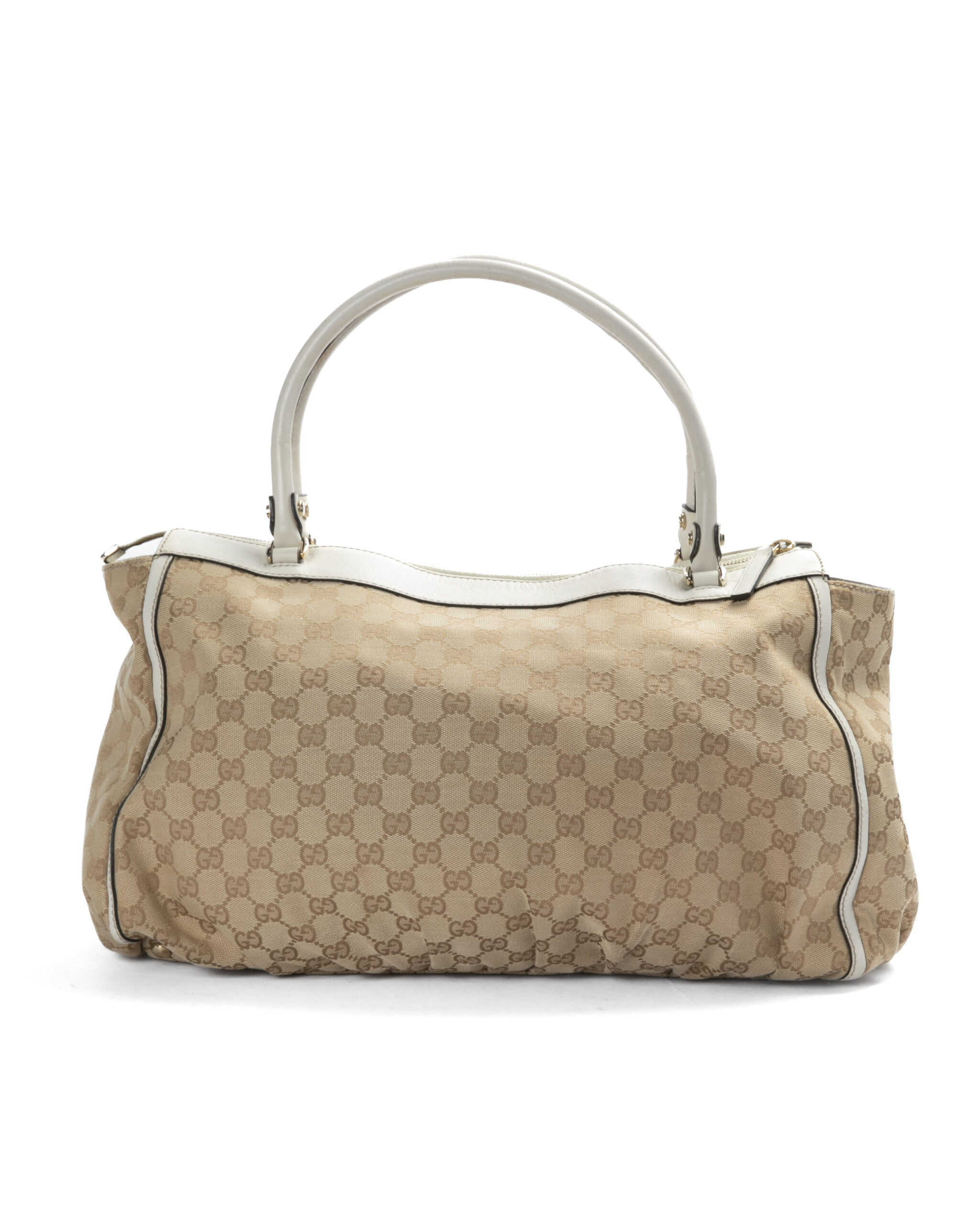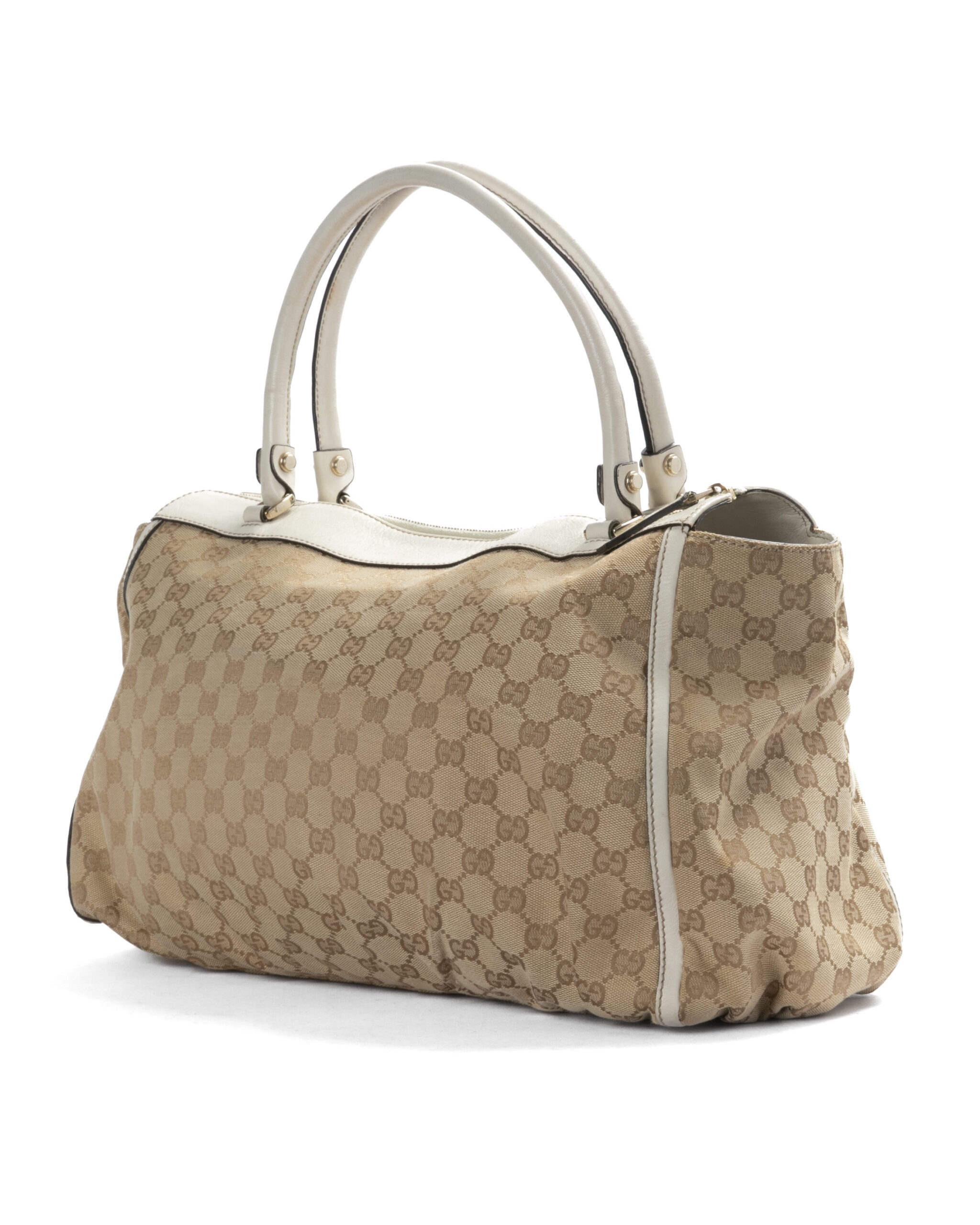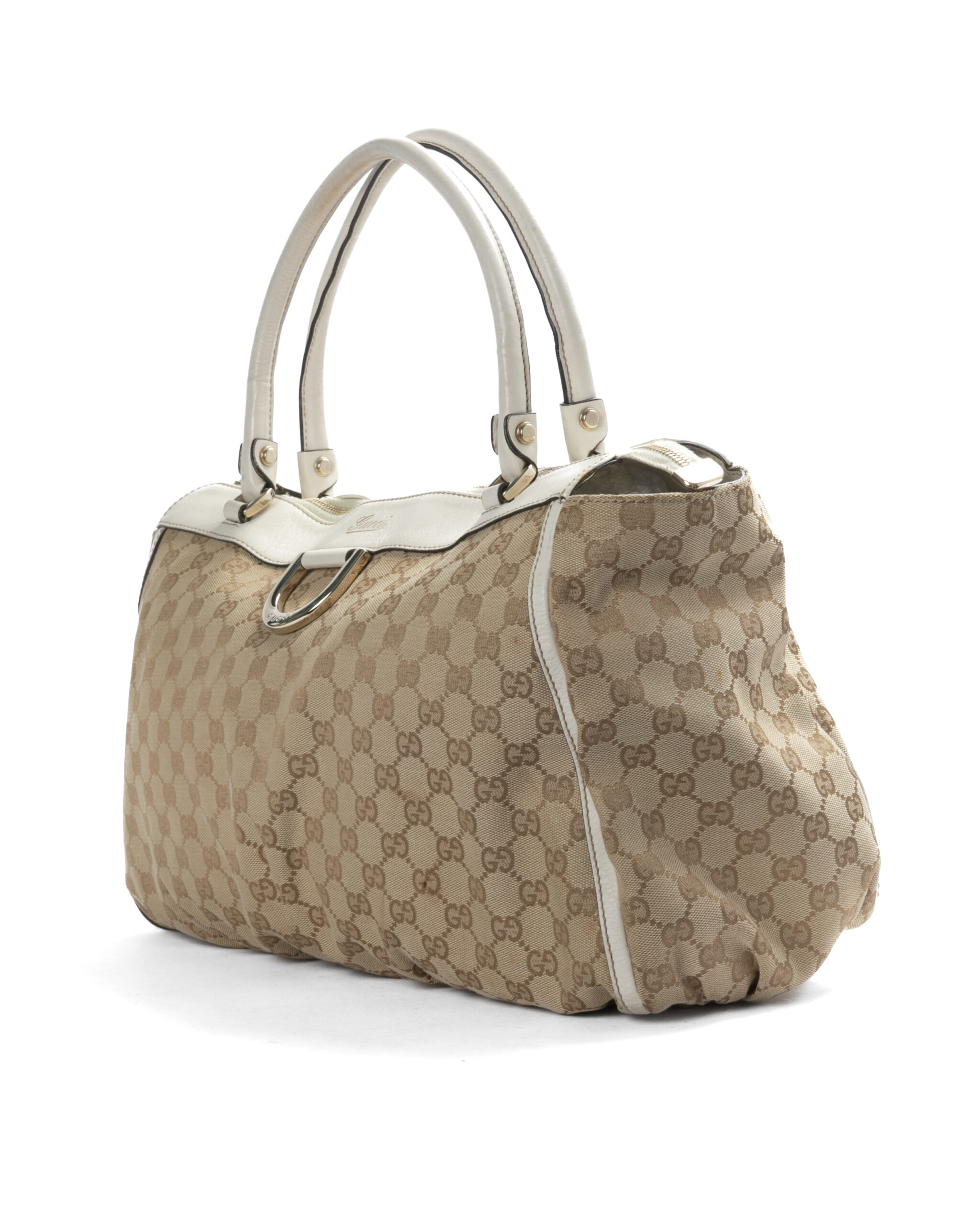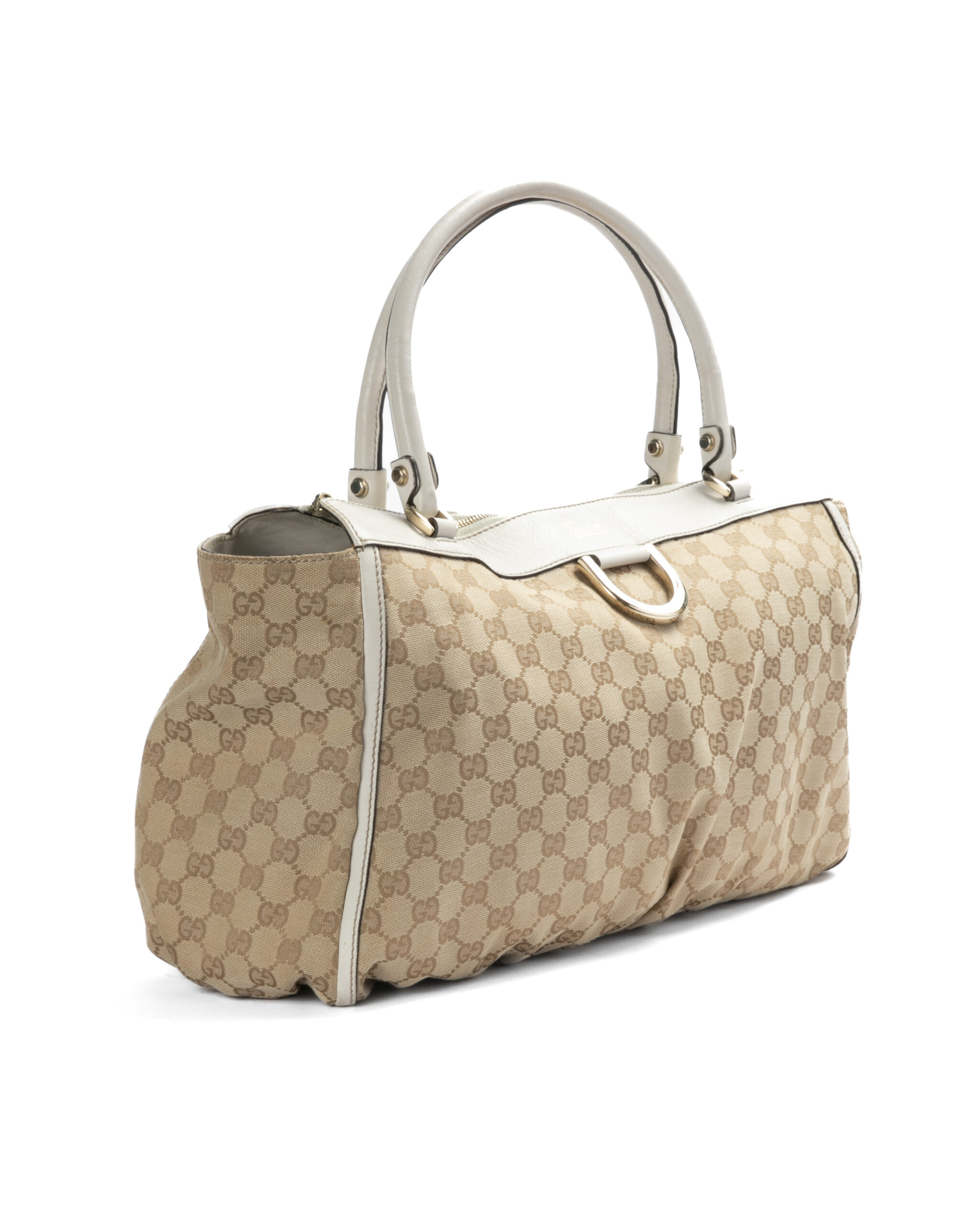 Borsa firmata Gucci, linea D-Ring, modello Abbey nella misura large, realizzata in tela nella classica fantasia GG Supreme con inserti in pelle bianca e hardware dorato. Dotata di una chiusura superiore a zip, internamente rivestita in tessuto marrone con due comode tasche, la borsa è abbastanza capiente. Munita di doppio manico in pelle, per una comoda portata a spalla o a mano.