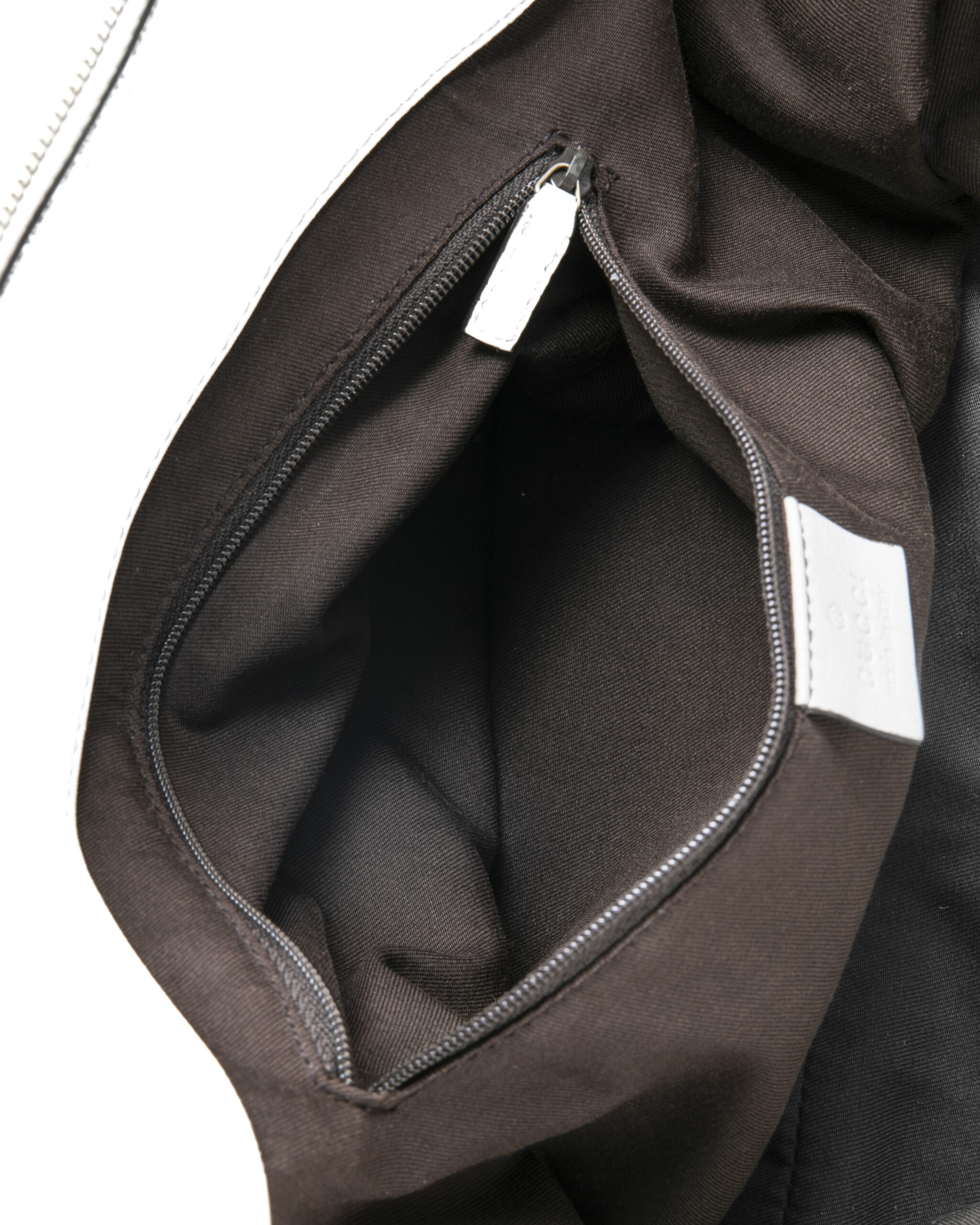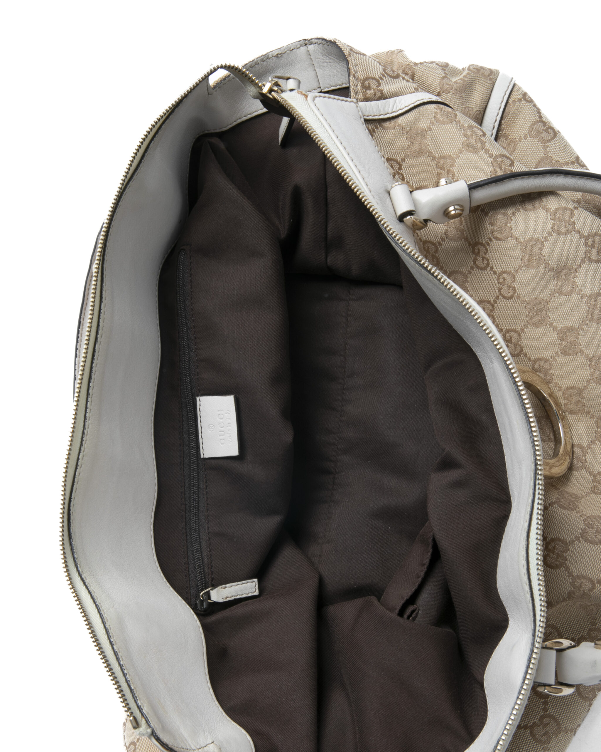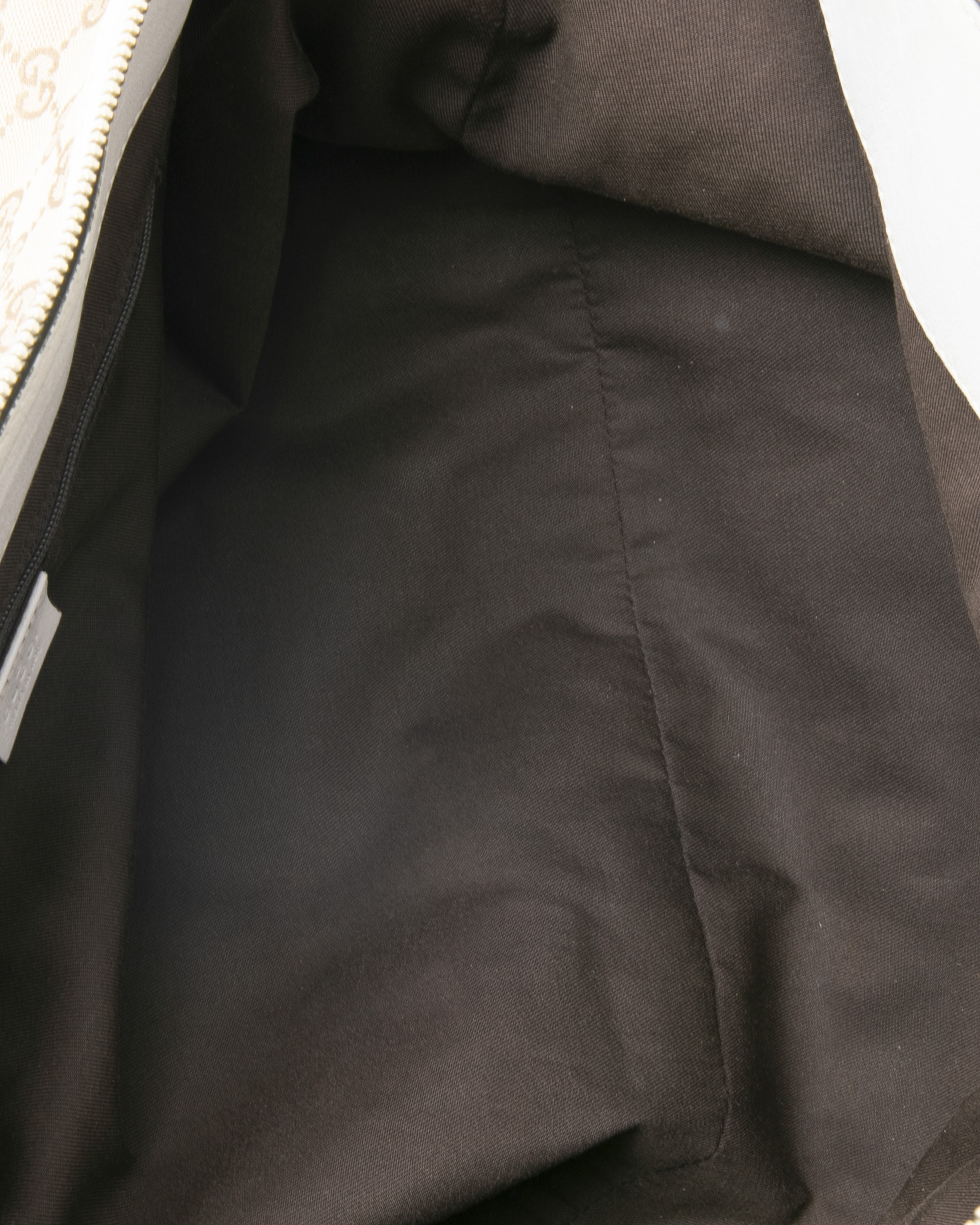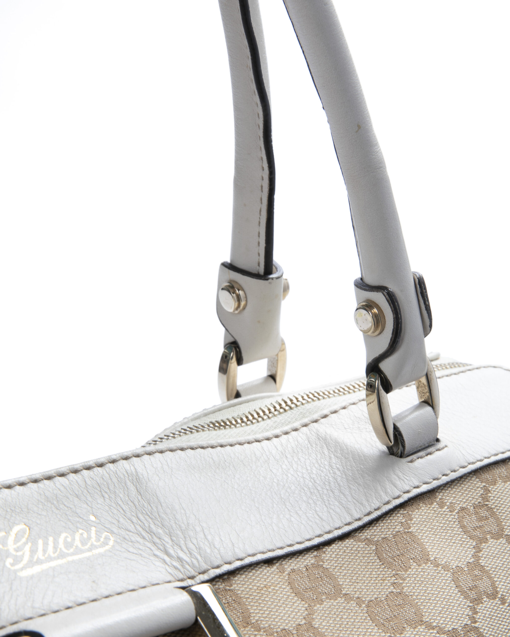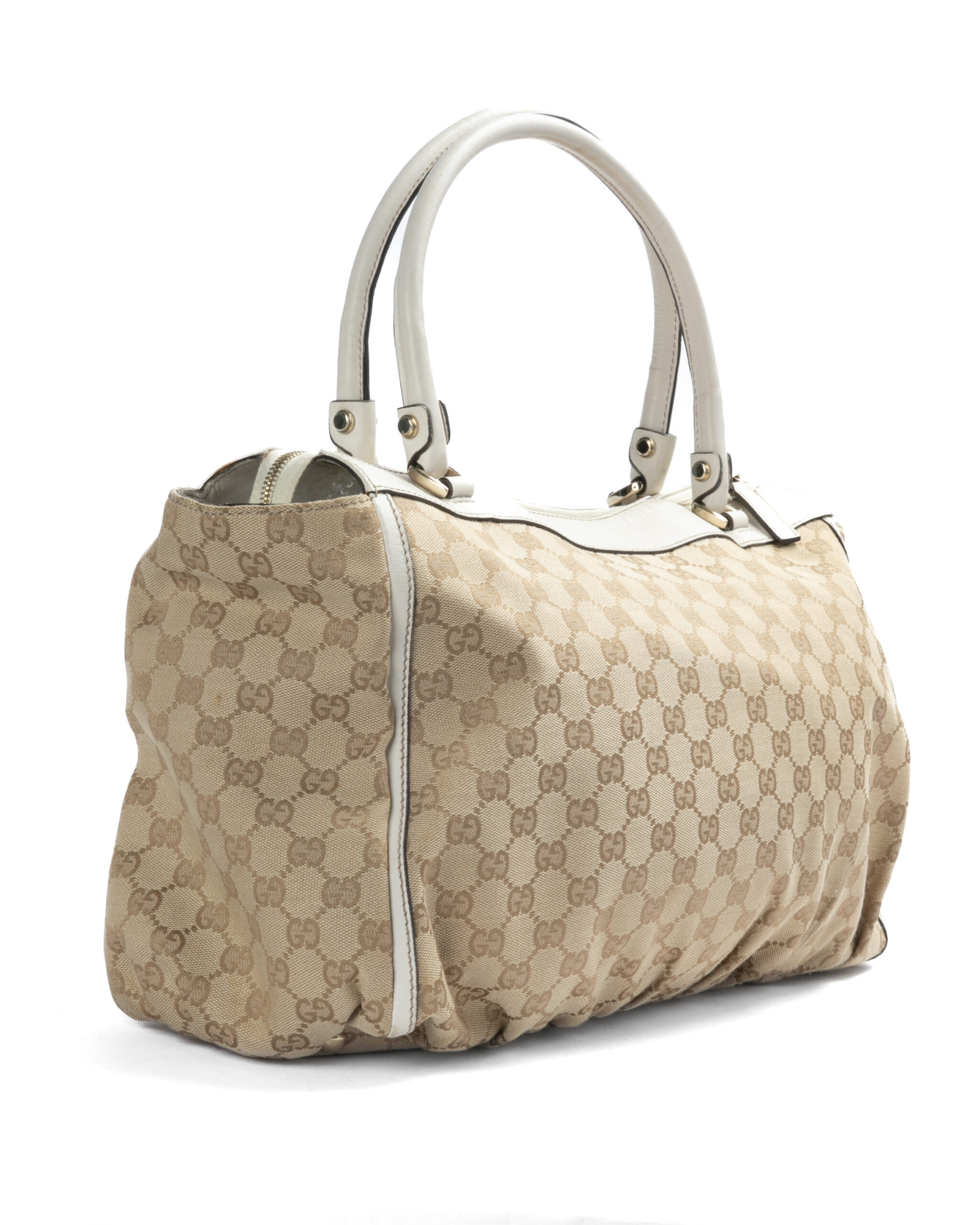 Borsa firmata Gucci, linea D-Ring, modello Abbey nella misura large, realizzata in tela nella classica fantasia GG Supreme con inserti in pelle bianca e hardware dorato. Dotata di una chiusura superiore a zip, internamente rivestita in tessuto marrone con due comode tasche, la borsa è abbastanza capiente. Munita di doppio manico in pelle, per una comoda portata a spalla o a mano.