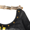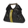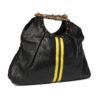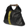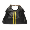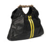 Borsa firmata Gucci, linea Bamboo, modello Tote nella misura medium, realizzata in pelle nera con inserti gialli e hardware dorato. Non è dotata di nessuna chiusura, internamente rivestita in raso nero, la borsa è abbastanza capiente. Munita di un manico in bamboo, per una comoda portata a mano. L’articolo si presenta in buone condizioni.
