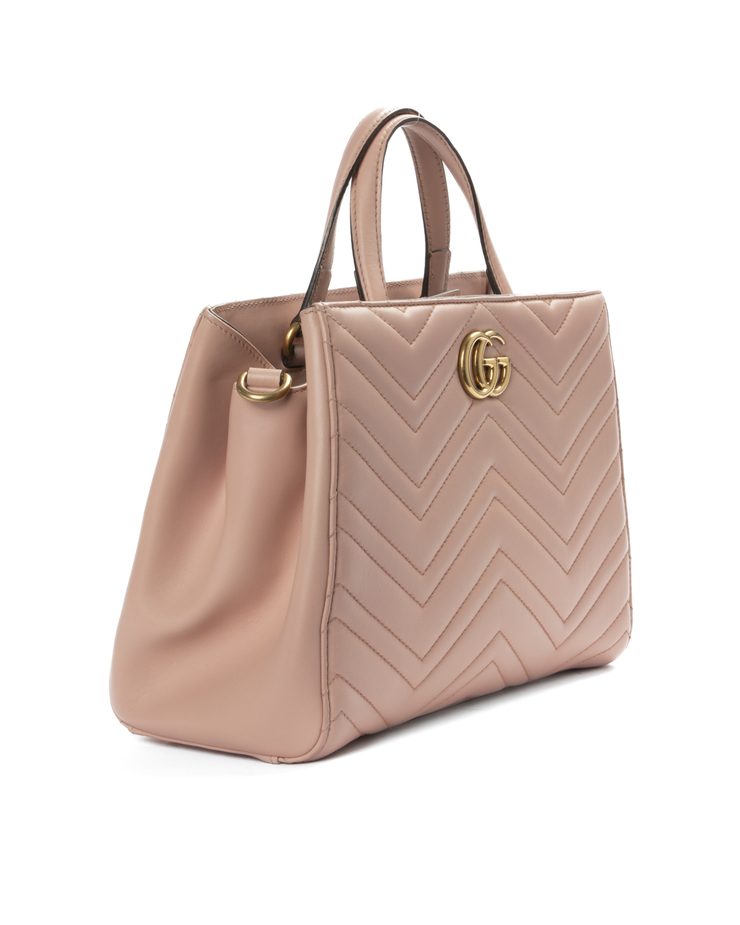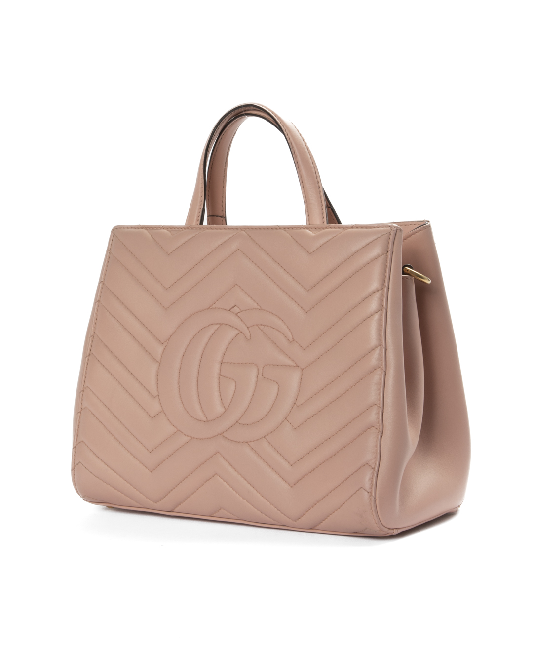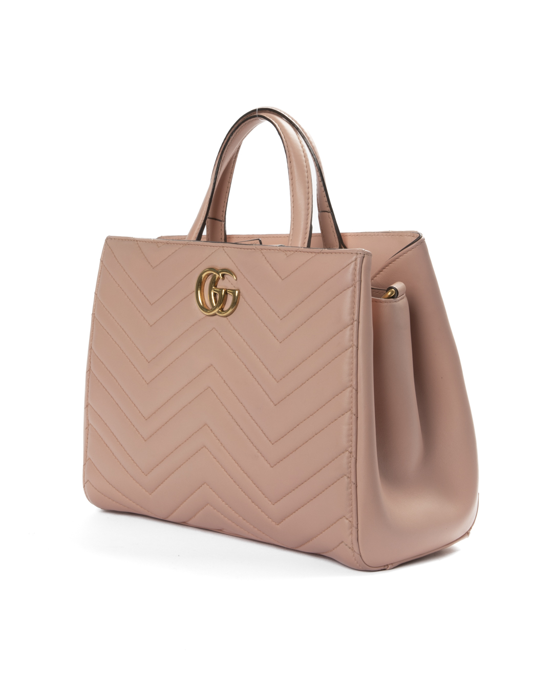Borsa firmata Gucci, linea Marmont, modello Tote nella misura small, realizzata in pelle rosa con motivo matelassè e hardware dorato. Dotata di una chiusura magnetica, internamente rivestita in tessuto scamosciato grigio con comode tasche, la borsa è abbastanza capiente. Munita di doppio manico e di una tracolla rimovibile e regolabile, per una comoda portata a mano o a spalla. Arricchita dal classico logo del brand "GG" sulla parte frontale. L'articolo si presenta in ottime condizioni.