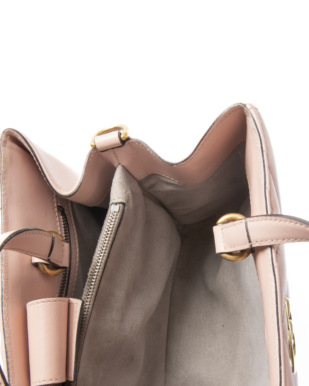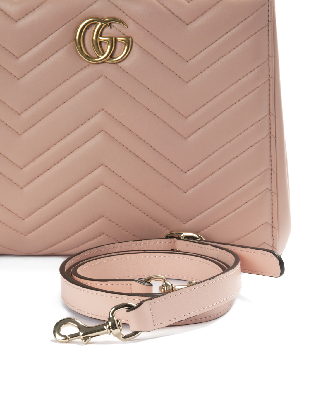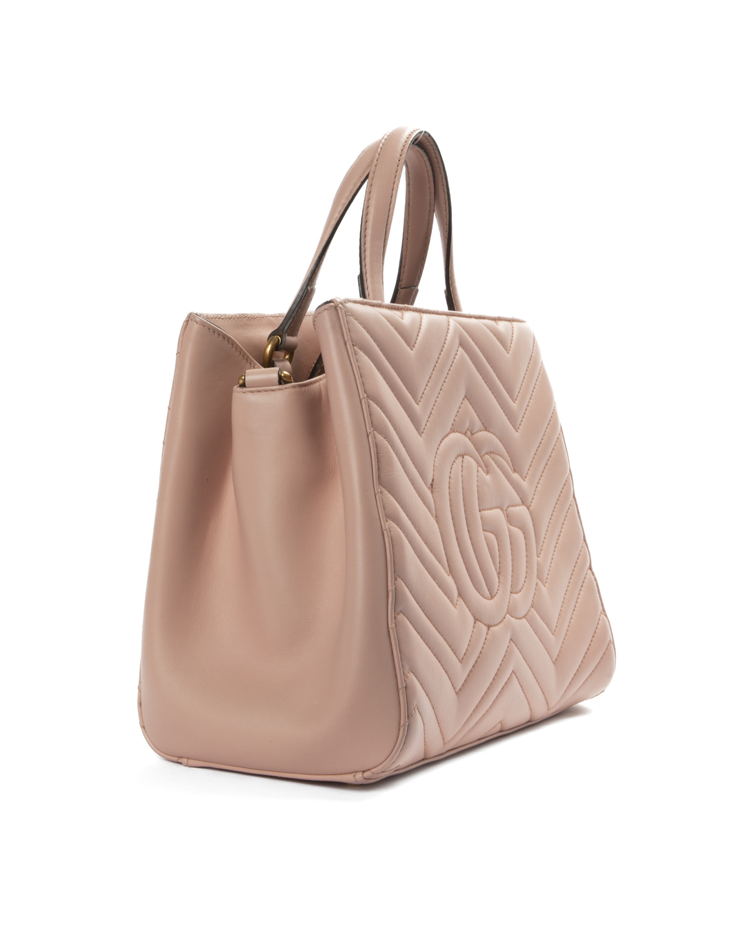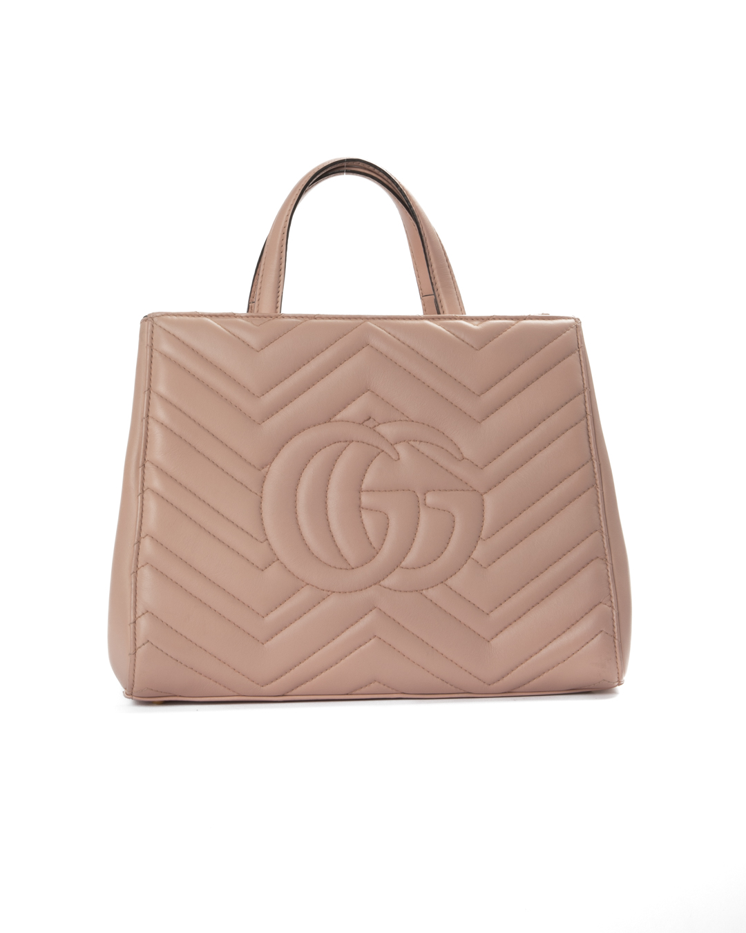 Borsa firmata Gucci, linea Marmont, modello Tote nella misura small, realizzata in pelle rosa con motivo matelassè e hardware dorato. Dotata di una chiusura magnetica, internamente rivestita in tessuto scamosciato grigio con comode tasche, la borsa è abbastanza capiente. Munita di doppio manico e di una tracolla rimovibile e regolabile, per una comoda portata a mano o a spalla. Arricchita dal classico logo del brand "GG" sulla parte frontale. L'articolo si presenta in ottime condizioni.