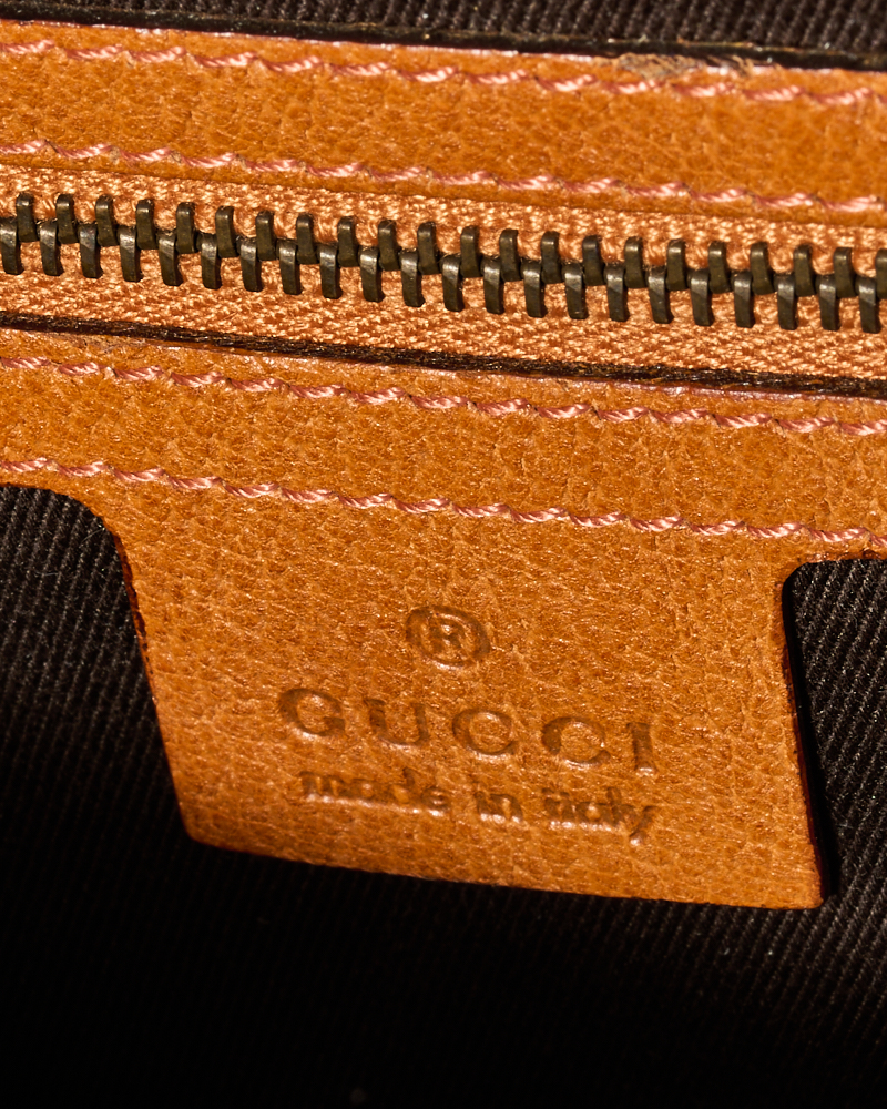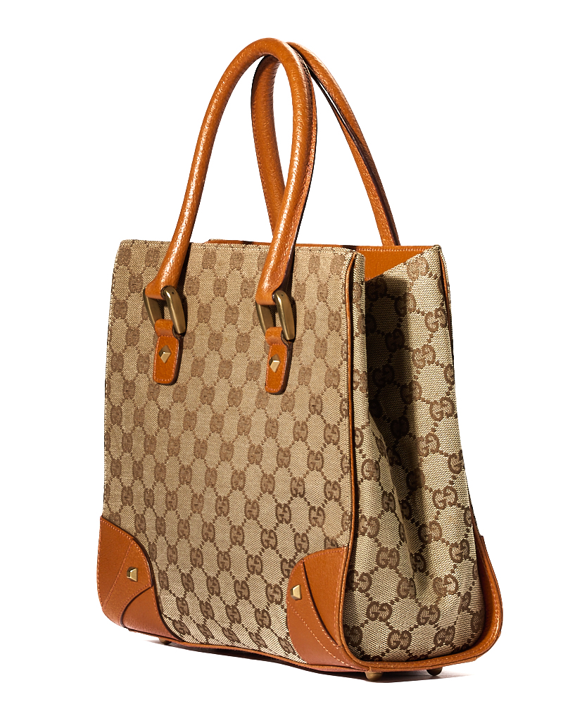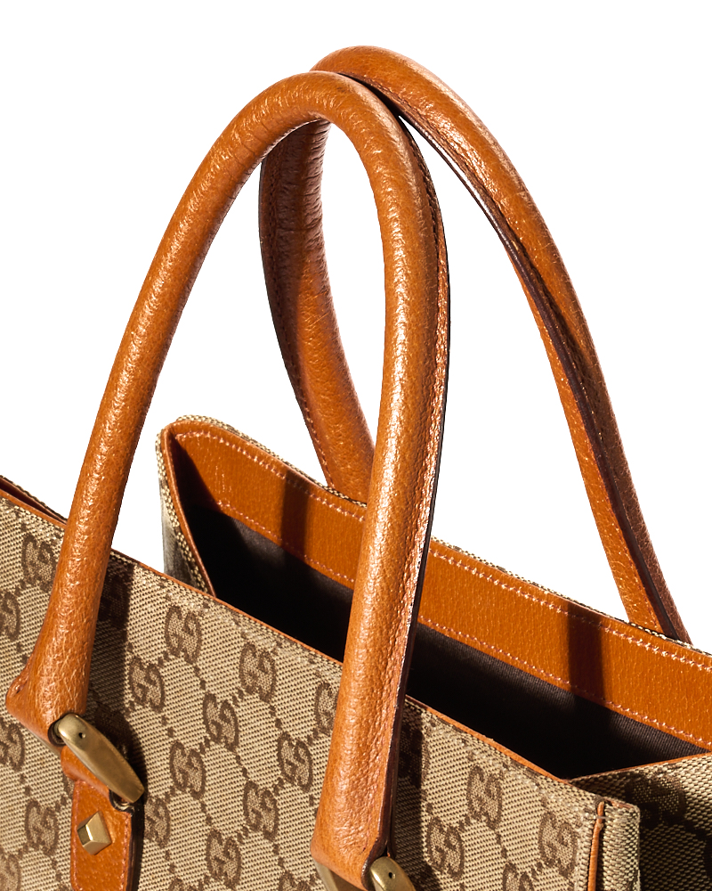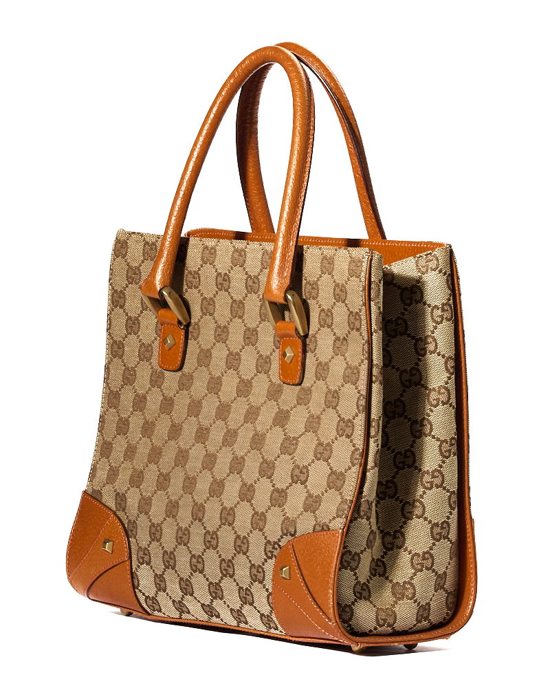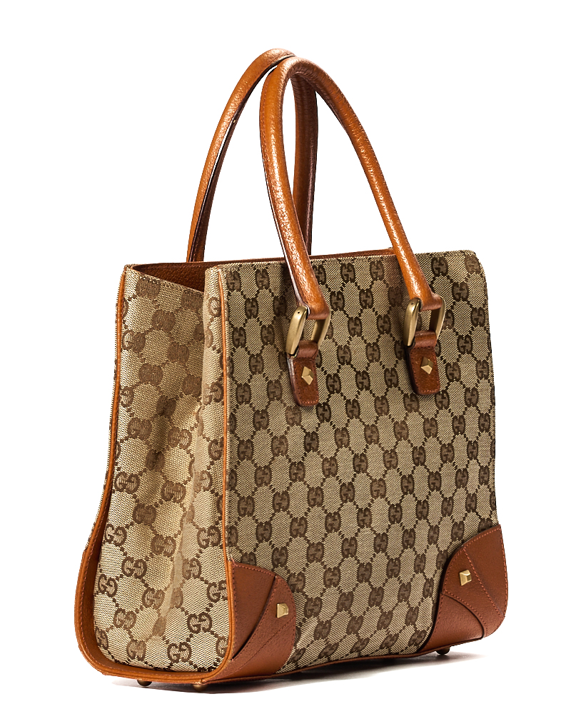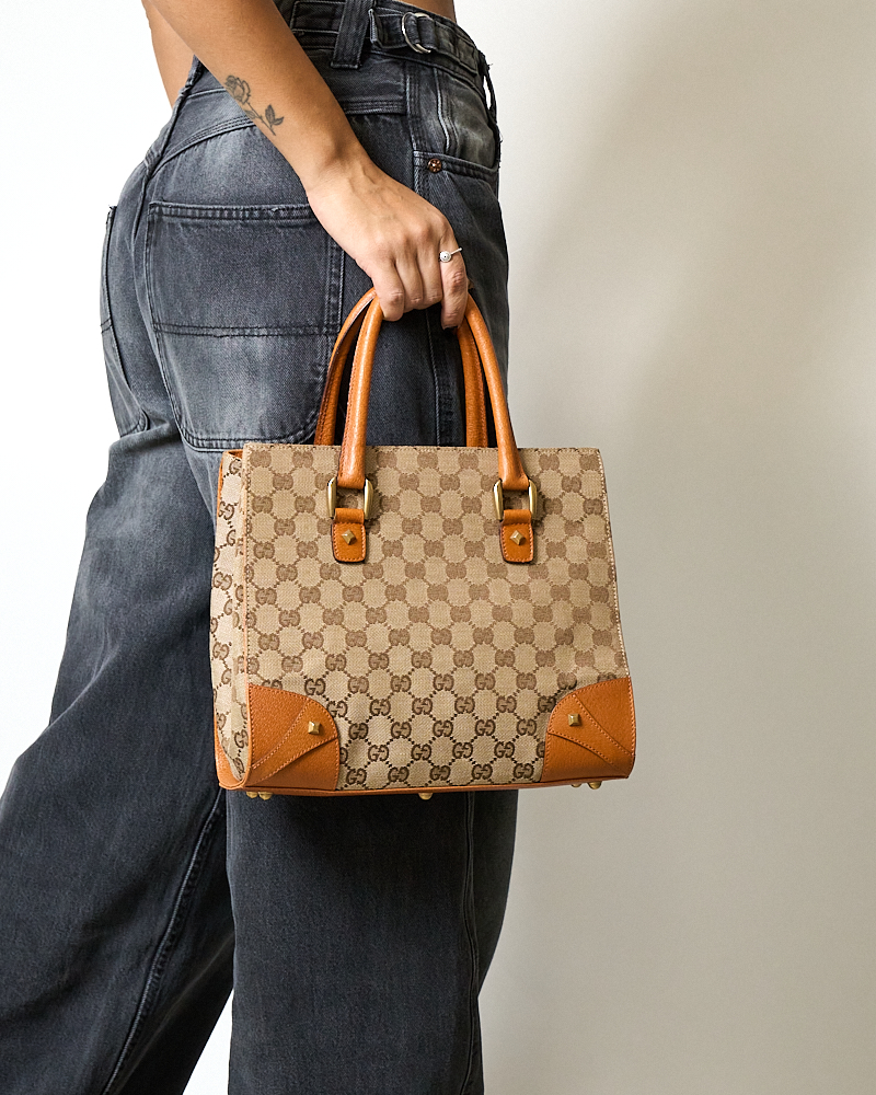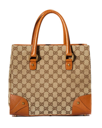 Borsa firmata Gucci, modello Tote Nailhead nella misura small, realizzata in tela nella classica fantasia GG Supreme con inserti in pelle arancione e hardware dorato. Non è dotata di nessuna chiusura, internamente rivestita in tela marrone con comode tasche, la borsa è abbastanza capiente. Munita di doppio manico in pelle, per una comoda portata a mano. L’articolo si presenta in ottime condizioni.