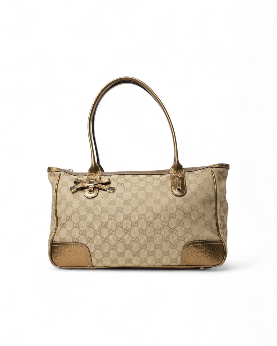 Borsa firmata Gucci, modello Tote Princy nella misura medium, realizzata in tela nella classica fantasia GG Supreme con inserti in pelle oro e hardware dorato. Dotata di una chiusura superiore a zip, internamente rivestita in tela logata con due comode tasche, la borsa è abbastanza capiente. Munita di doppio manico in pelle, per una comoda portata a mano o a spalla. L’articolo si presenta in buone condizioni, con piccoli segni di usura visibili in foto.