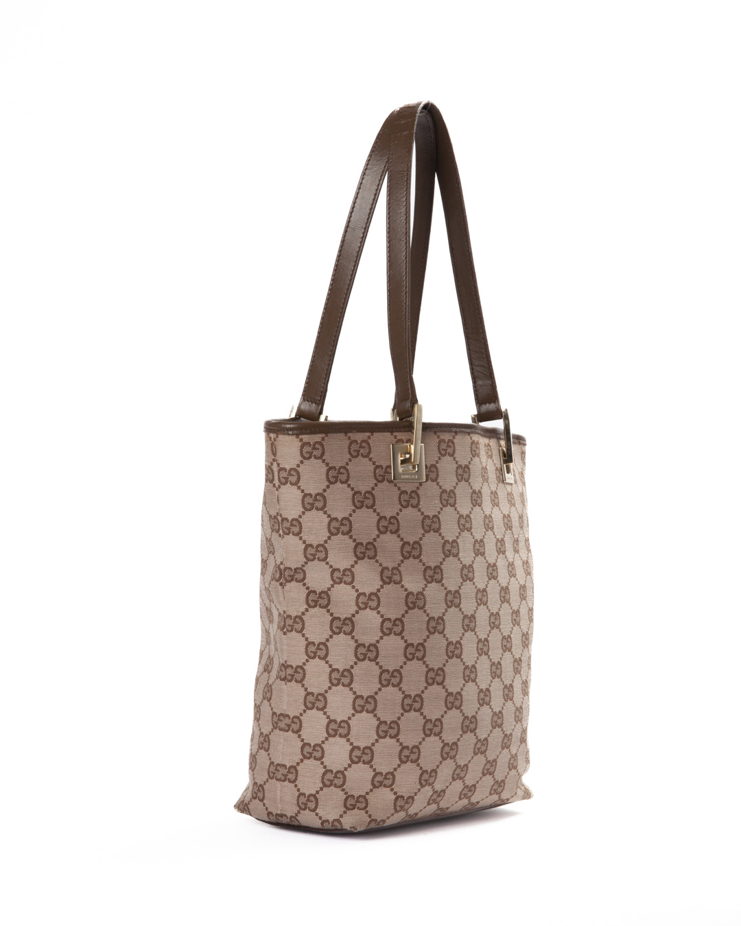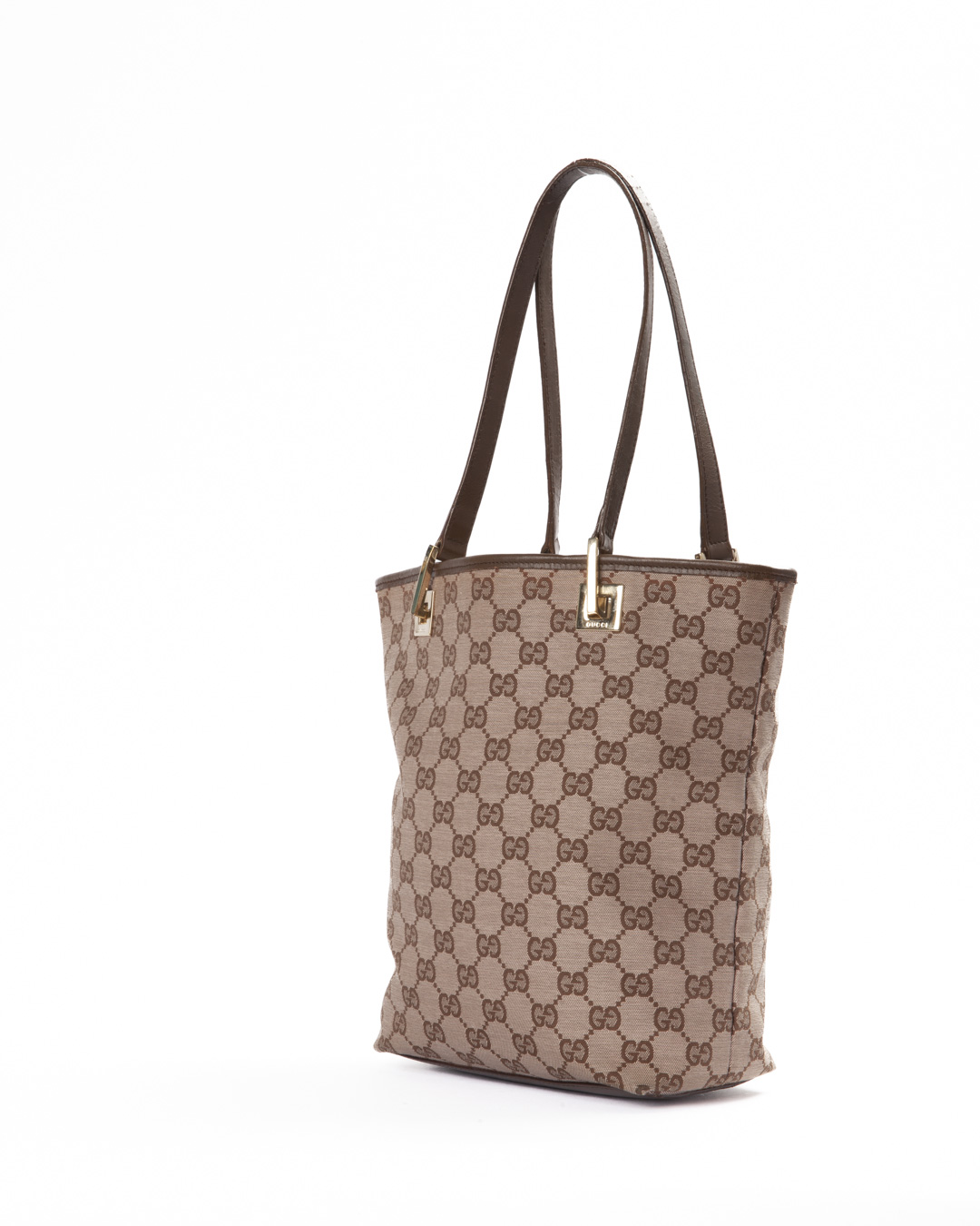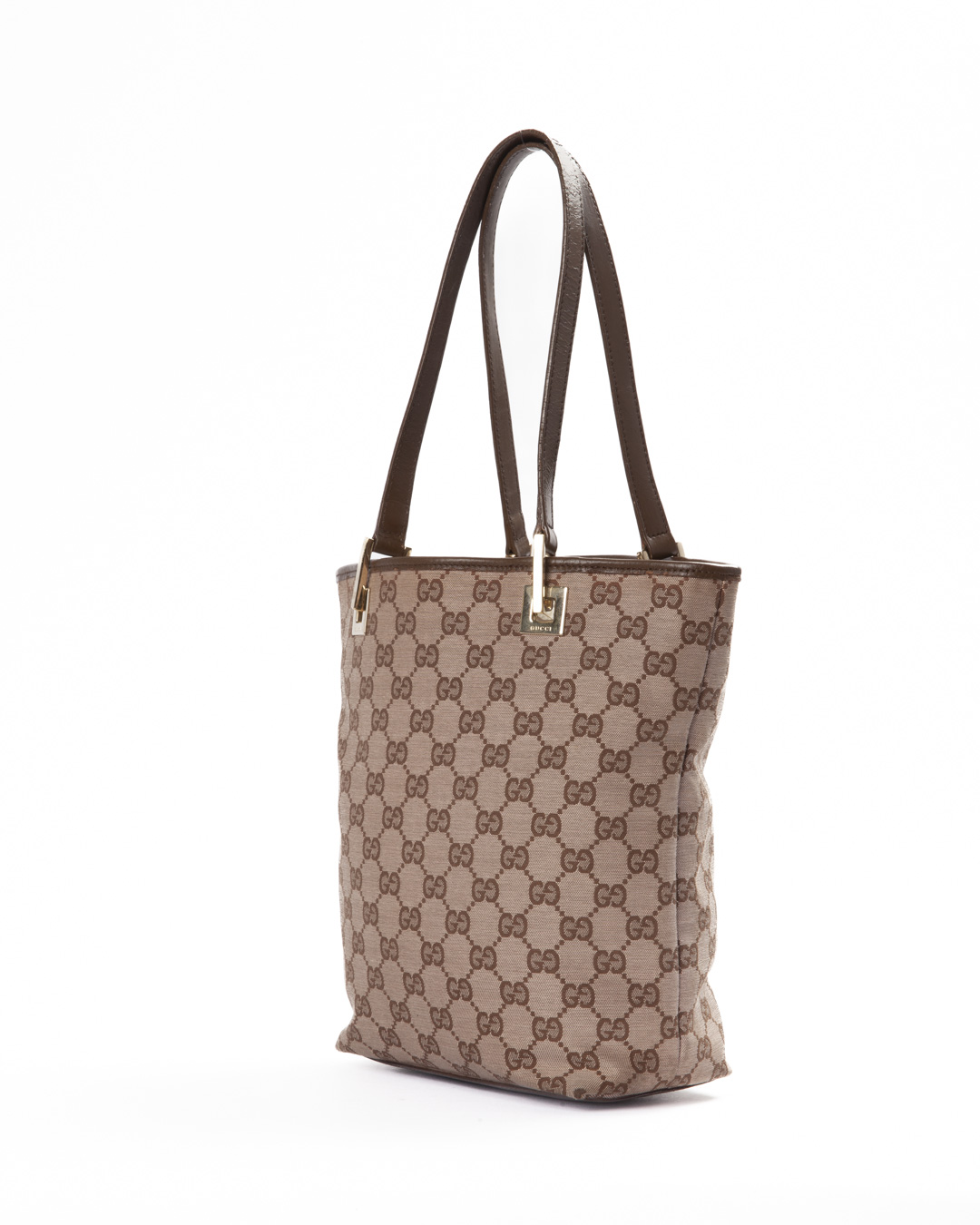 Borsa firmata Gucci, modello Tote Vertical nella misura small, realizzata in tessuto nella classica fantasia GG Supreme con inserti in pelle marrone e hardware dorato. Non è dotata di nessuna chiusura superiore, internamente rivestita in tessuto marrone con comoda tasca, la borsa è abbastanza capiente. Munita di doppio manico in pelle, per una comoda portata a mano o a spalla. L’articolo si presenta in buone condizioni.