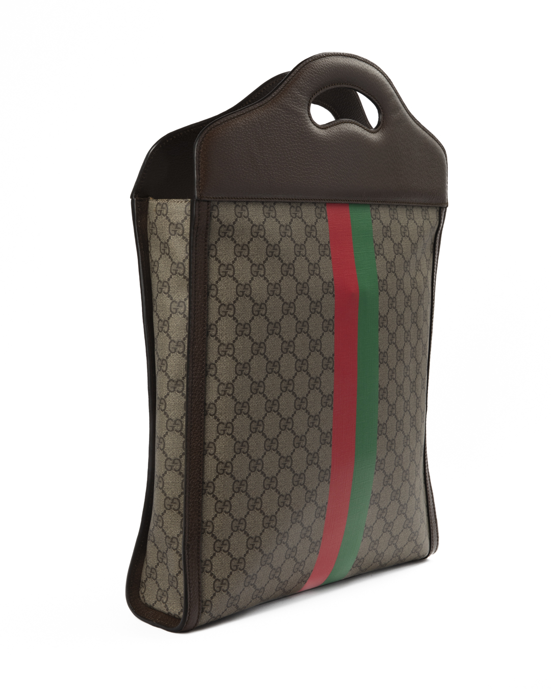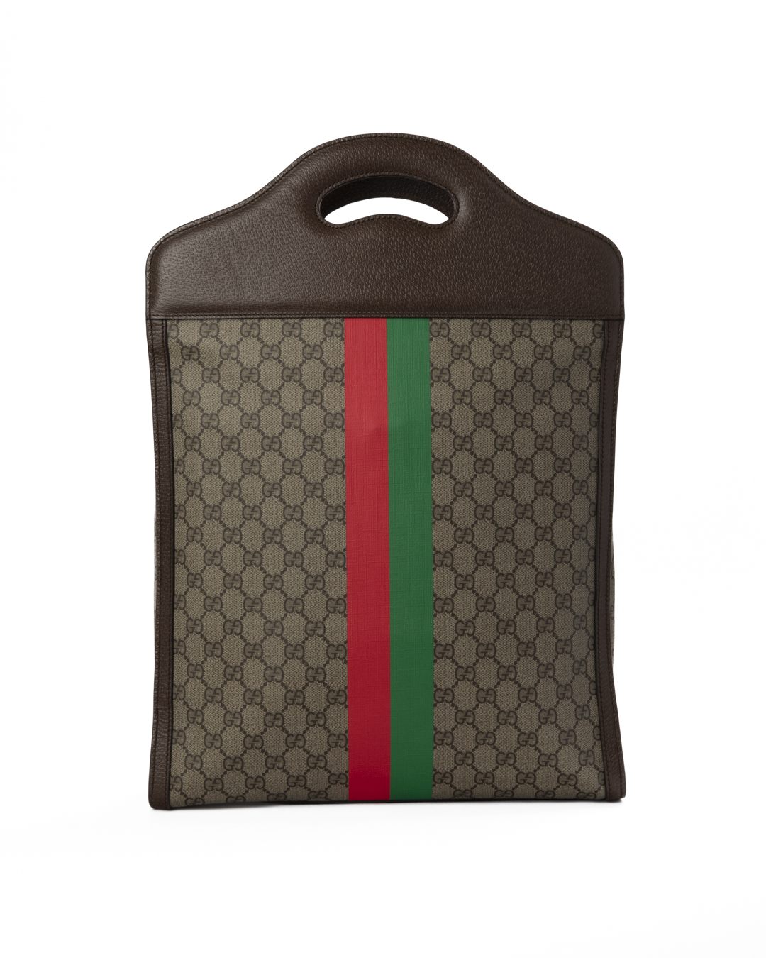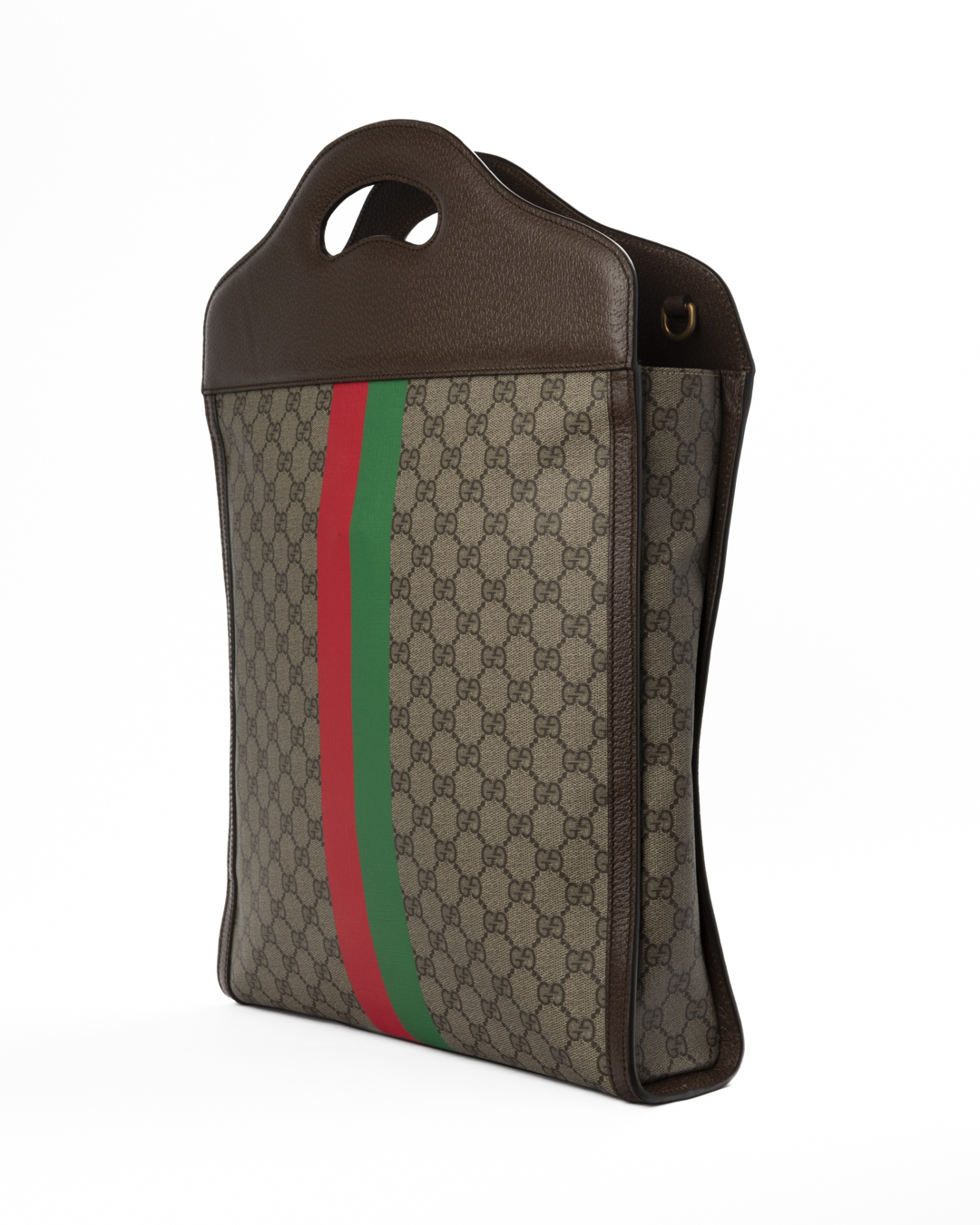 Borsa firmata Gucci, modello Tote Vertical nella misura medium, realizzata in tela nella fantasia GG Supreme con inserti in pelle marrone con hardware dorato. Non è dotata di nessuna chiusura, internamente rivestita in tela beige con comoda tasca, la borsa è abbastanza capiente. Munita di doppio manico e di una tracolla rimovibile e regolabile, per una comoda portata a mano o a spalla. L'articolo si presenta in ottime condizioni.