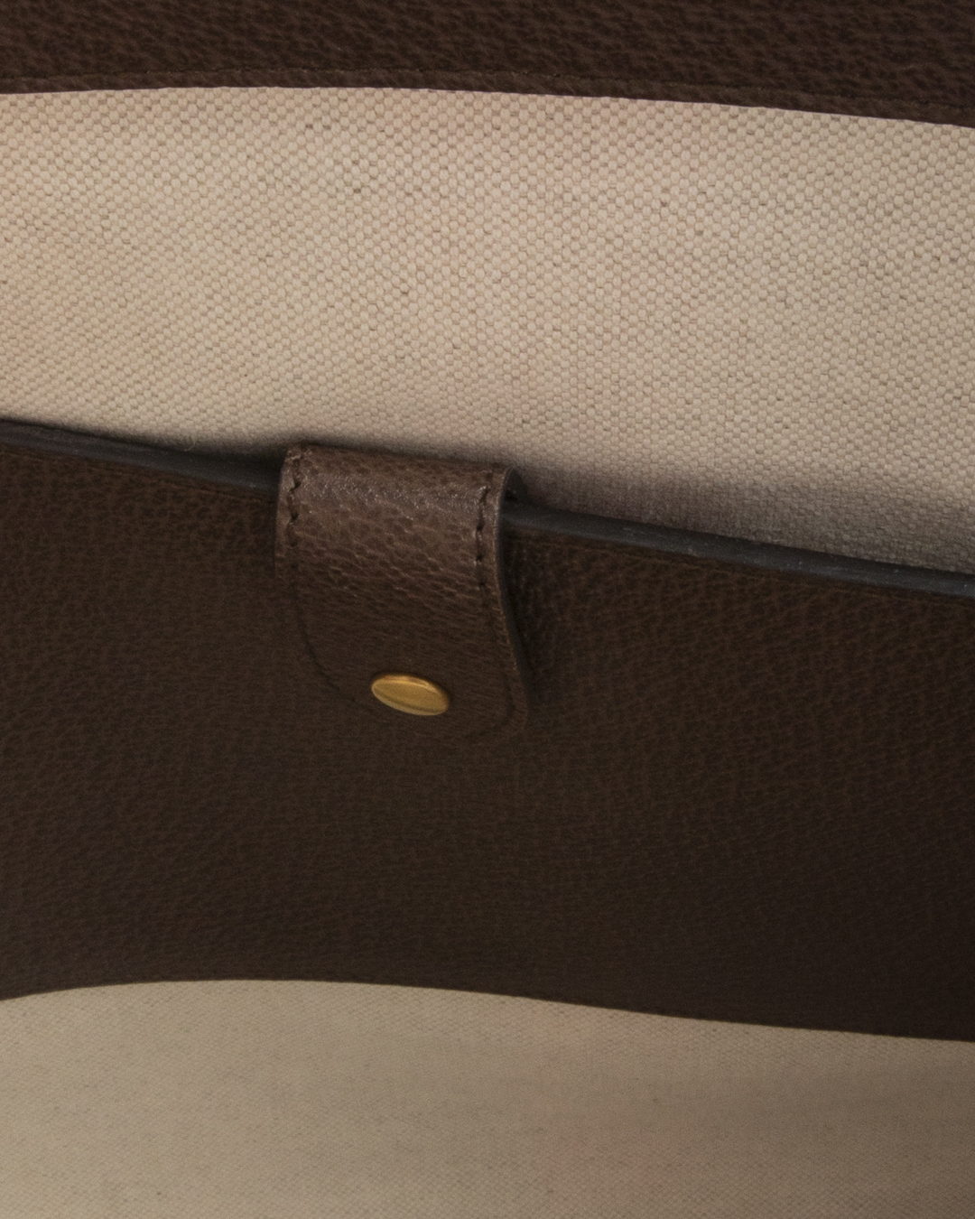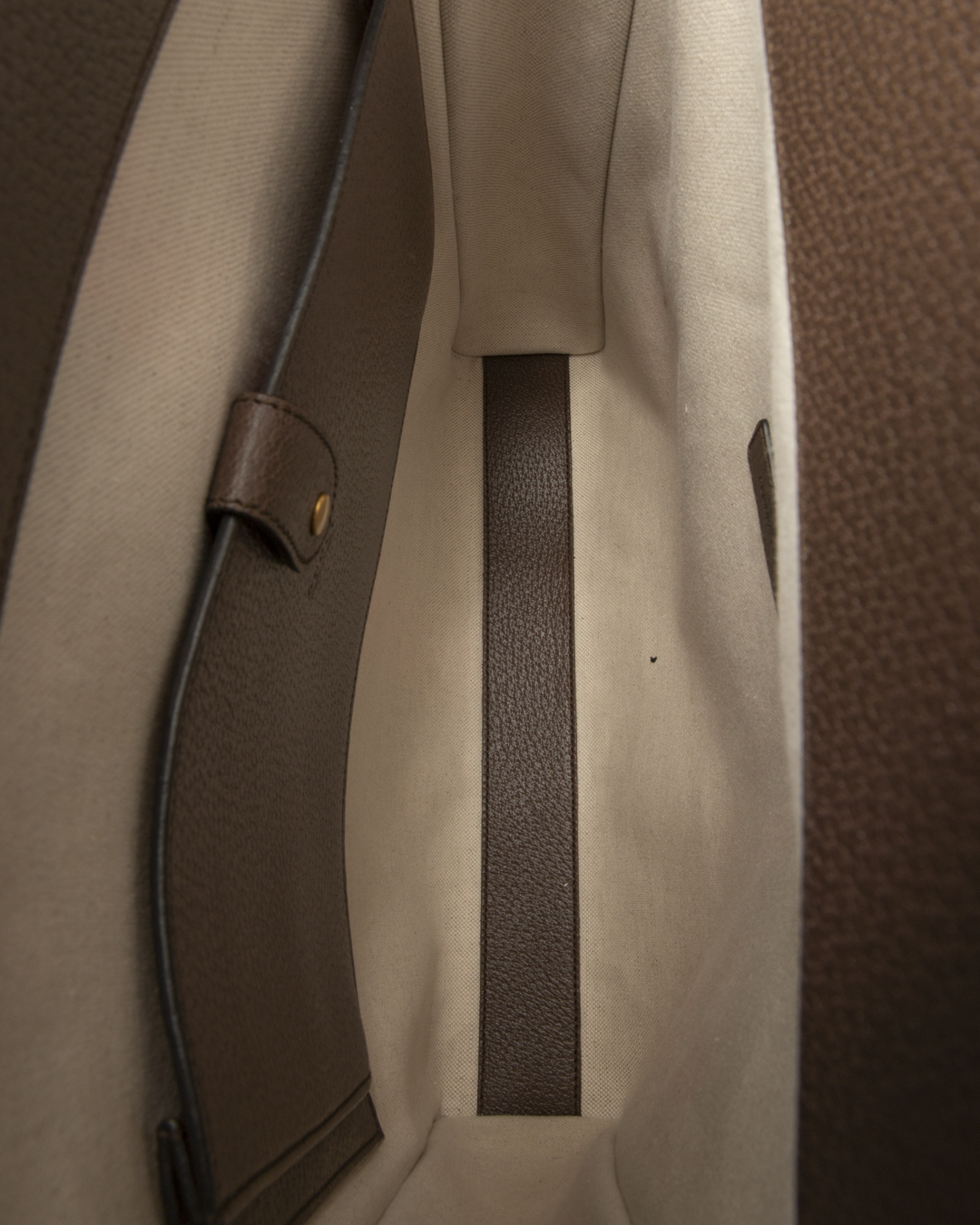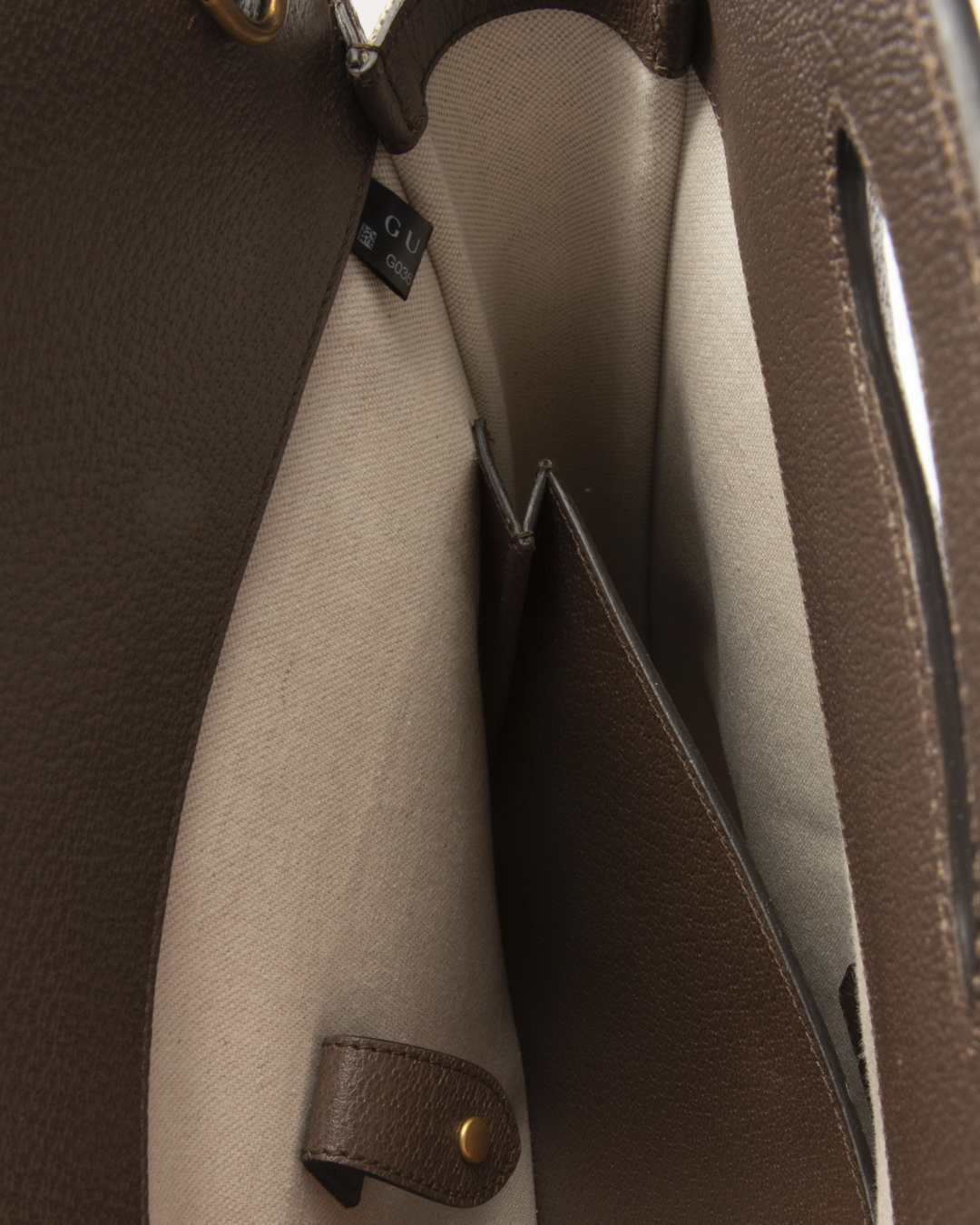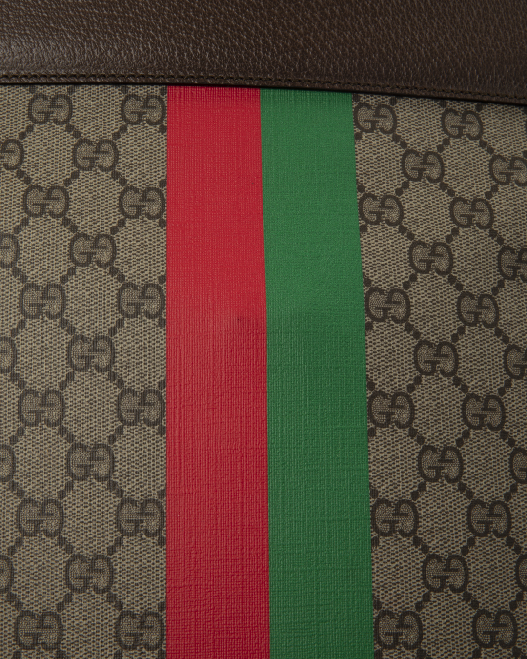 Borsa firmata Gucci, modello Tote Vertical nella misura medium, realizzata in tela nella fantasia GG Supreme con inserti in pelle marrone con hardware dorato. Non è dotata di nessuna chiusura, internamente rivestita in tela beige con comoda tasca, la borsa è abbastanza capiente. Munita di doppio manico e di una tracolla rimovibile e regolabile, per una comoda portata a mano o a spalla. L'articolo si presenta in ottime condizioni.