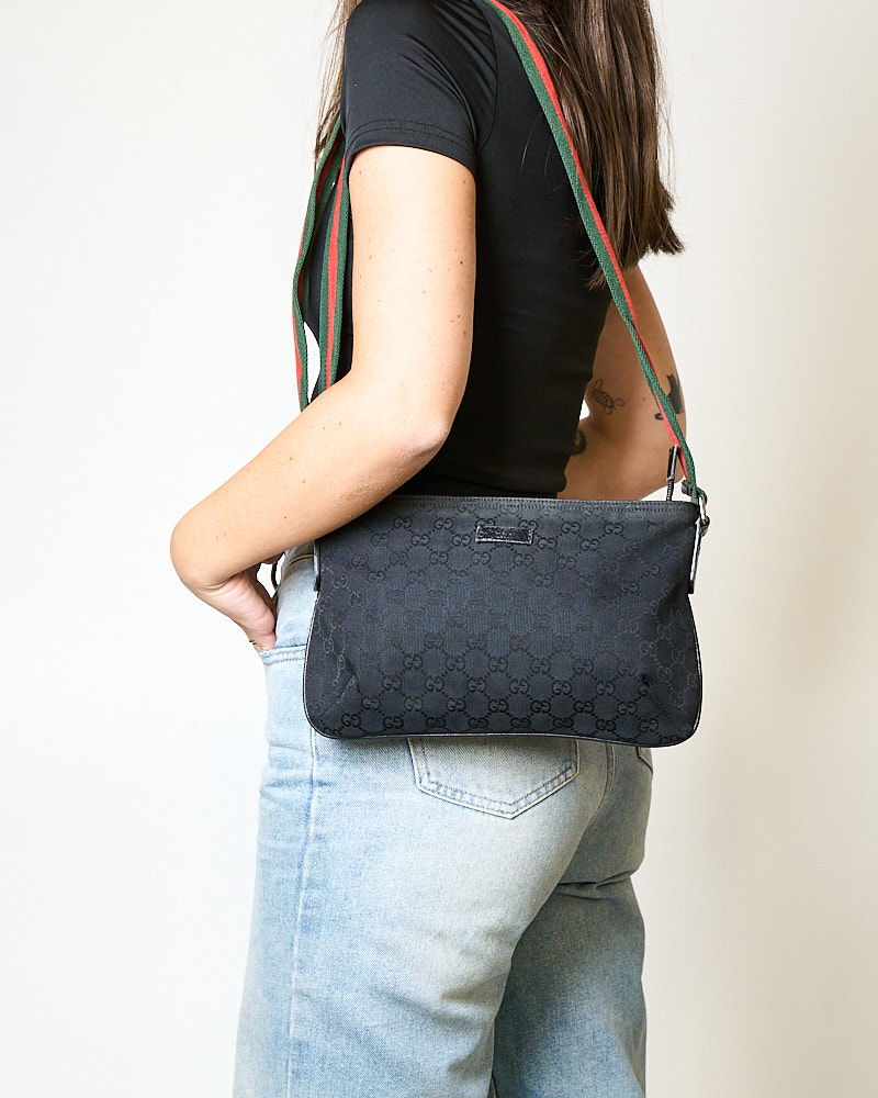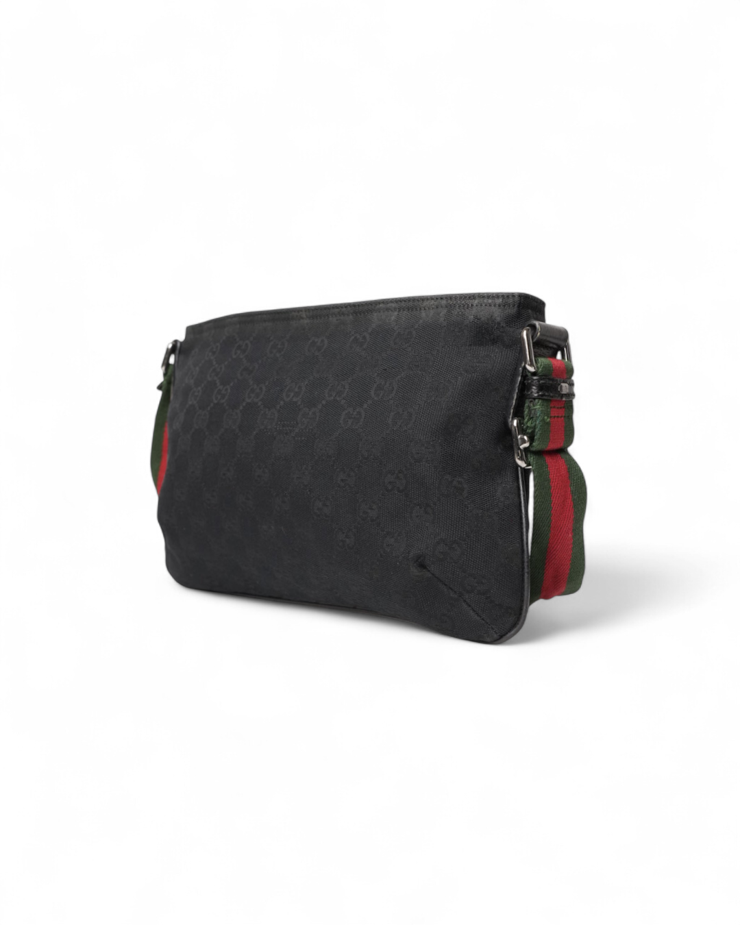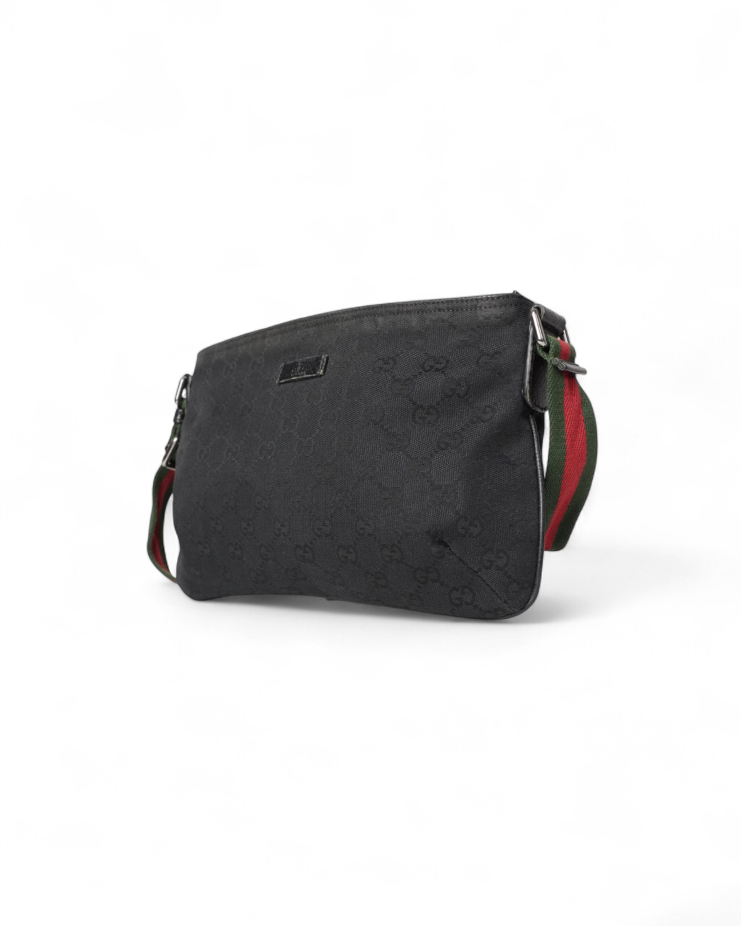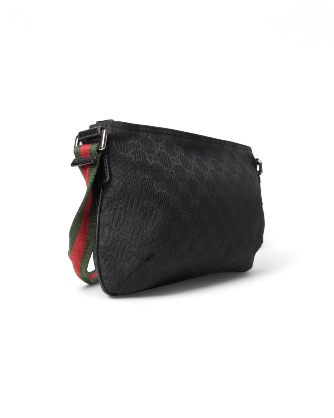Borsa firmata Gucci, realizzata in tela nella classica fantasia GG Supreme nera con inserti in tessuto nella classica fascia web e hardware argento. Dotata di una chiusura superiore a zip, internamente rivestita in tela tono su tono con due comode tasche, la borsa è abbastanza capiente. Munita di una tracolla regolabile, per una comoda portata a spalla o a tracolla. L’articolo si presenta in buone condizioni.