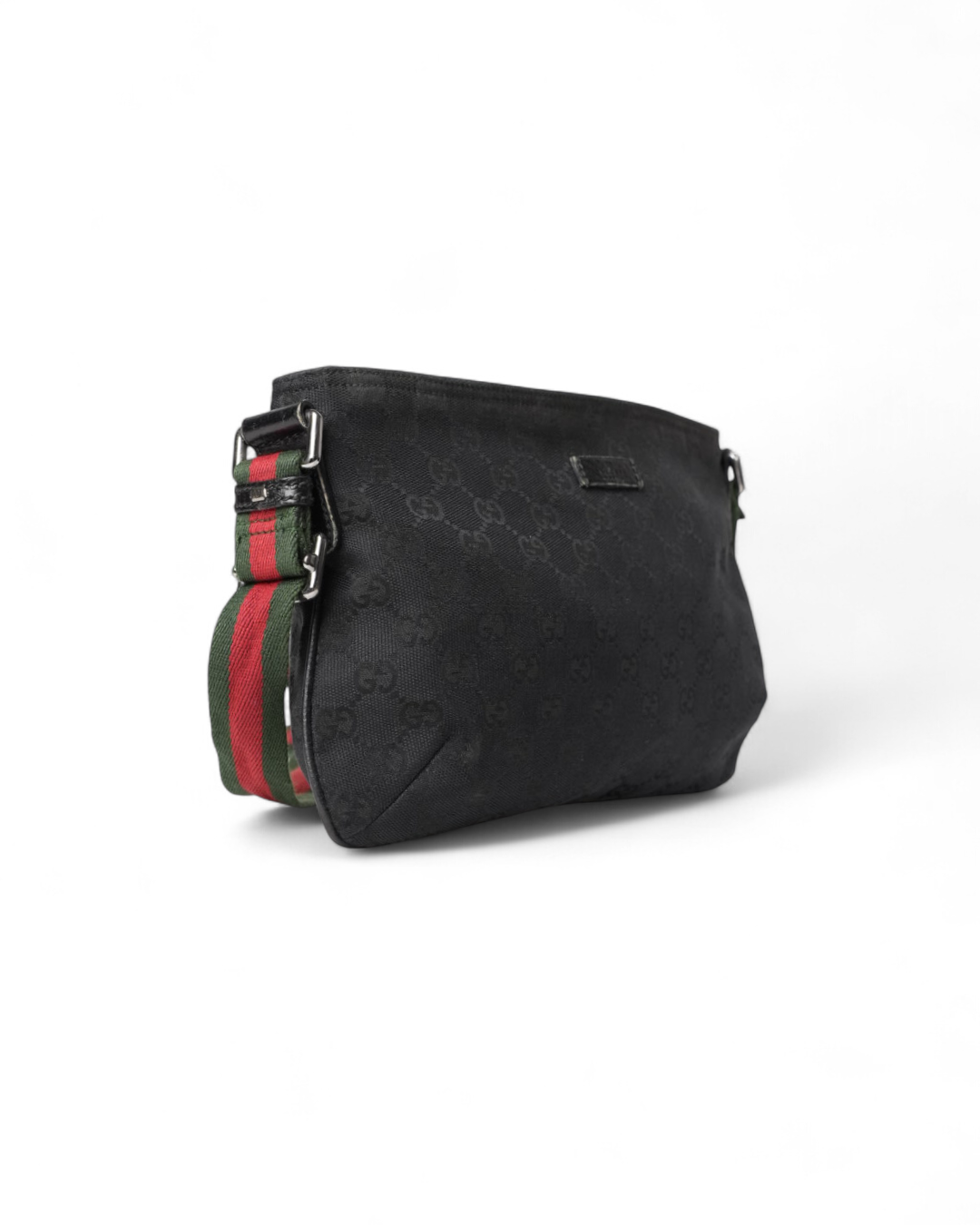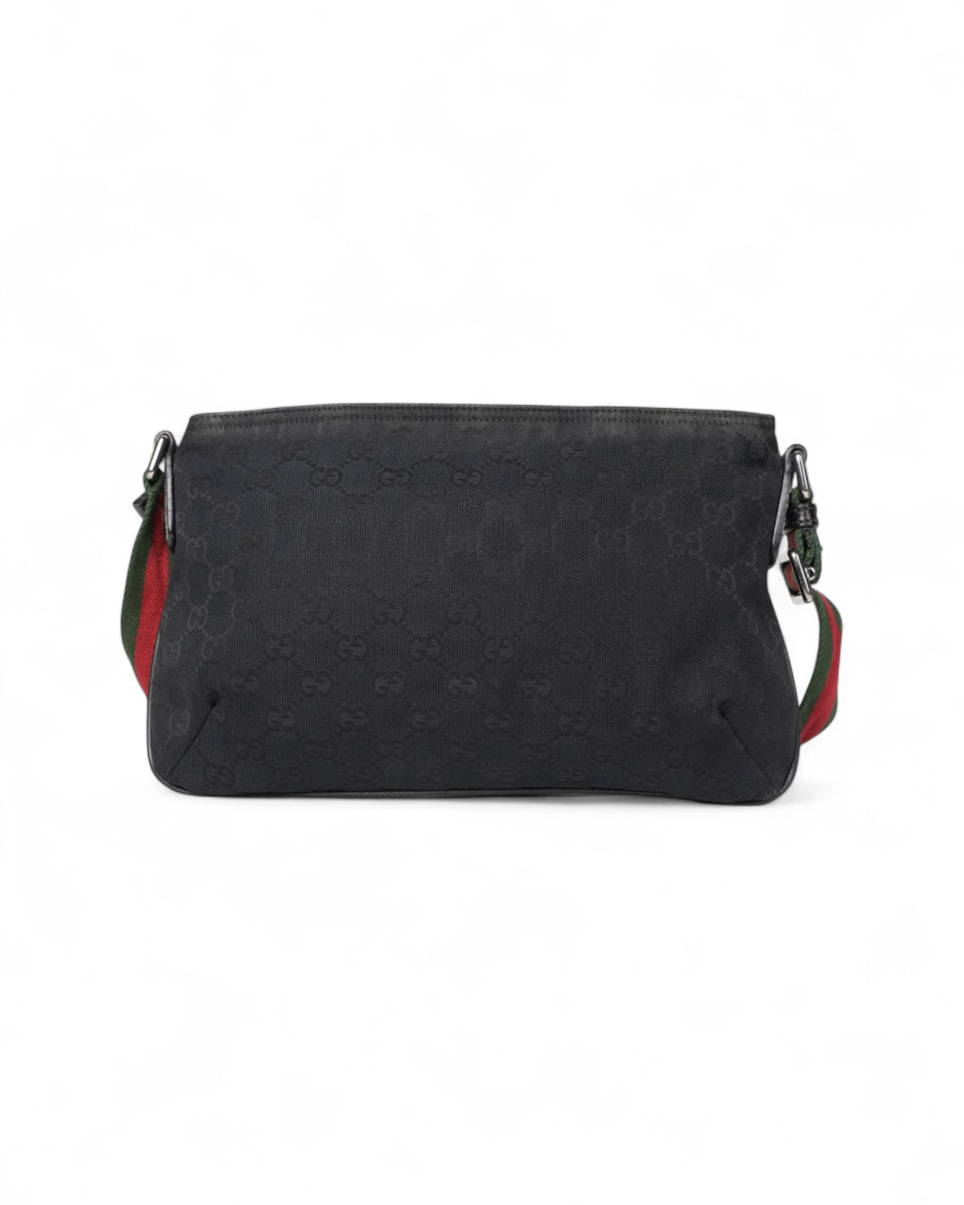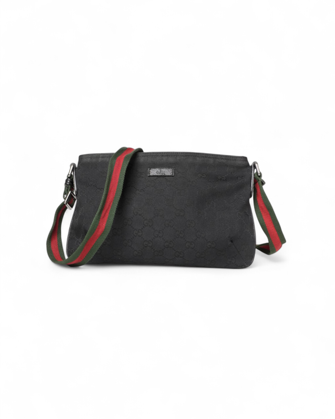 Borsa firmata Gucci, realizzata in tela nella classica fantasia GG Supreme nera con inserti in tessuto nella classica fascia web e hardware argento. Dotata di una chiusura superiore a zip, internamente rivestita in tela tono su tono con due comode tasche, la borsa è abbastanza capiente. Munita di una tracolla regolabile, per una comoda portata a spalla o a tracolla. L’articolo si presenta in buone condizioni.