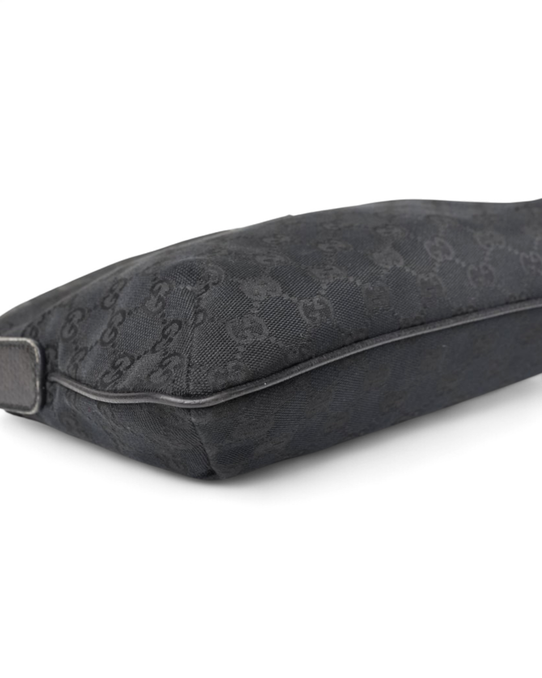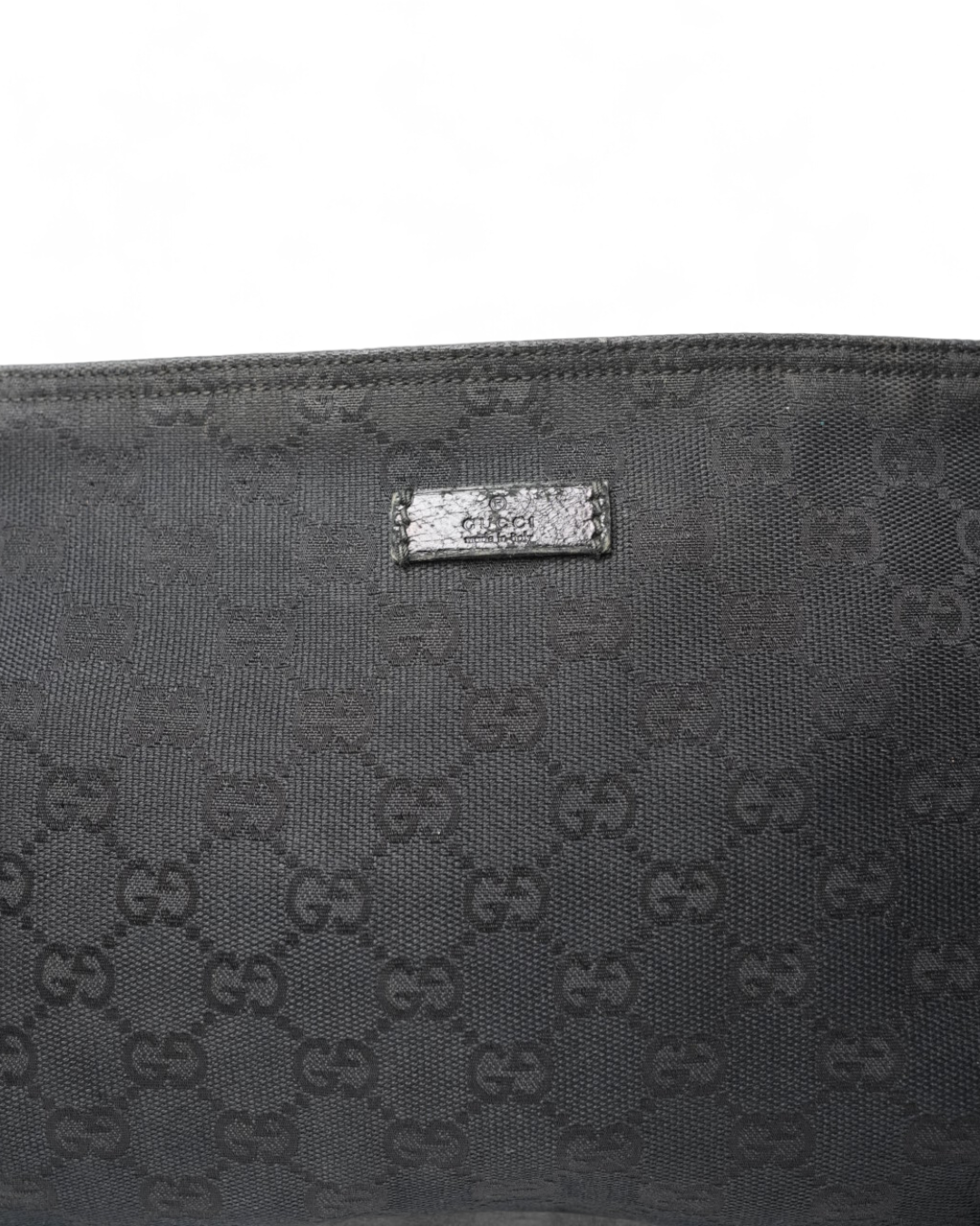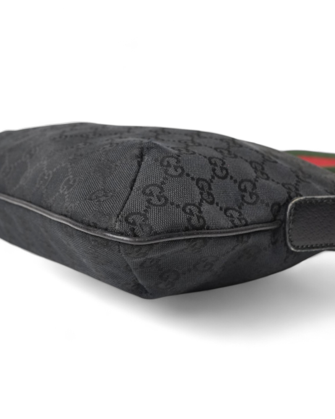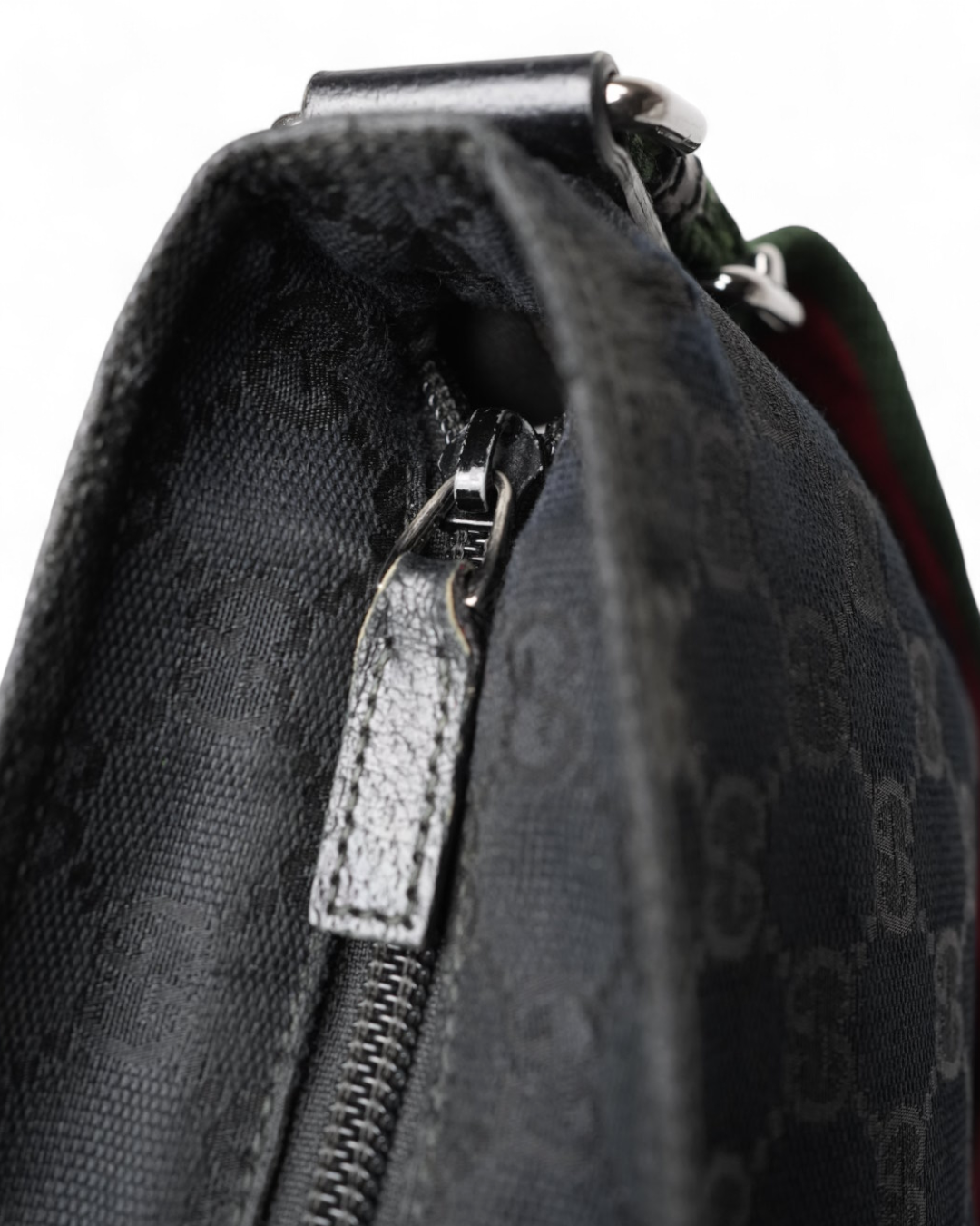 Borsa firmata Gucci, realizzata in tela nella classica fantasia GG Supreme nera con inserti in tessuto nella classica fascia web e hardware argento. Dotata di una chiusura superiore a zip, internamente rivestita in tela tono su tono con due comode tasche, la borsa è abbastanza capiente. Munita di una tracolla regolabile, per una comoda portata a spalla o a tracolla. L’articolo si presenta in buone condizioni.
