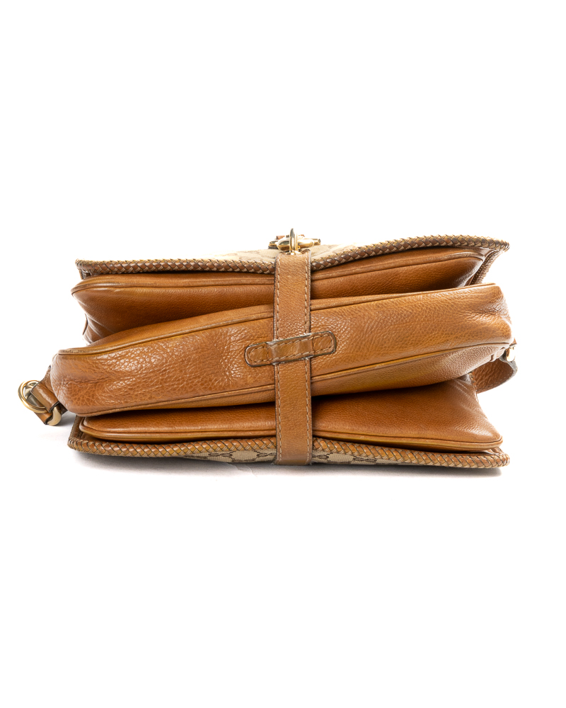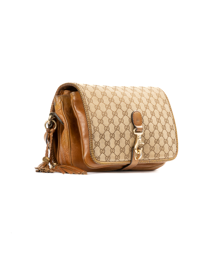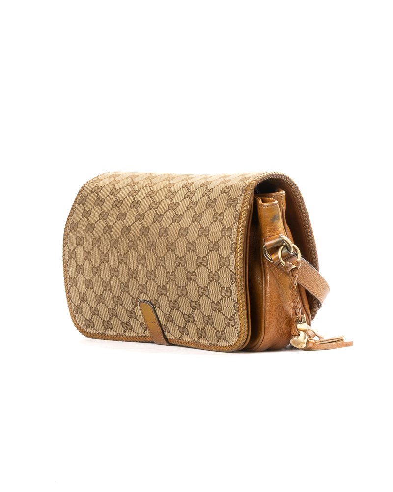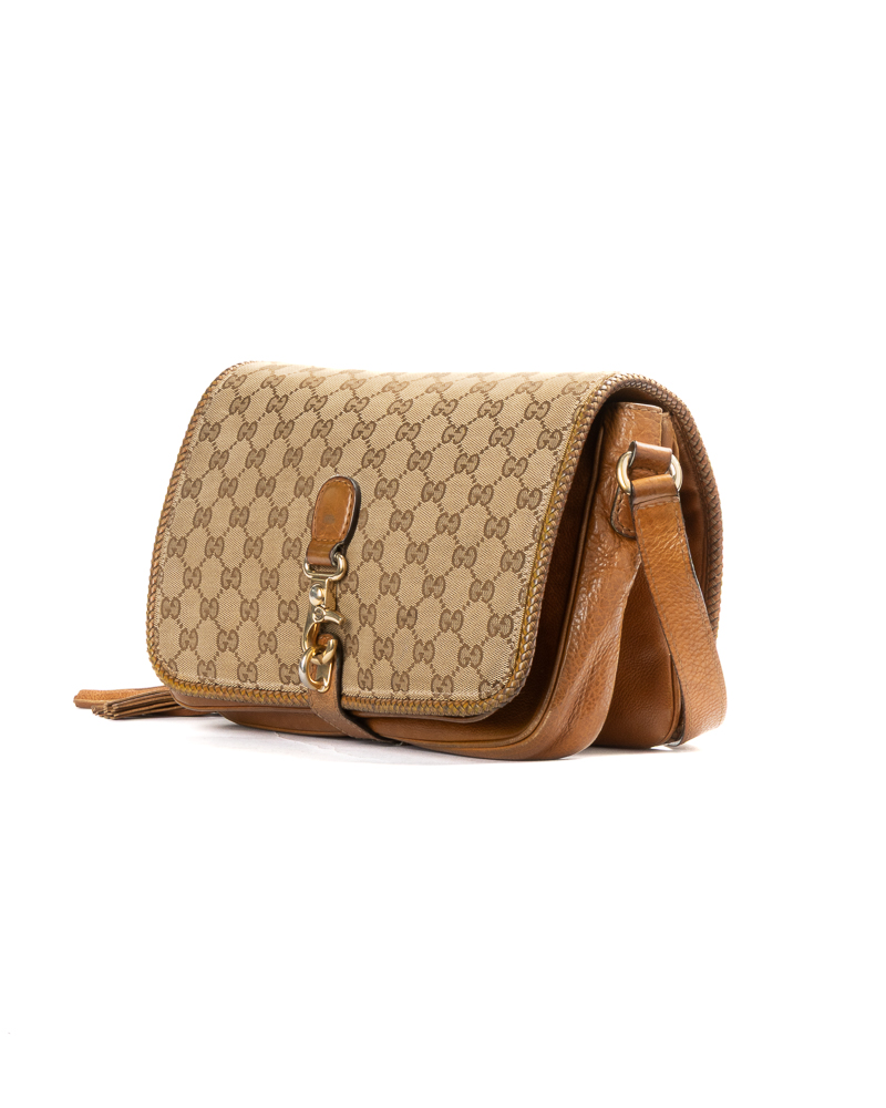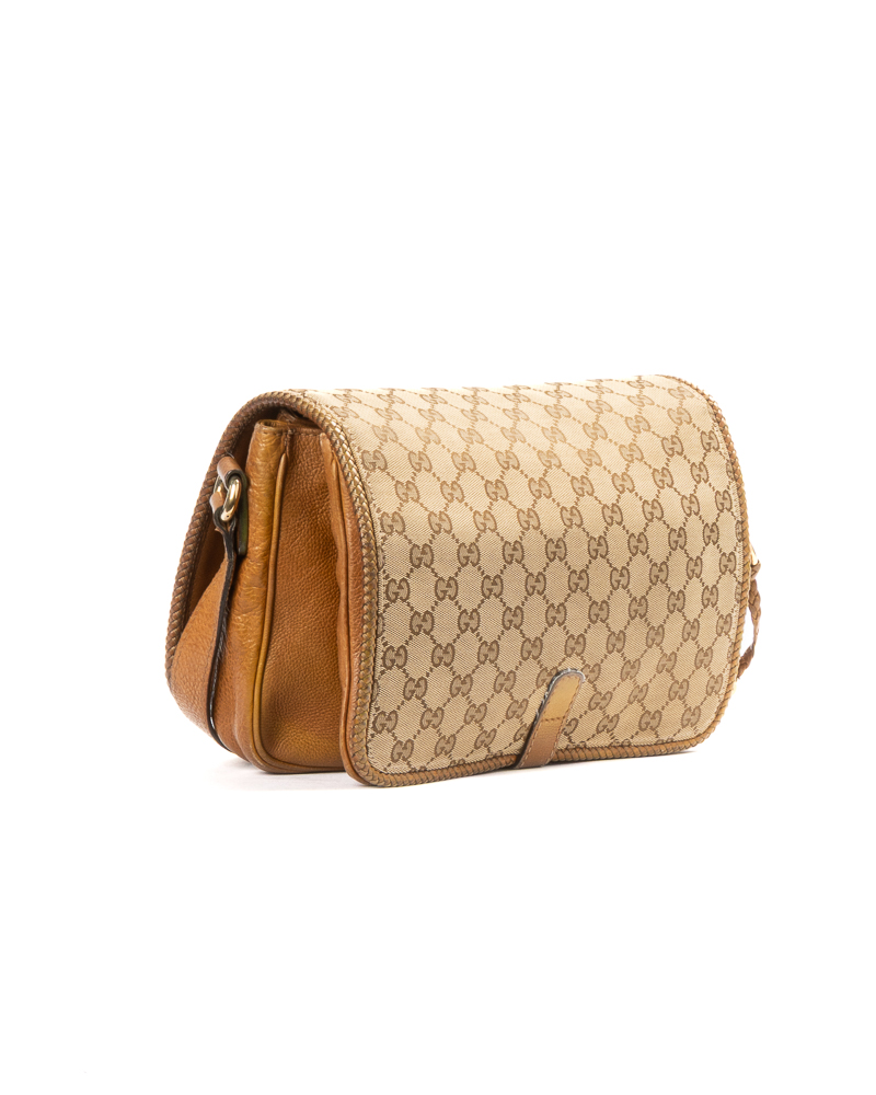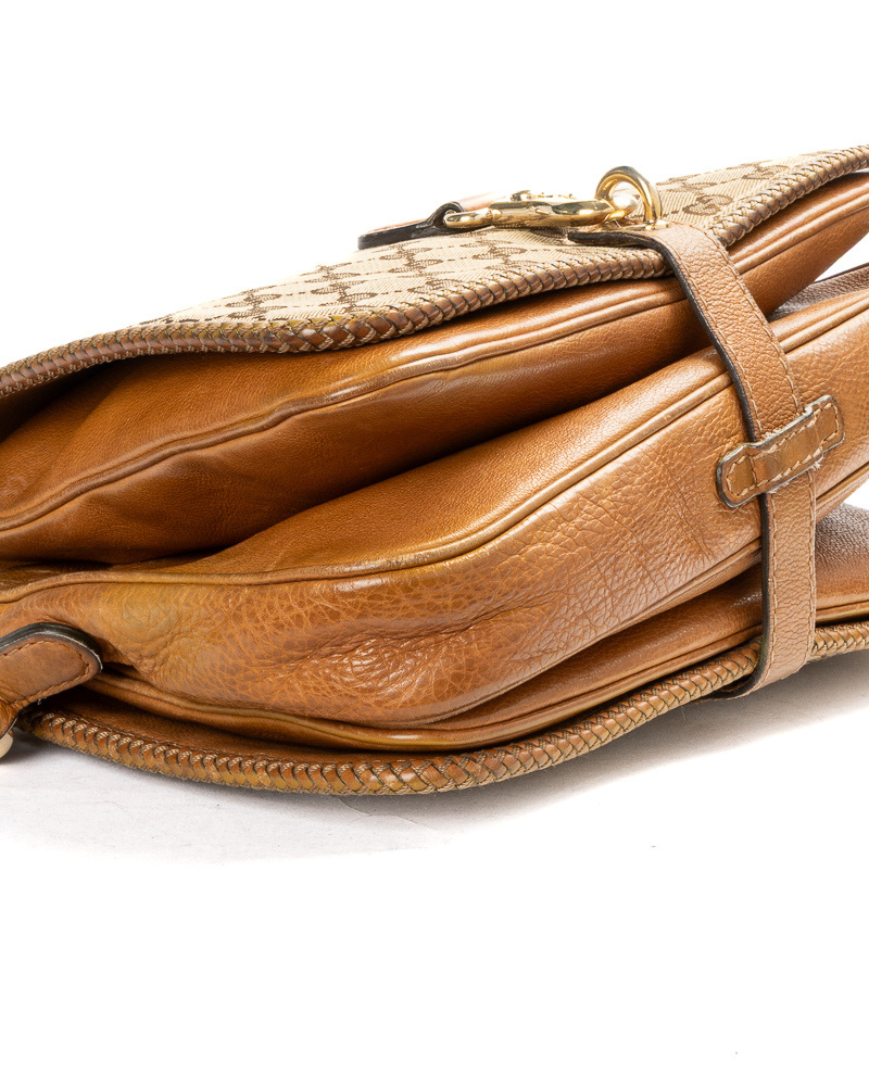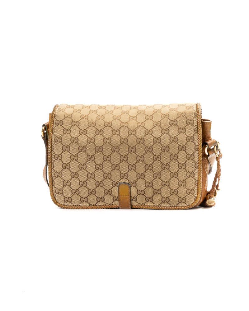 Borsa firmata Gucci, linea Vintage, realizzata in tela nella fantasia GG Supreme con inserti in pelle marrone e hardware dorato. Dotata di una patta con chiusura a gancio, internamente rivestita in tela beige con comodi scompartimenti e tasche, la borsa è abbastanza capiente. Munita di una tracolla, per una comoda portata a spalla o a tracolla. L'articolo si presenta in buone condizioni, con segni di usura visibili in foto.