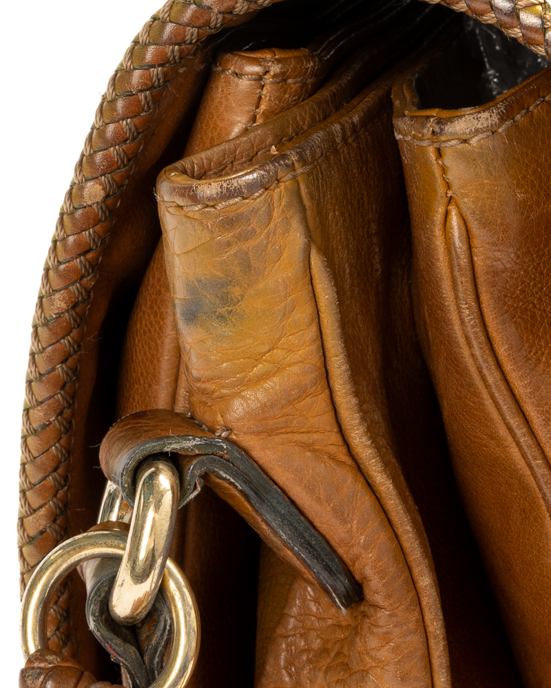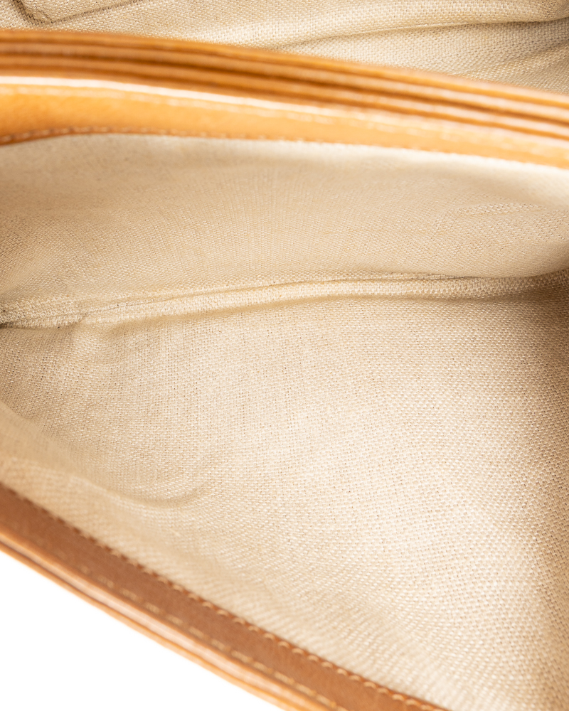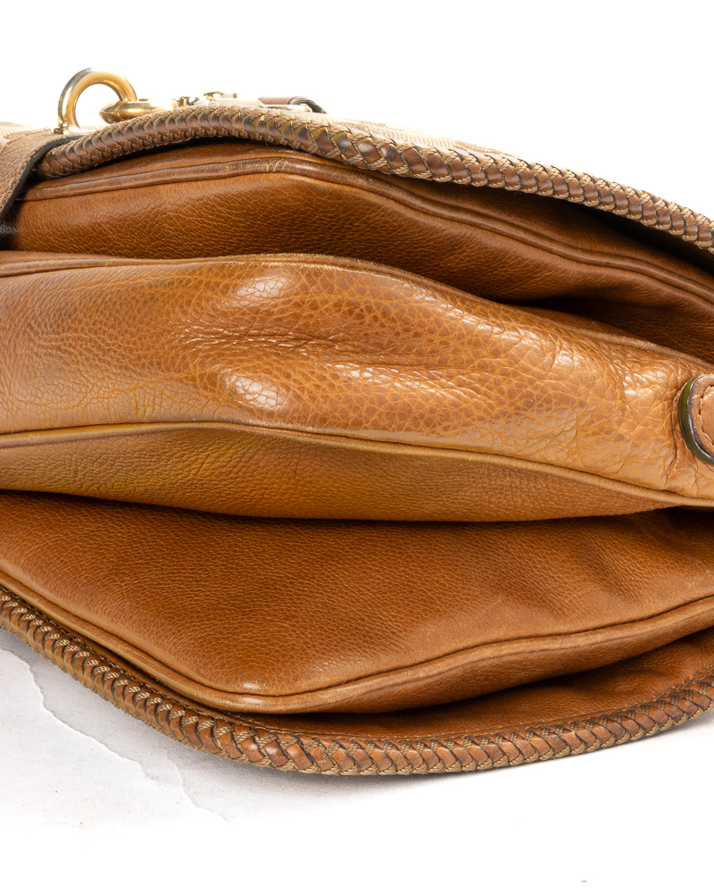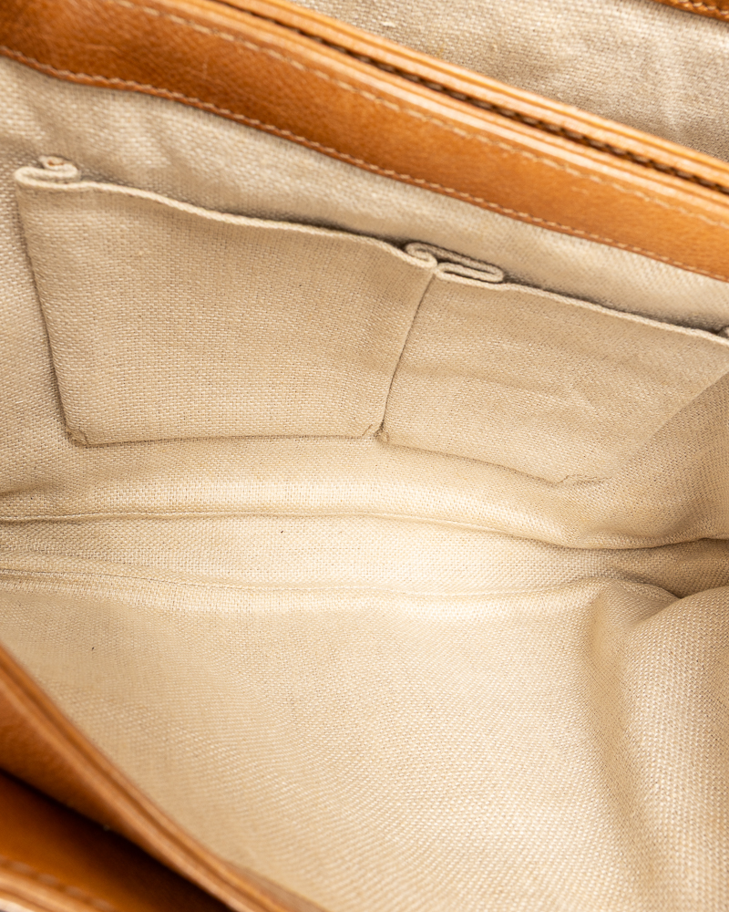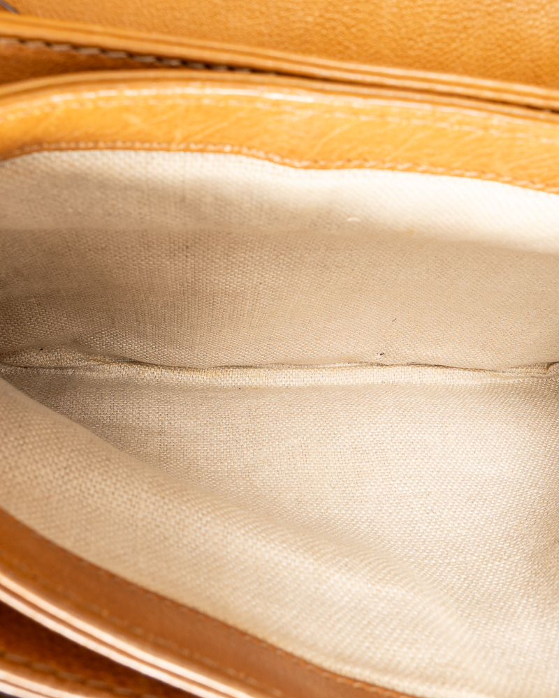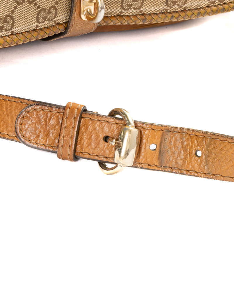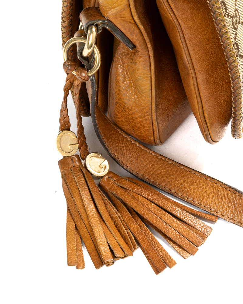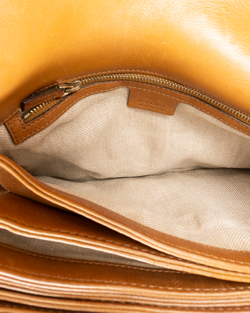 Borsa firmata Gucci, linea Vintage, realizzata in tela nella fantasia GG Supreme con inserti in pelle marrone e hardware dorato. Dotata di una patta con chiusura a gancio, internamente rivestita in tela beige con comodi scompartimenti e tasche, la borsa è abbastanza capiente. Munita di una tracolla, per una comoda portata a spalla o a tracolla. L'articolo si presenta in buone condizioni, con segni di usura visibili in foto.