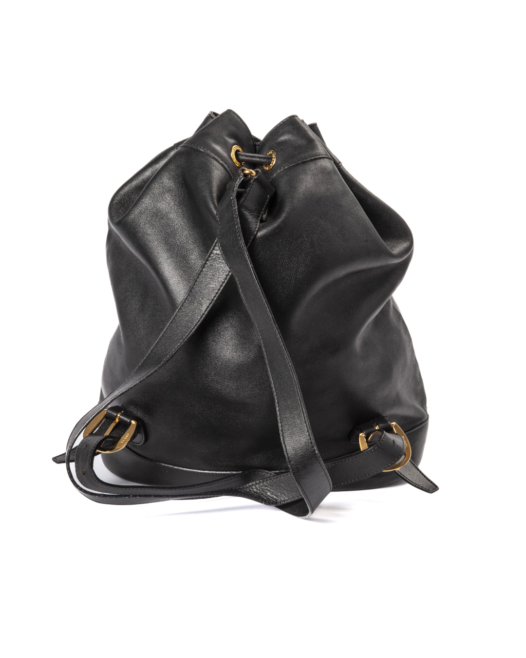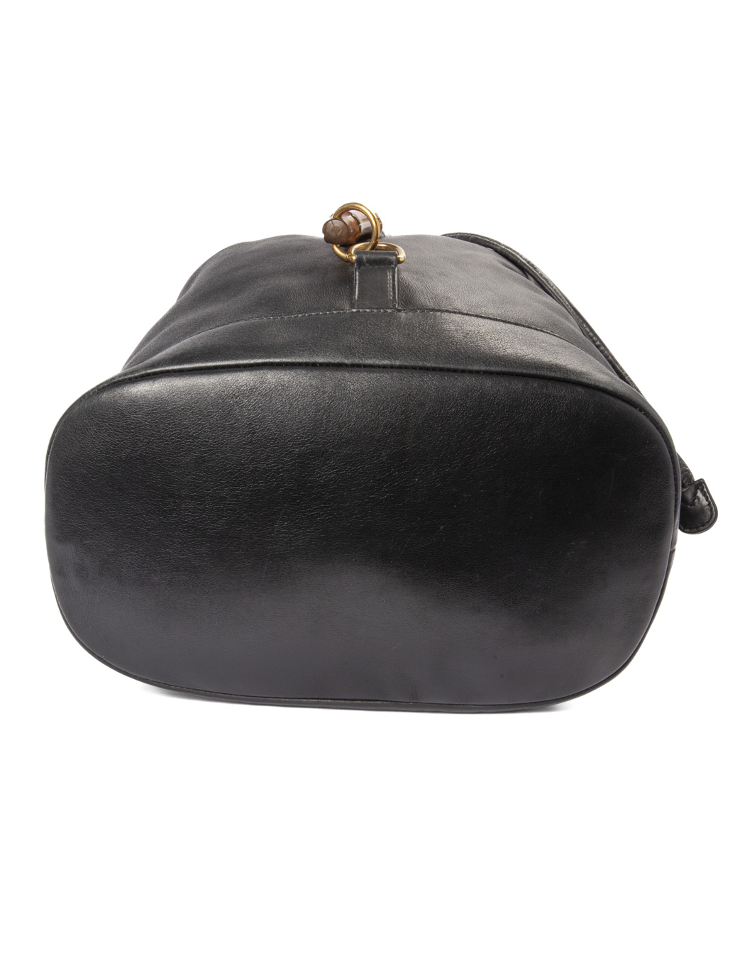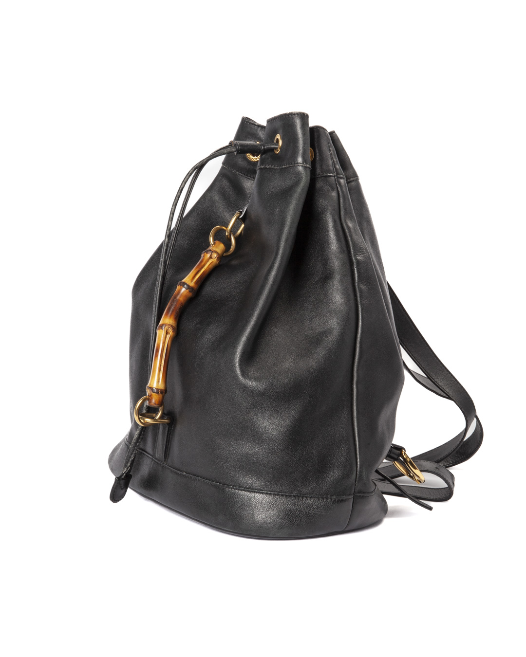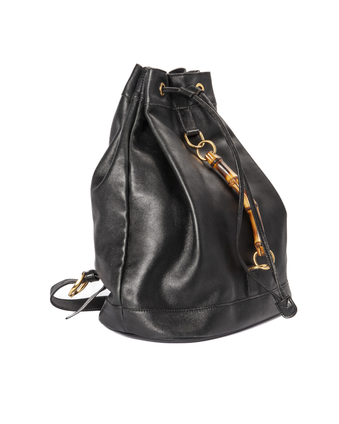 Zaino firmato Gucci, linea Bamboo Vintage, realizzata in pelle liscia nera con hardware dorato. Dotata di una chiusura superiore a coulisse, internamente rivestita in tessuto scamosciato nero con comoda tasca, lo zaino è abbastanza capiente. Munito di due spallaci regolabili in pelle, per una comoda portata a spalla o a mano. L’articolo si presenta in buone condizioni, con segni di usura visibili in foto.